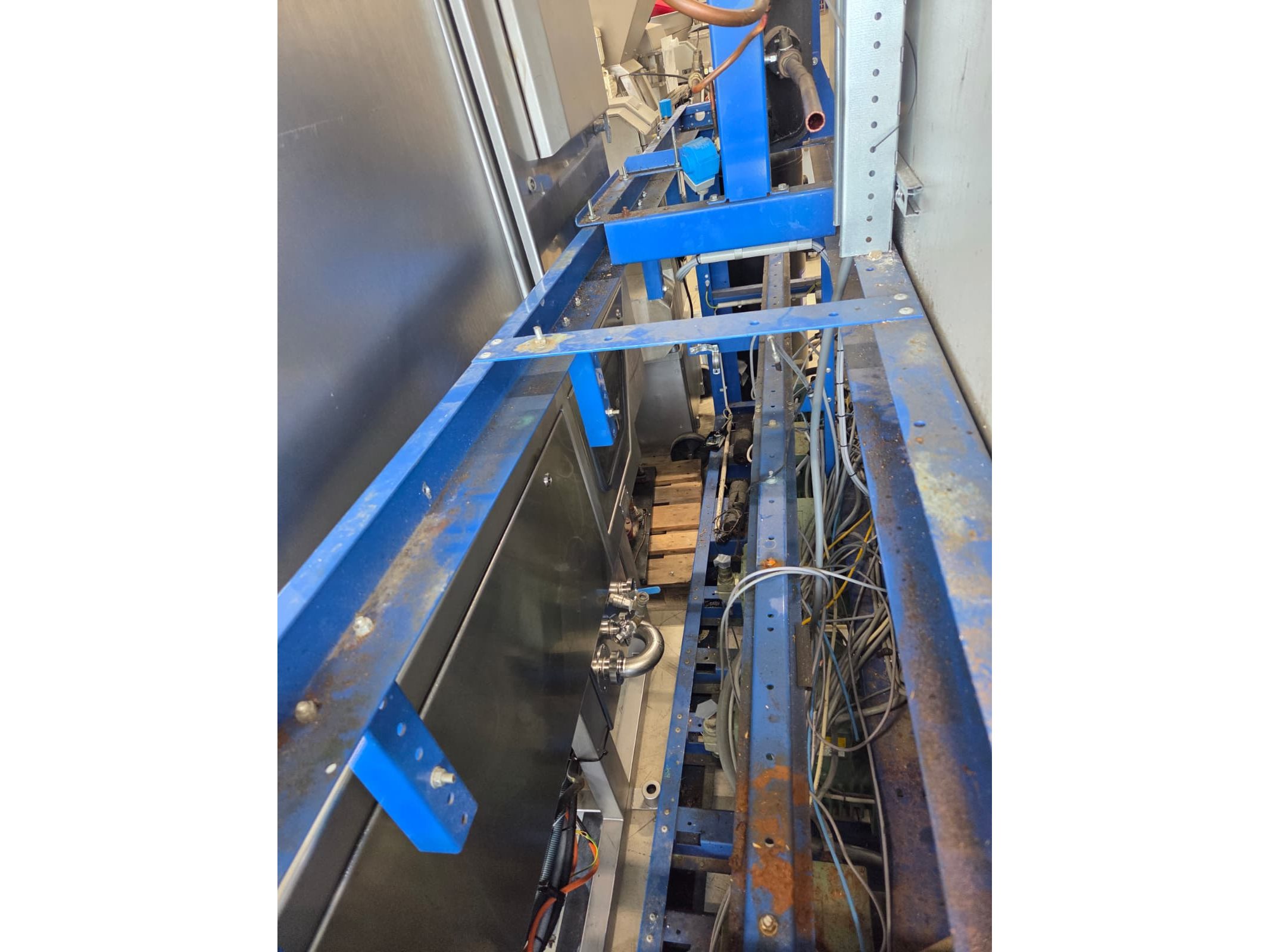 Profoid compressor rack with 5 Bitzer Kühlmaschinenbau GmbH cooling compressors, type: (2x) 4CES-6Y-40S, capacity: 32.5-39.2 m³ per hour and (3x) 4PCS-10.2Y-40P, capacity: 48.5/58.5 m³ per hour, refrigerant: R448A, 200 kg, dimensions: 2750 mm x 900 mm x 1950 mm. With vertical liquid receiver, dimensions: 580 mm x 480 mm x 1580 mm. Technical condition unknown. Copper pipings between compressors already been removed.