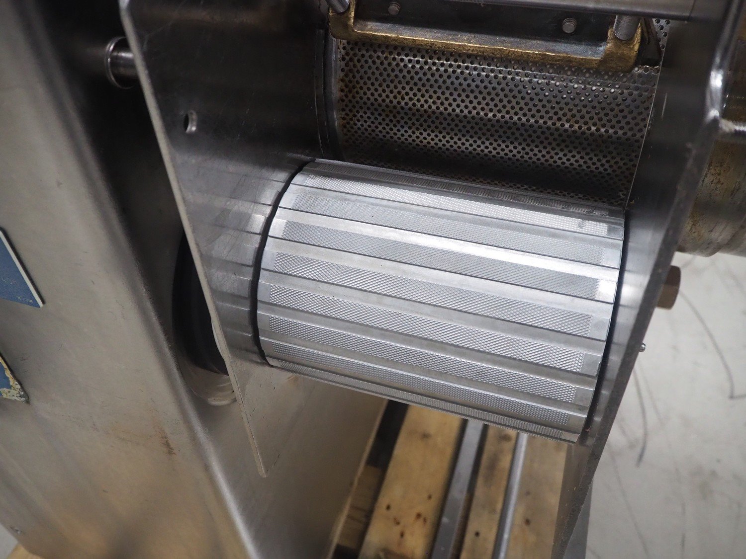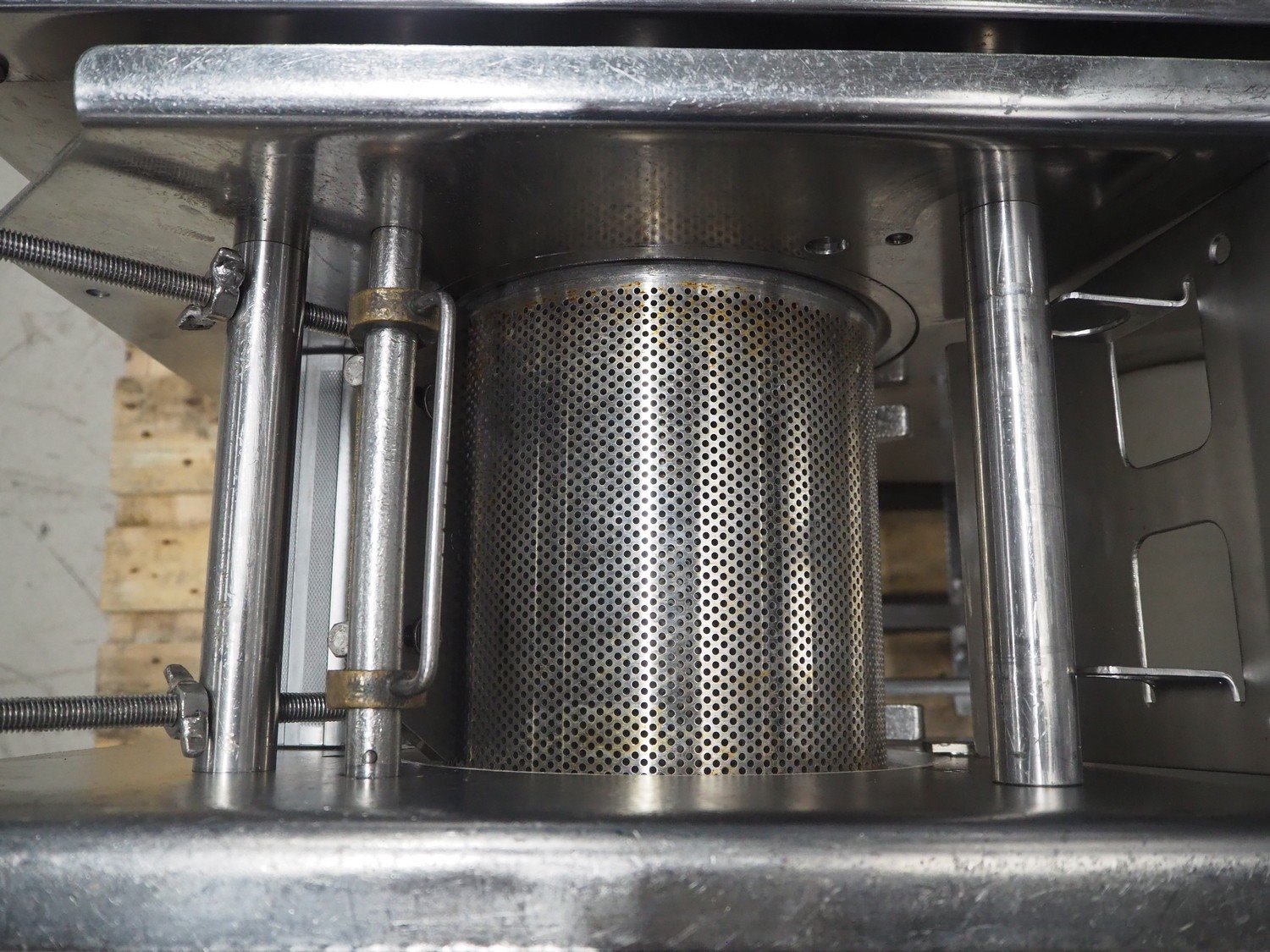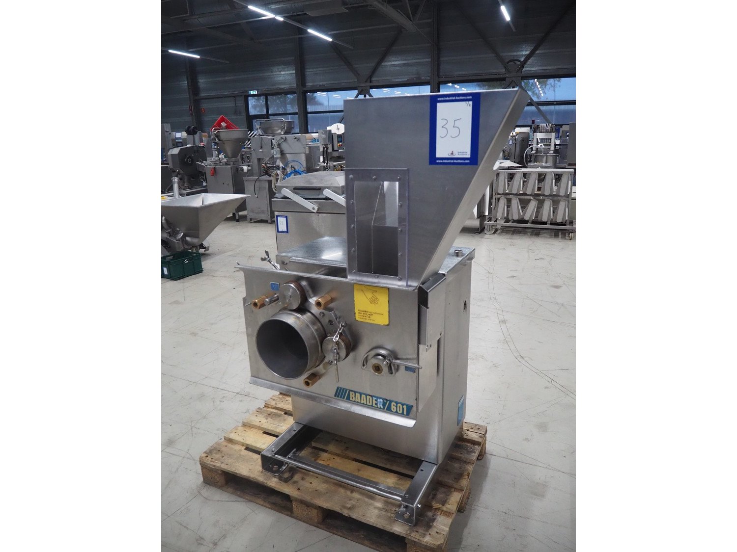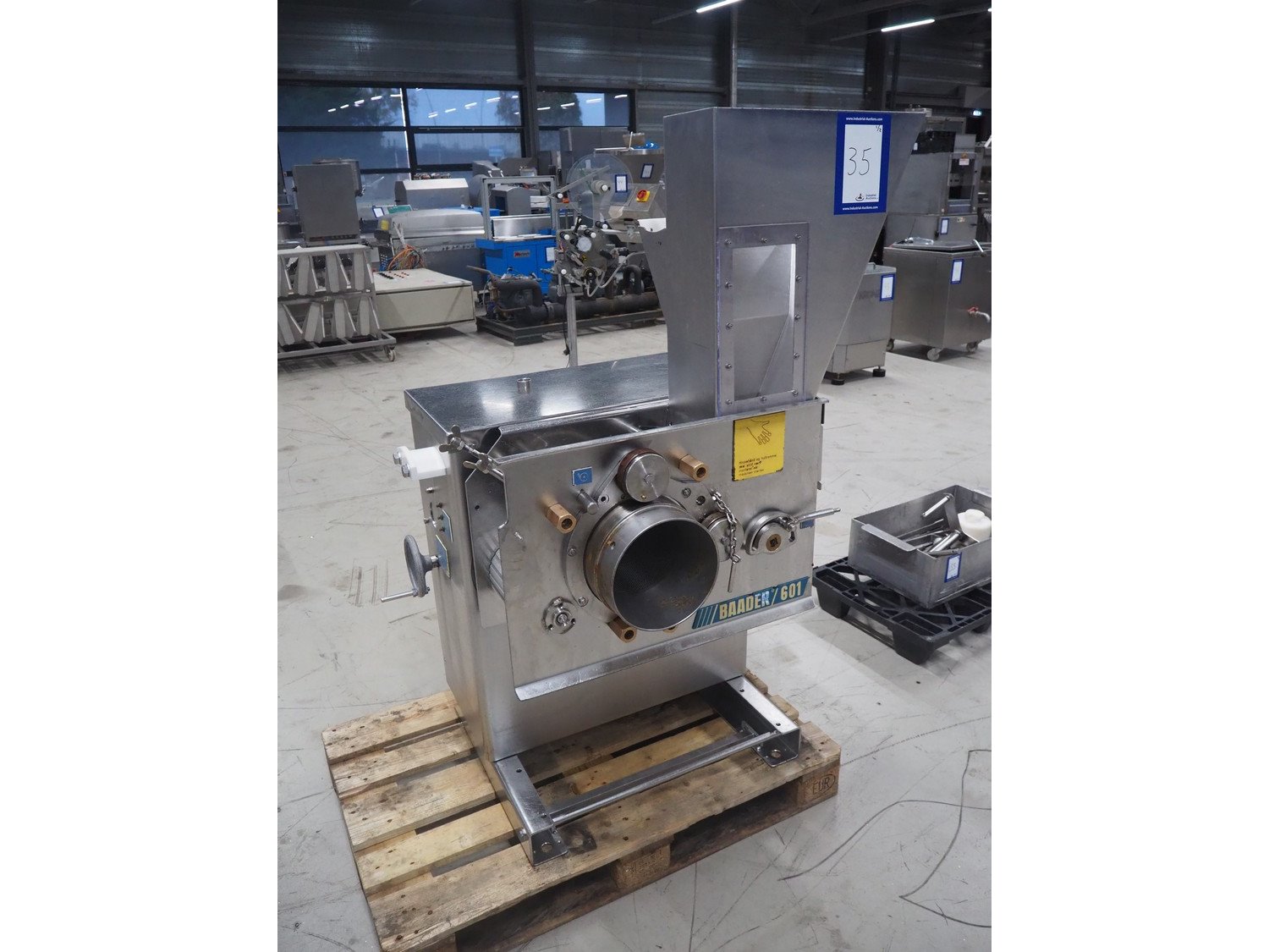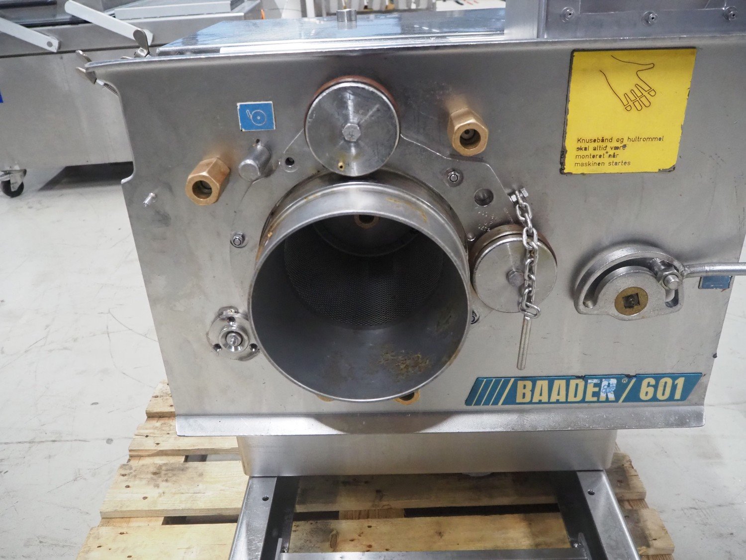 Baader separator, type: 601, number: 120573, year of construction: 2000, 400 V, 3 Ph, 50 Hz, 7.2 A, diameter perforations: 3 mm, diameter drum: 225 mm, total dimensions: 1100 mm x 800 mm x 1550 mm. With box with parts. Incomplete, missing belts.
