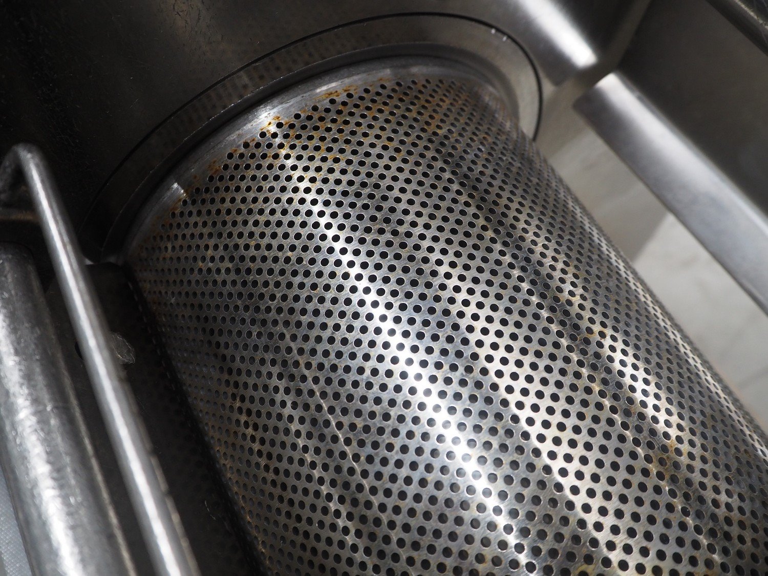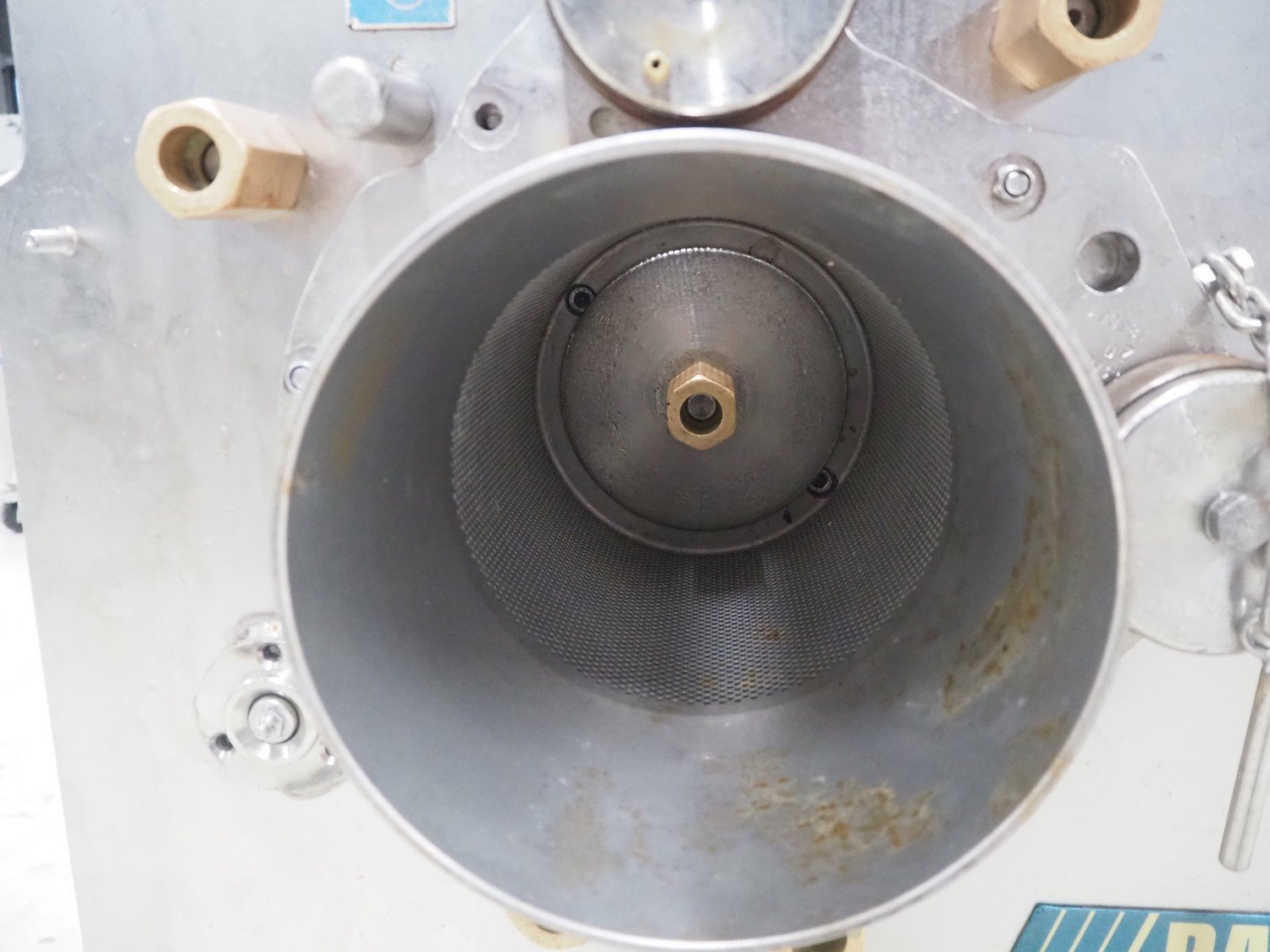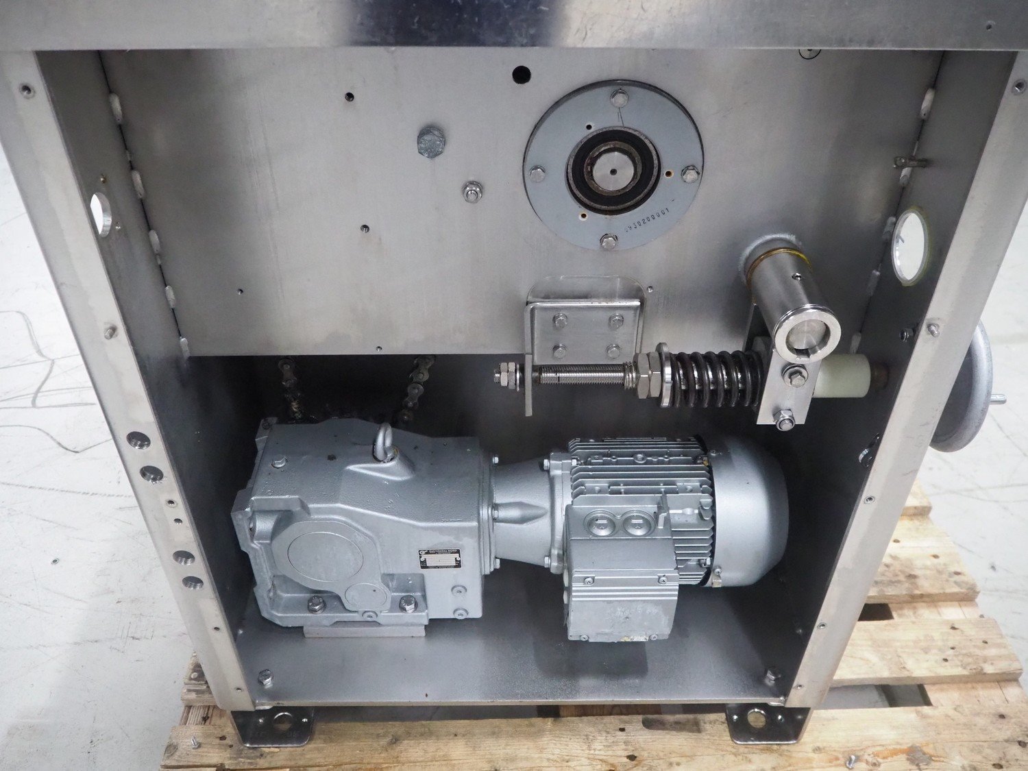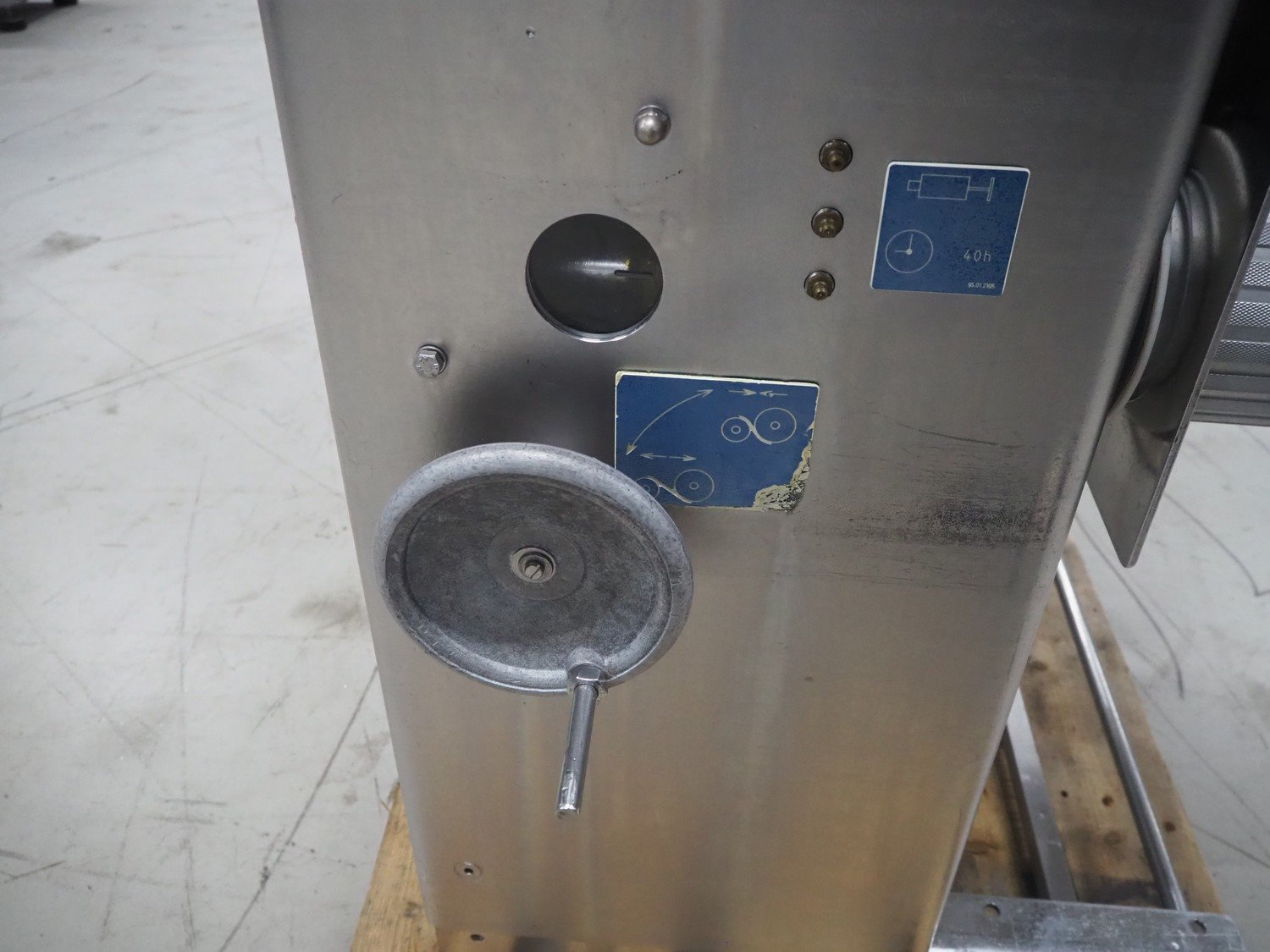 Baader separator, type: 601, number: 120573, year of construction: 2000, 400 V, 3 Ph, 50 Hz, 7.2 A, diameter perforations: 3 mm, diameter drum: 225 mm, total dimensions: 1100 mm x 800 mm x 1550 mm. With box with parts. Incomplete, missing belts.