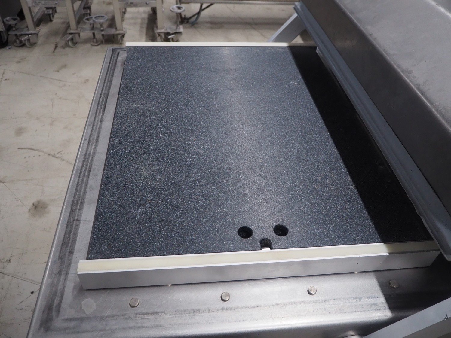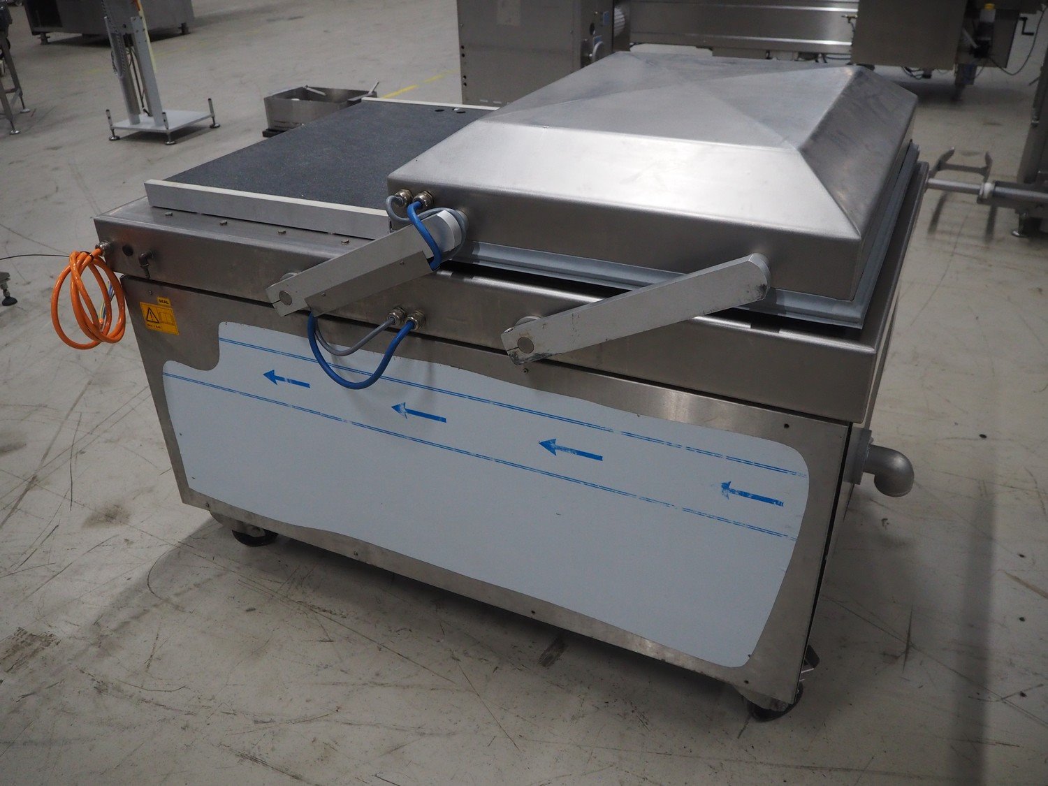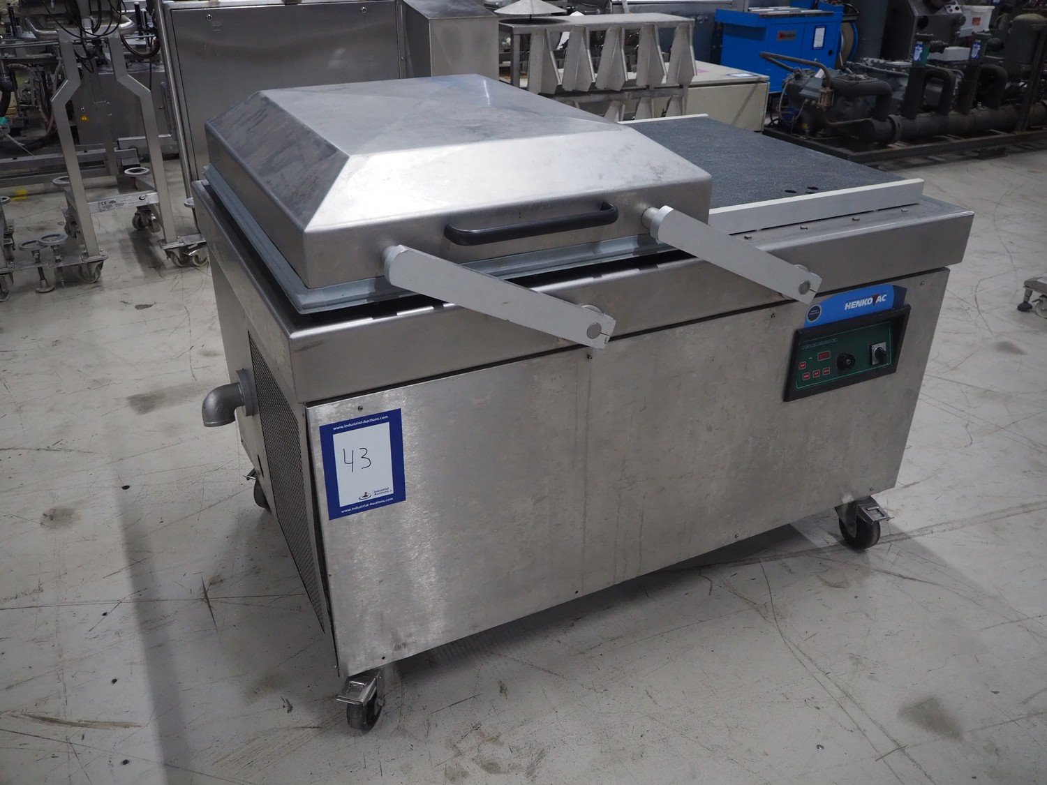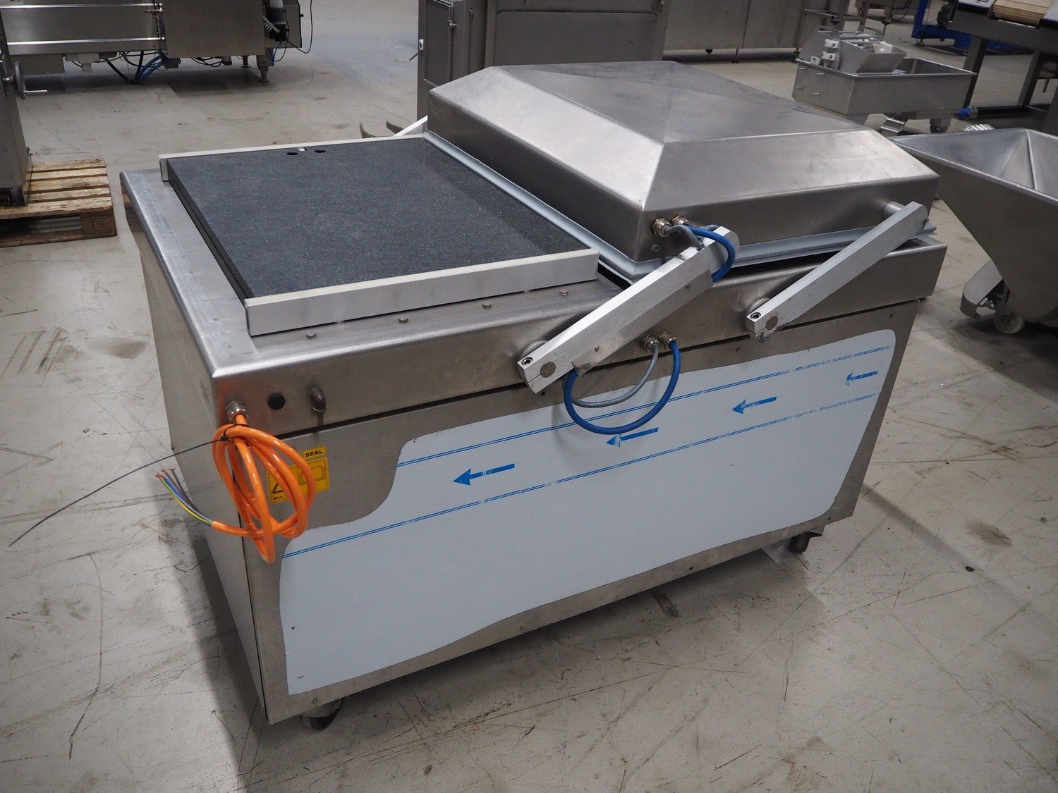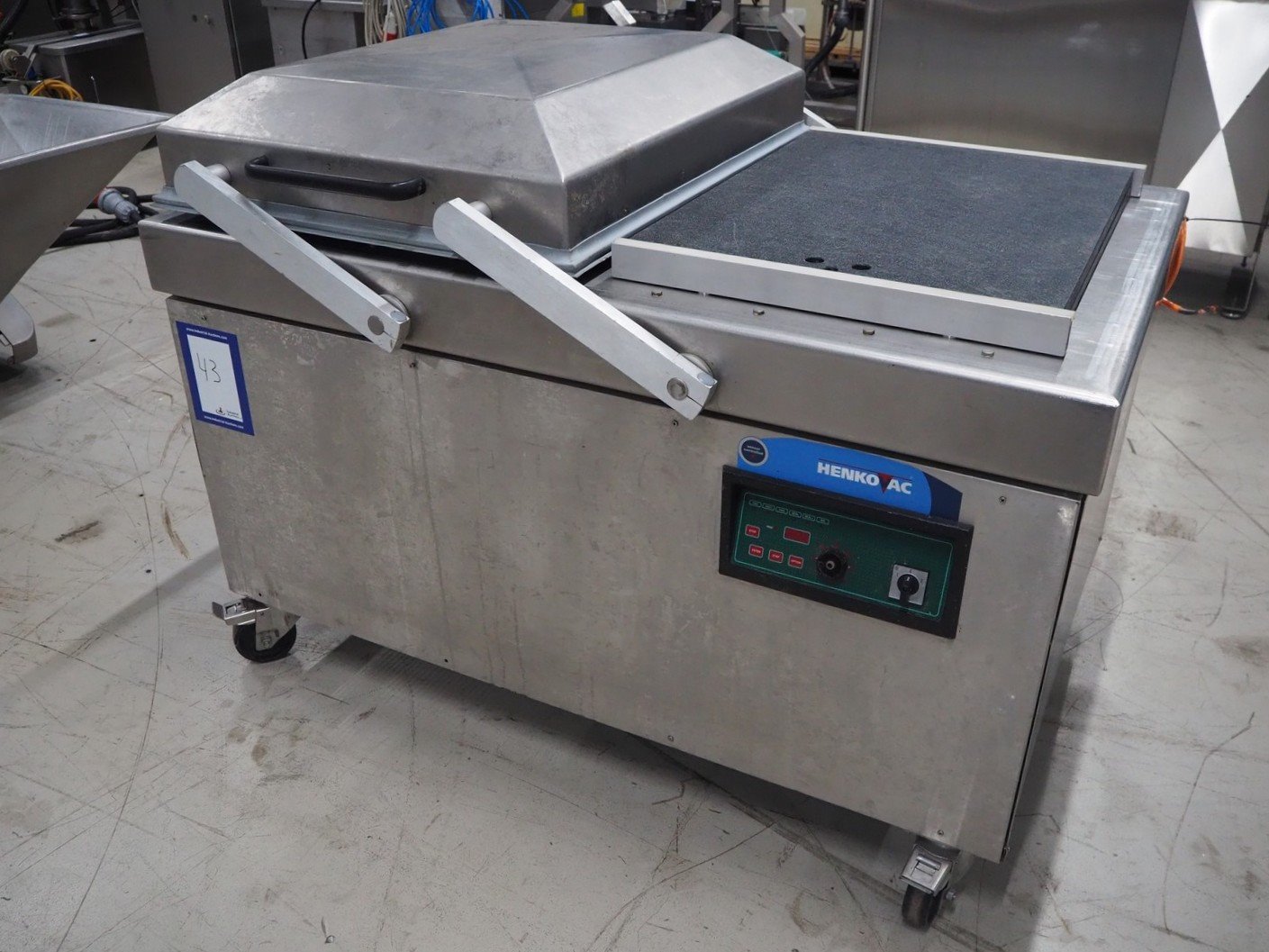 Henkovac mobile double chamber vacuum machine, type: FC 8160, serial number: 20030612, year of construction: 2003, 230 V, 3 Ph, 50 Hz, 31.0 A, 522 kg, seal length: (4x) 620 mm, dimensions chamber: 830 mm x 620 mm, total dimensions: 1650 mm x 1060 mm x 1150 mm.