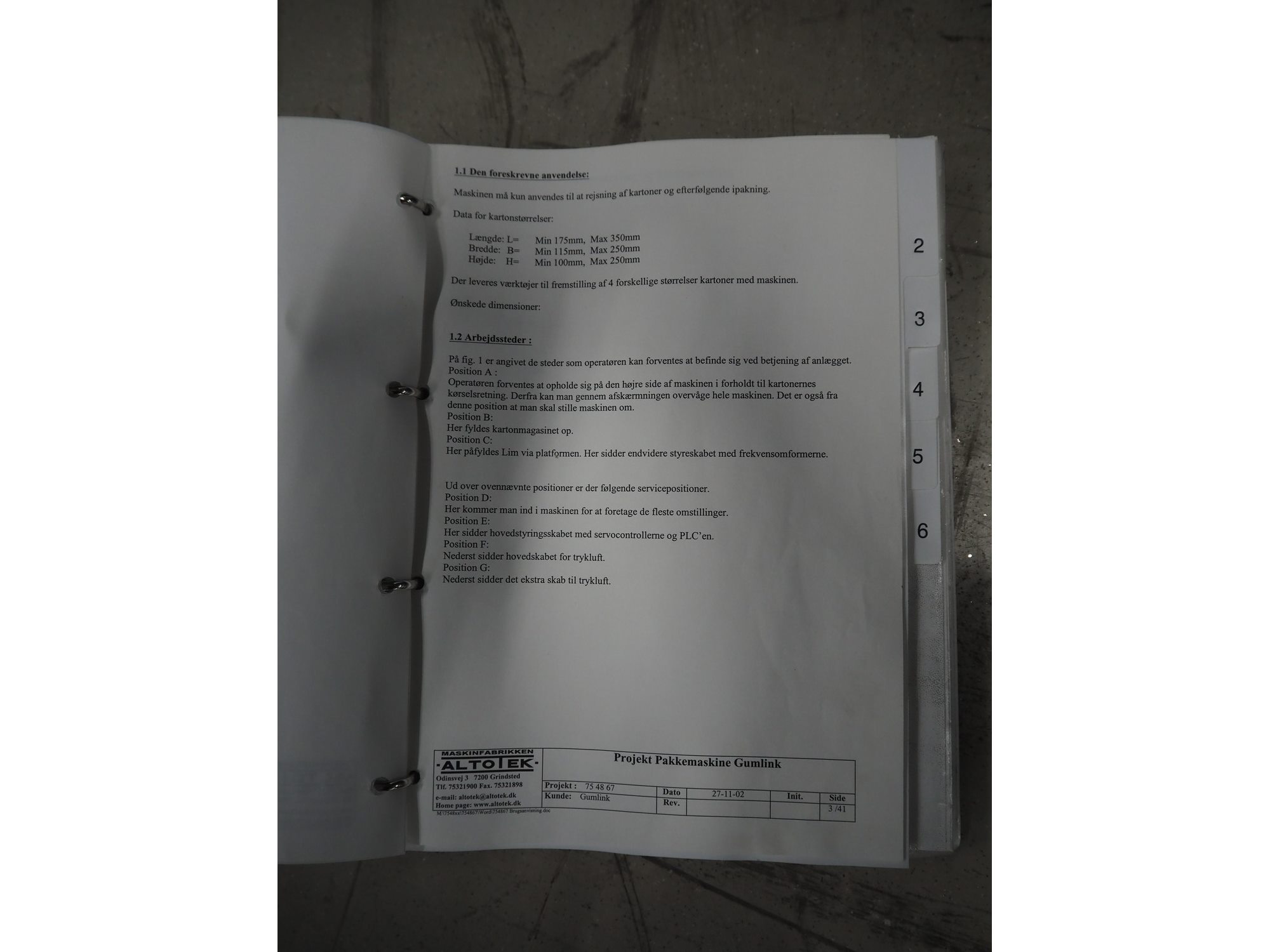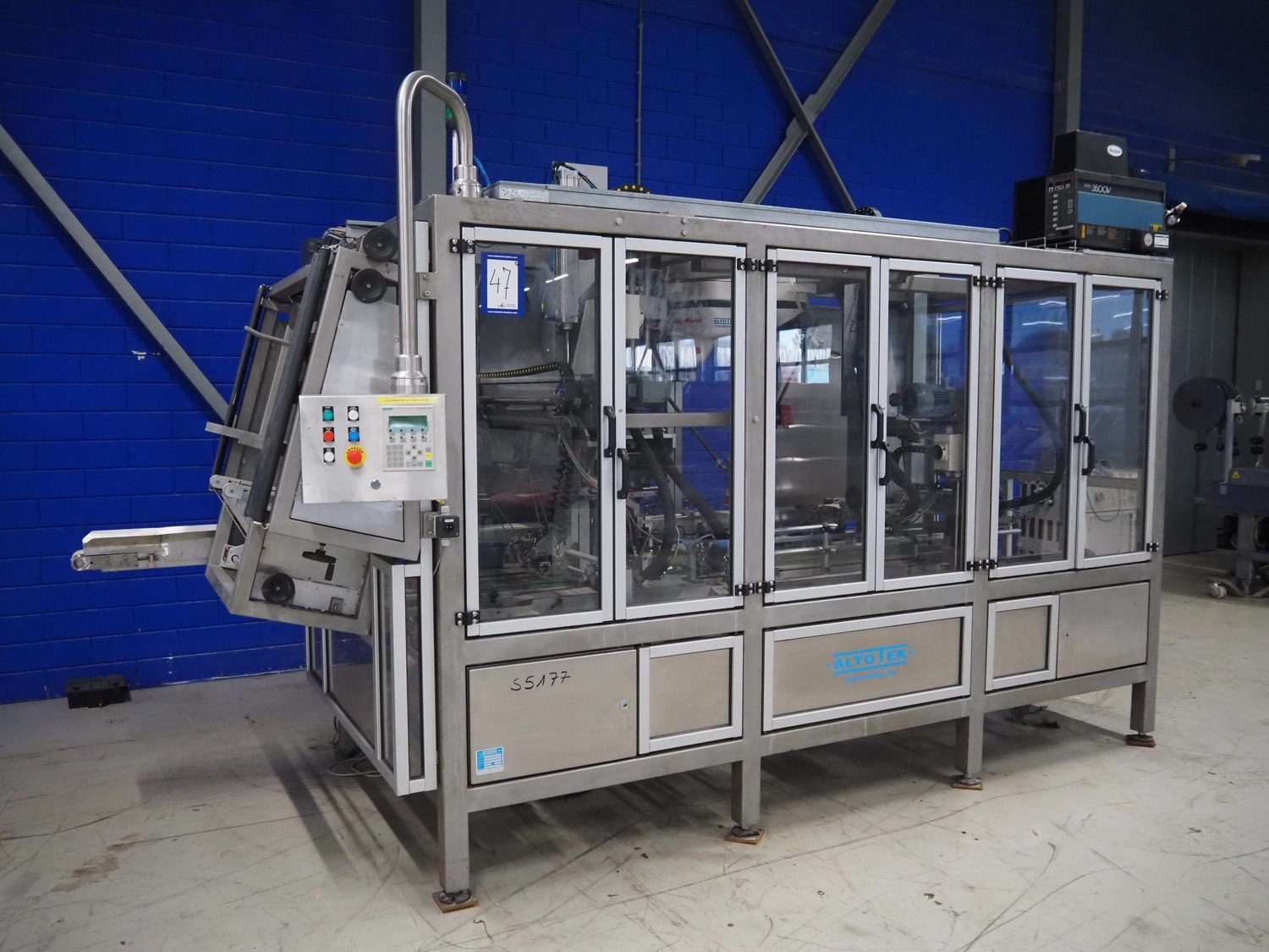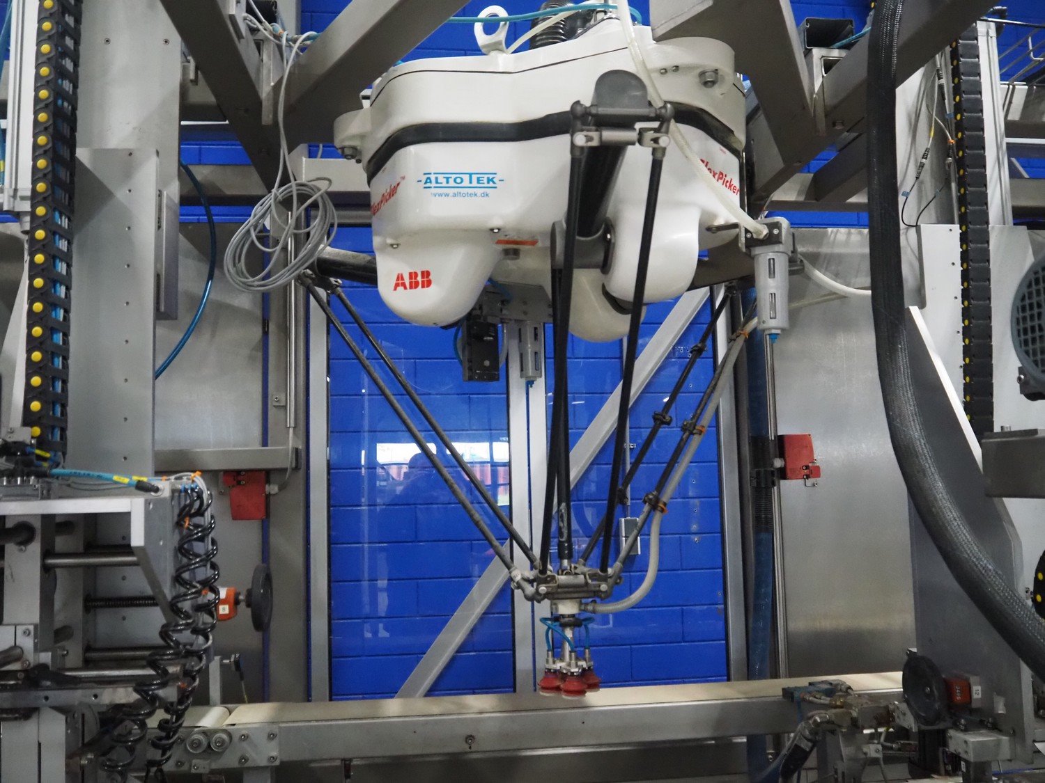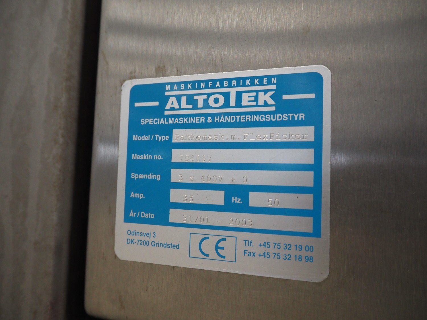 Altotek case erecting and filling machine with FlexPicker, machine number: 754867, year of construction: 31/01-2003, 400 V, 3 Ph, 50 Hz, 35 A, Nordson glue unit, minimum box sizes: 175 mm x 115 mm x 100 mm, maximum box sizes: 350 mm x 250 mm x 250 mm, s/s chain conveyor with dividers, belt width: 200 mm, distance between dividers: 350 mm, divider height: 50 mm, plastic belts, belt width: 130 mm, total dimensions: 4500 mm x 2000 mm x 2600 mm. With ABB control panel and cabinet for robot, type: IRB340 M2000, serial number: 34-20212, year of construction: 19-08-2002, dimensions: 900 mm x 550 mm x 1100 mm.
