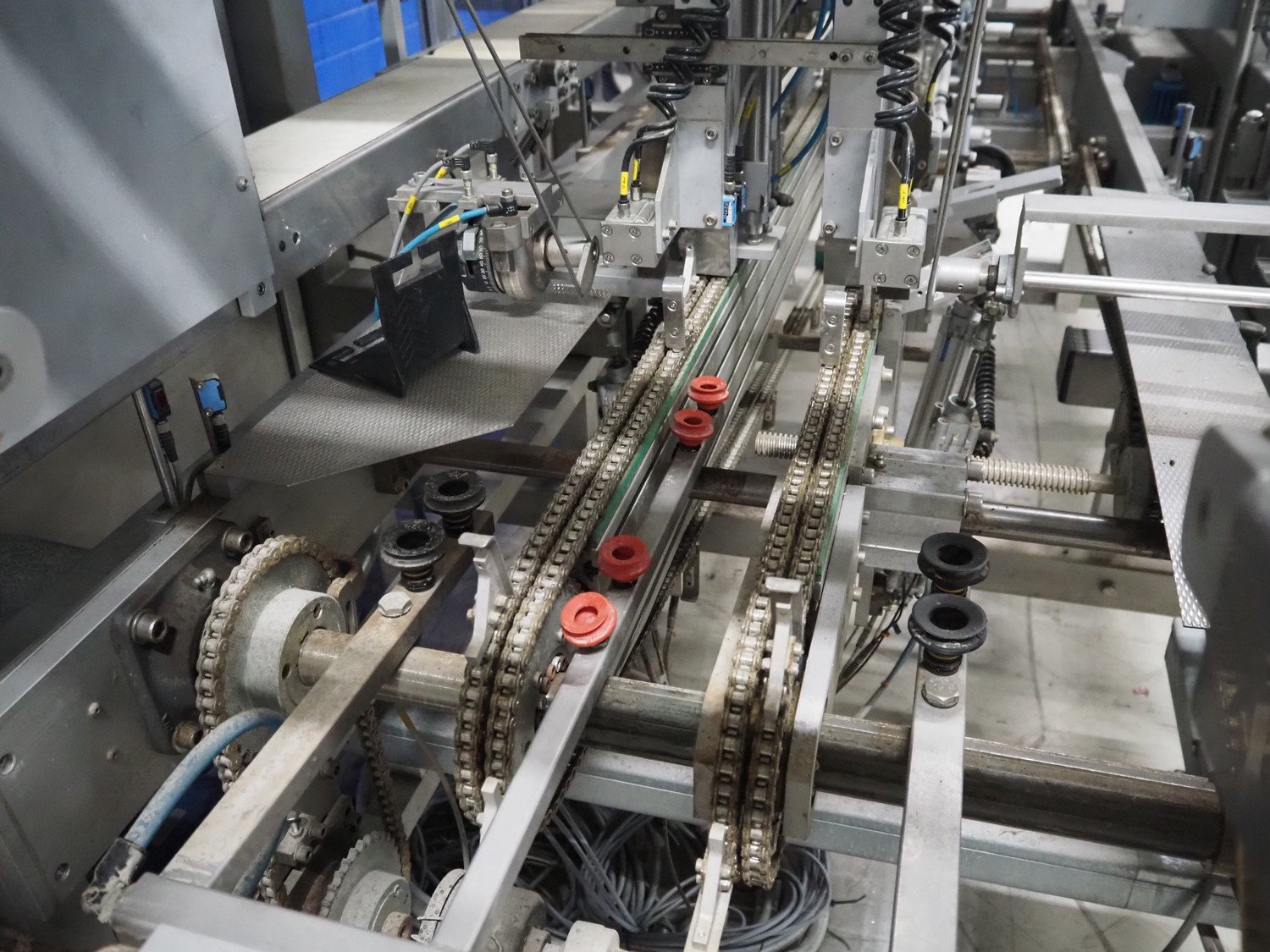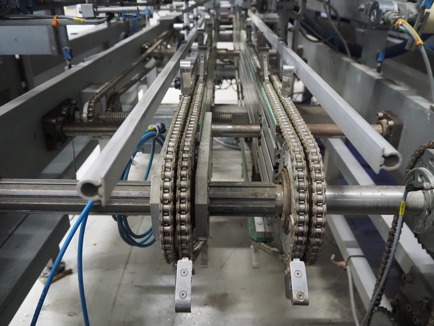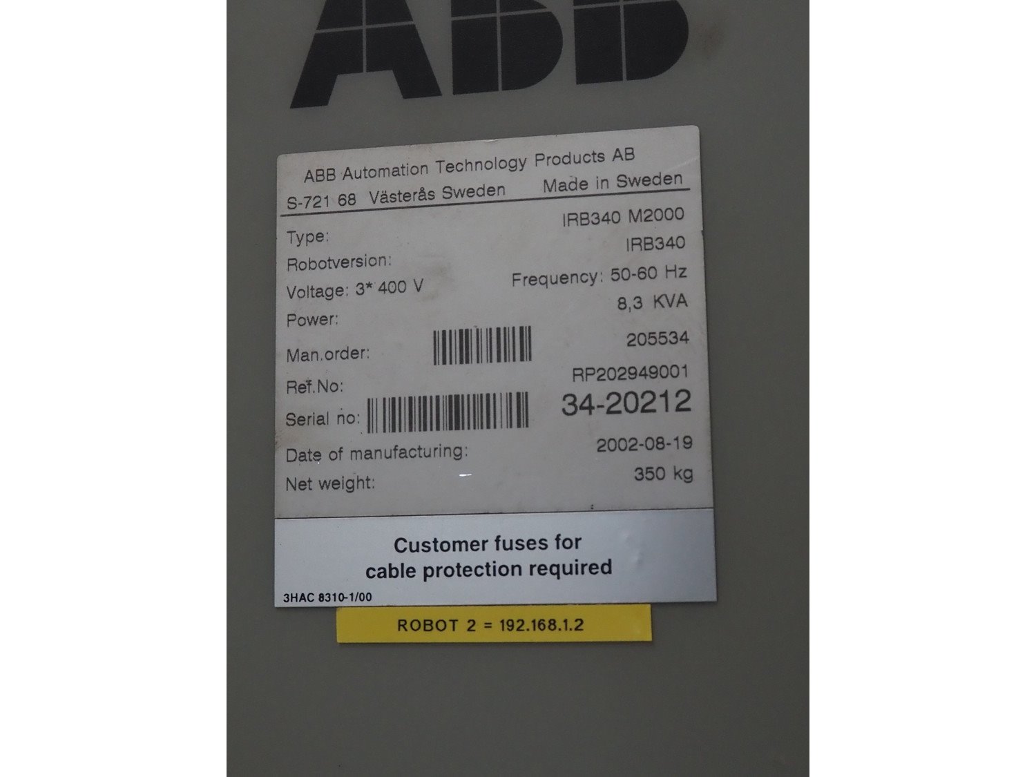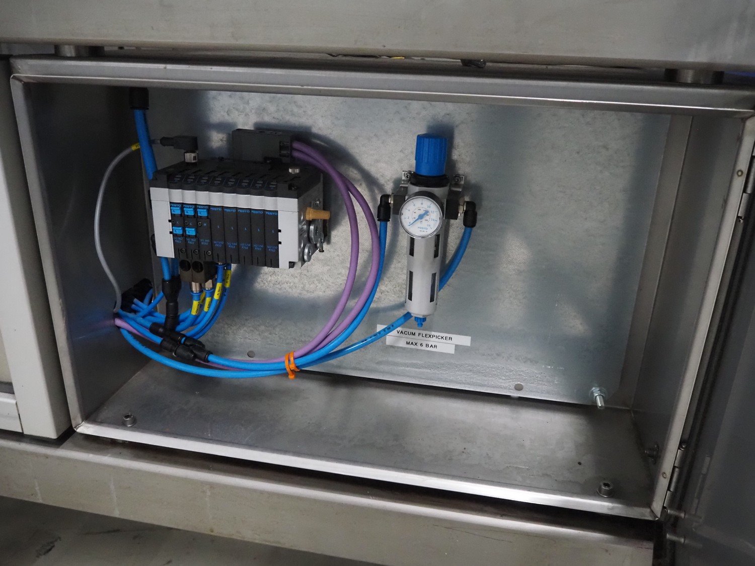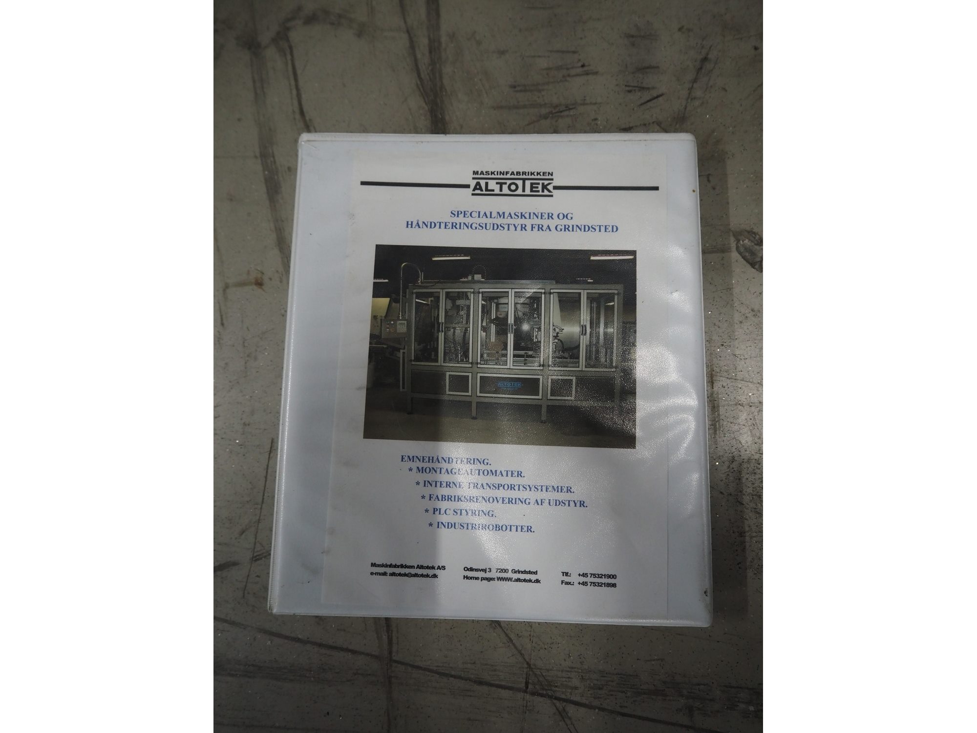 Altotek case erecting and filling machine with FlexPicker, machine number: 754867, year of construction: 31/01-2003, 400 V, 3 Ph, 50 Hz, 35 A, Nordson glue unit, minimum box sizes: 175 mm x 115 mm x 100 mm, maximum box sizes: 350 mm x 250 mm x 250 mm, s/s chain conveyor with dividers, belt width: 200 mm, distance between dividers: 350 mm, divider height: 50 mm, plastic belts, belt width: 130 mm, total dimensions: 4500 mm x 2000 mm x 2600 mm. With ABB control panel and cabinet for robot, type: IRB340 M2000, serial number: 34-20212, year of construction: 19-08-2002, dimensions: 900 mm x 550 mm x 1100 mm.