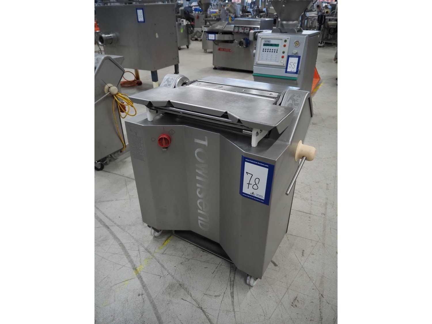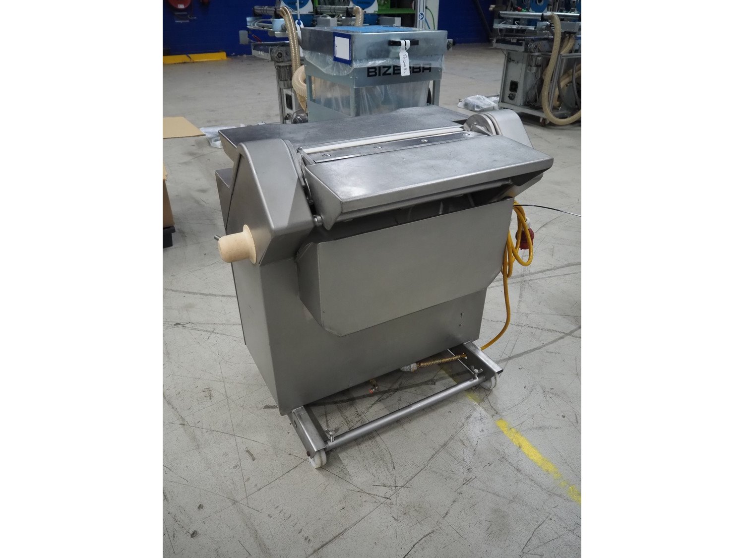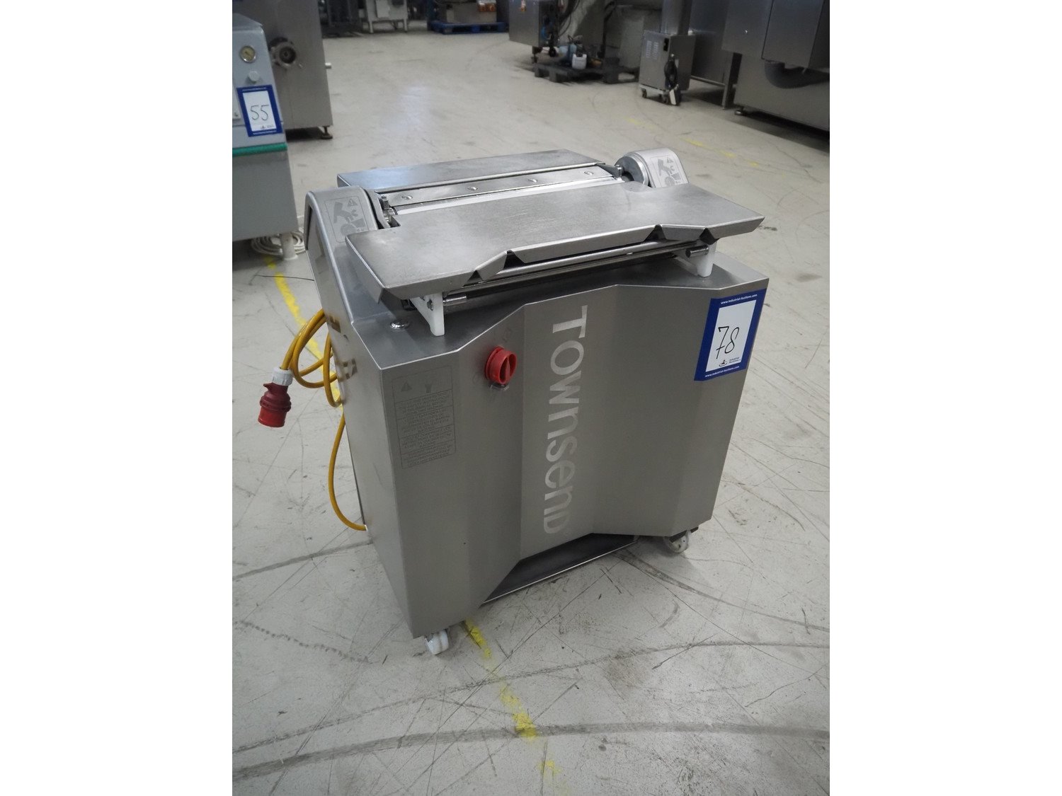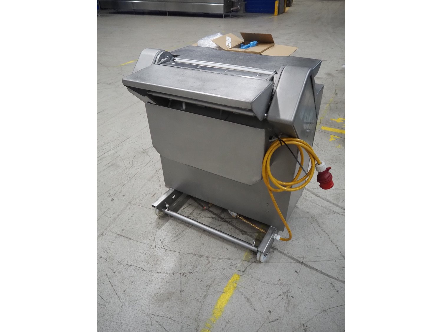 Townsend mobile skinning machine, model: 7620, serial number: 708, year of construction: 1995, 380 V, 3 Ph, 50 Hz, 2.0 A, 1 HP, foot control, working width: 510 mm, total dimensions: 900 mm x 670 mm x 900 mm.