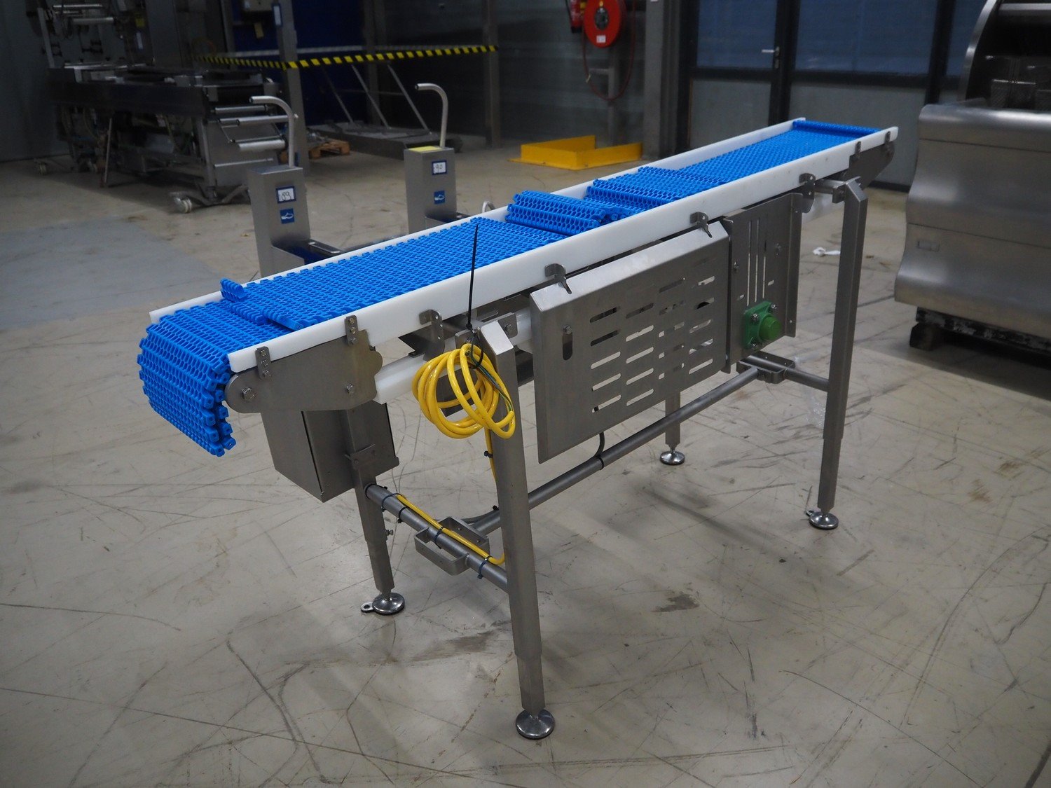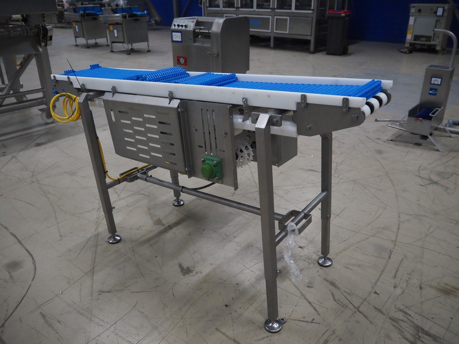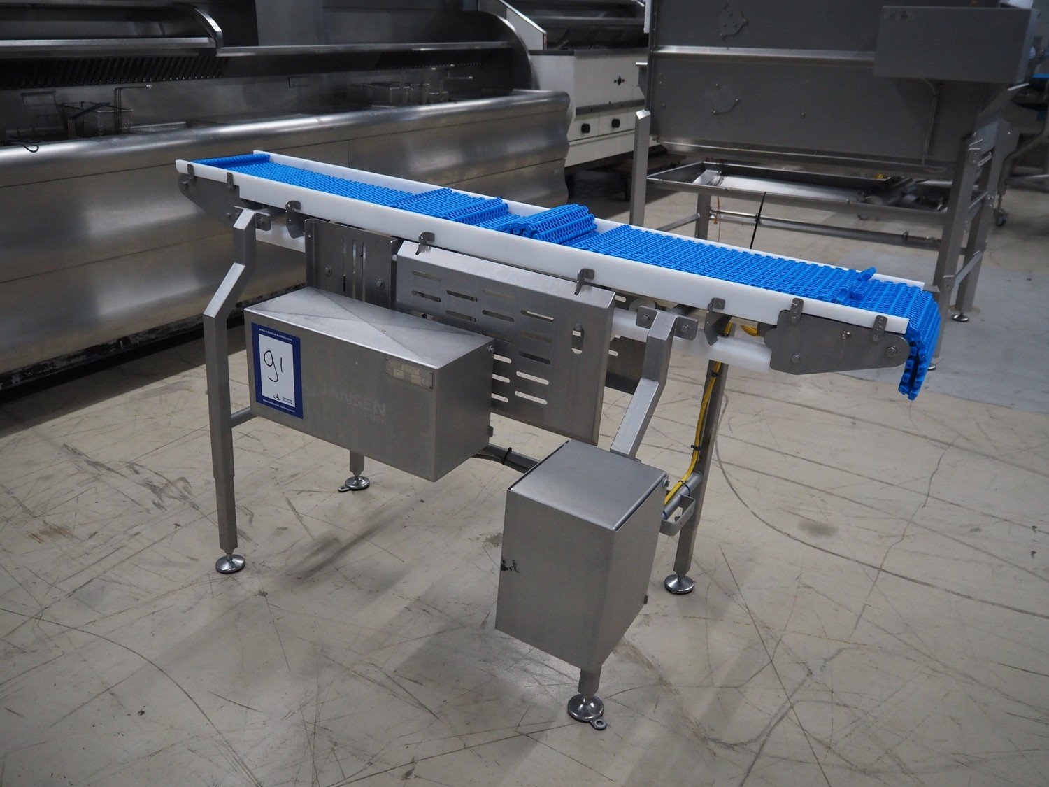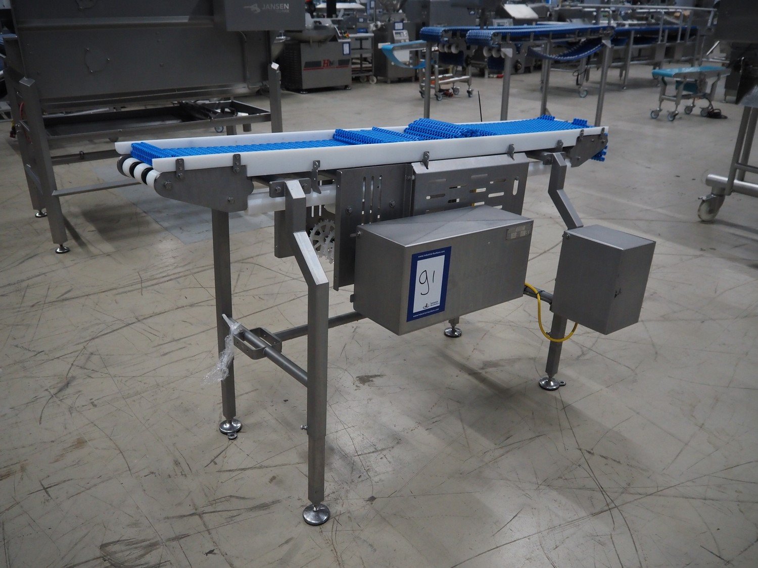Jansen Techniek transport belt, s/s frame, model: SCHALENBAND, type: POS. 01A-2, number: 201801650, year of construction: 2018, plastic mesh belt, belt width: 250 mm, total dimensions: 1900 mm x 1300 mm x 2040 mm.