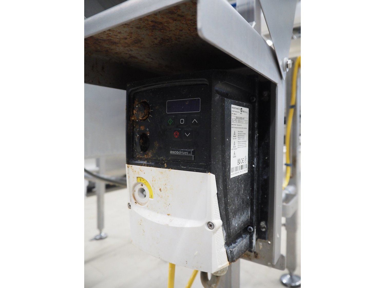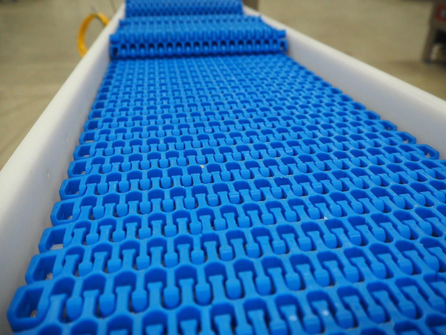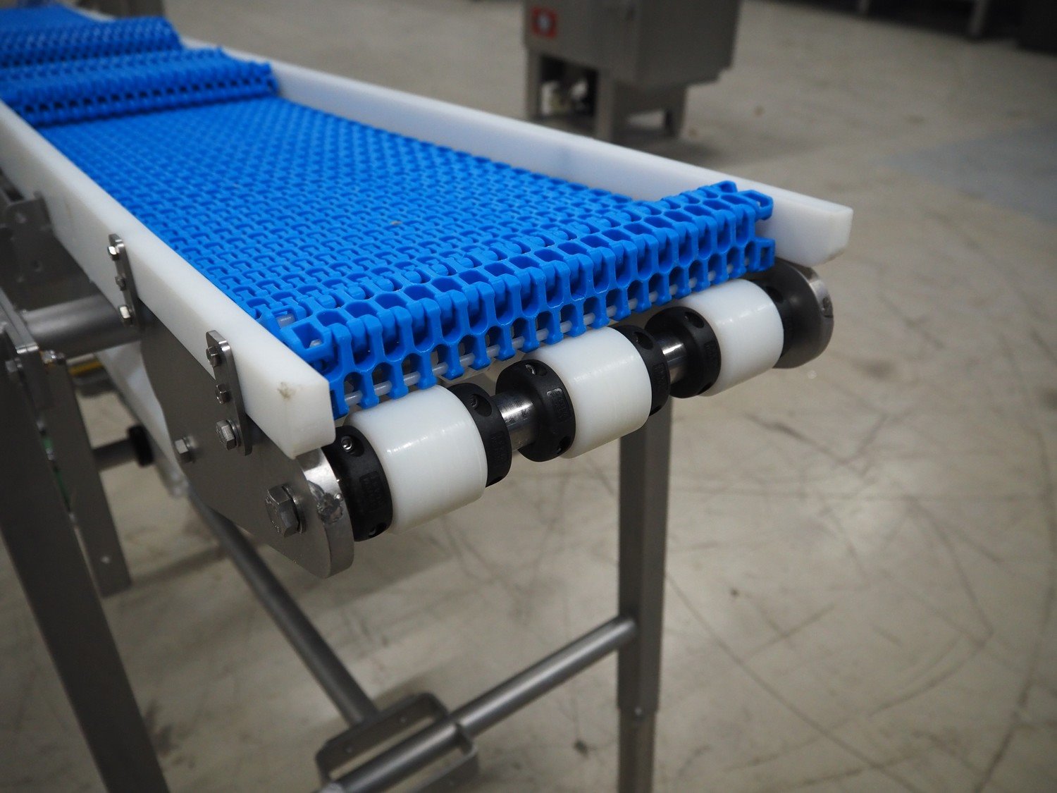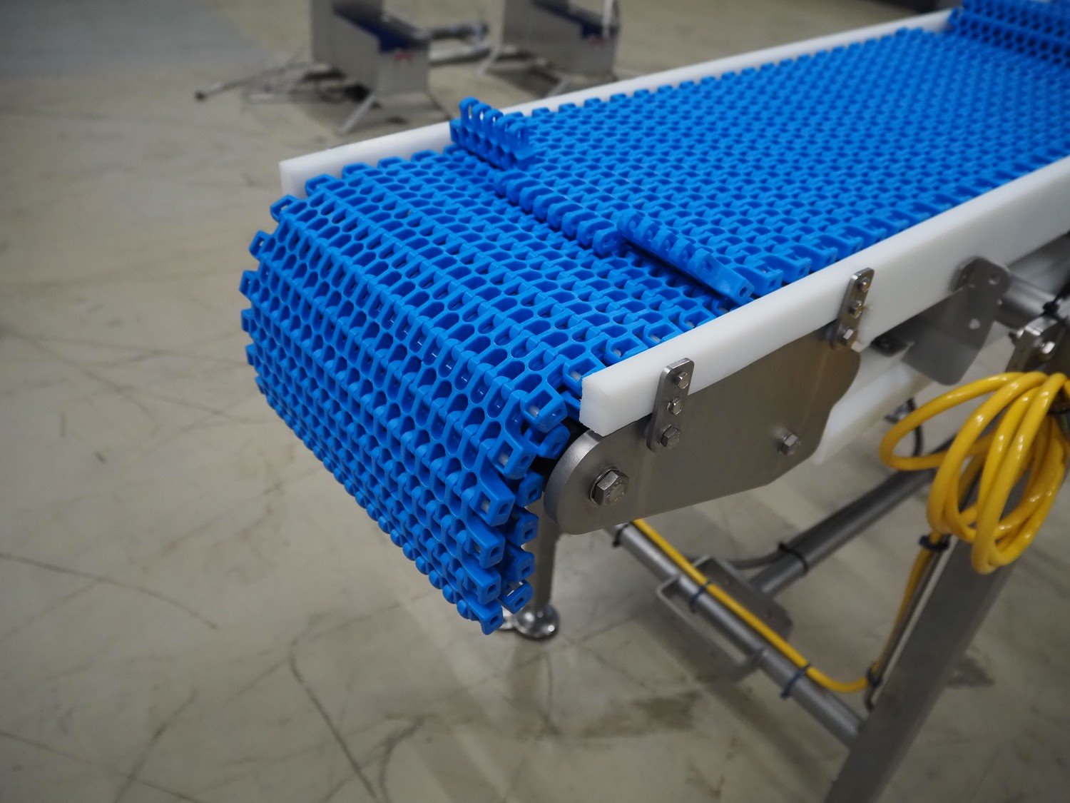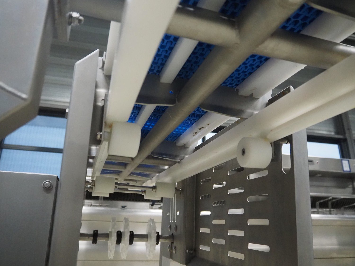 Jansen Techniek transport belt, s/s frame, model: SCHALENBAND, type: POS. 01A-2, number: 201801650, year of construction: 2018, plastic mesh belt, belt width: 250 mm, total dimensions: 1900 mm x 1300 mm x 2040 mm.