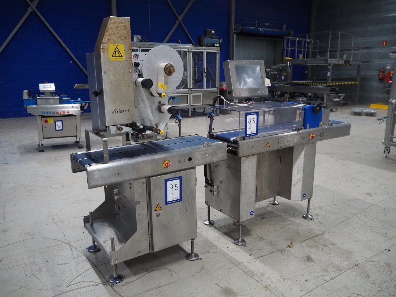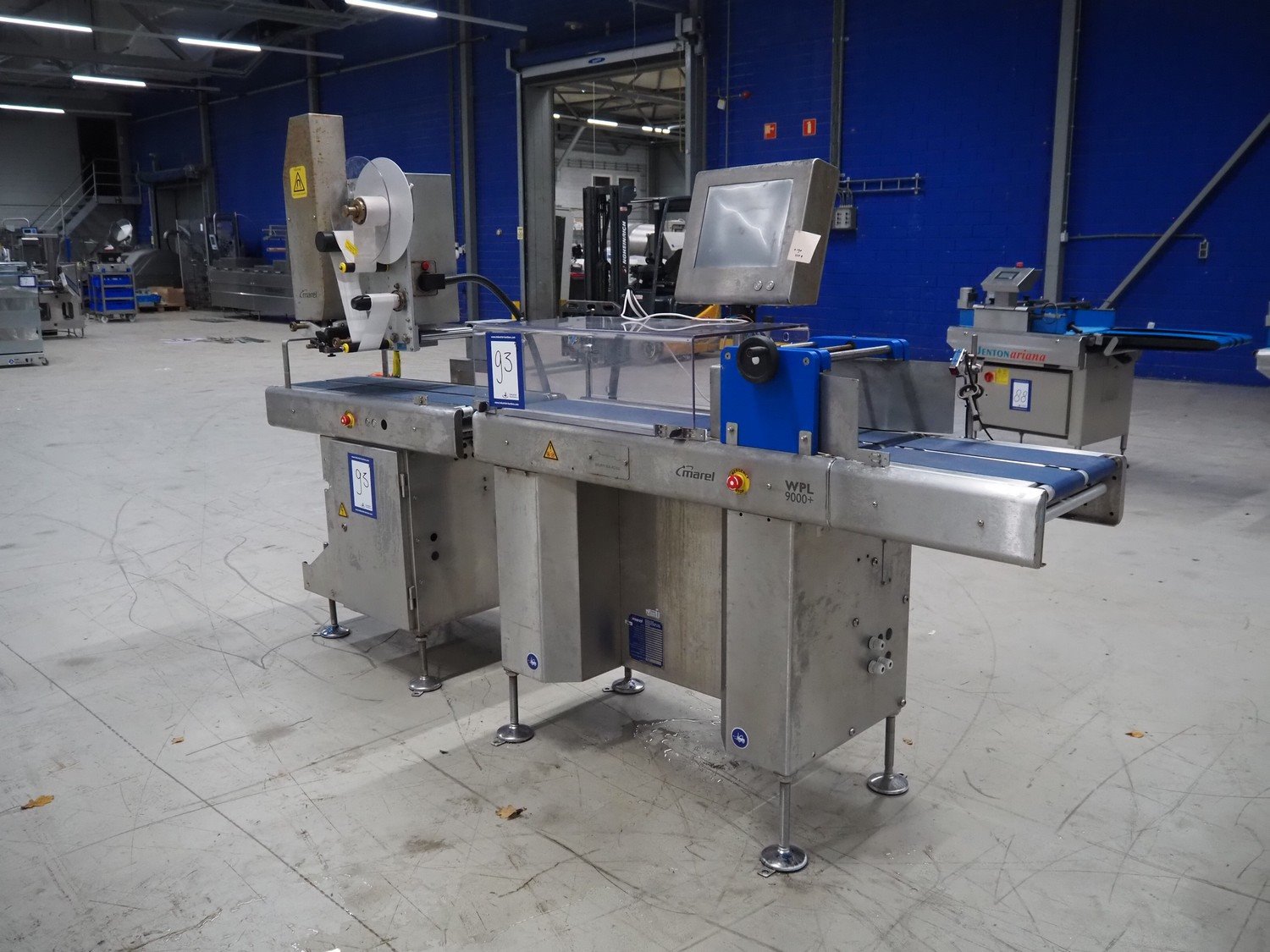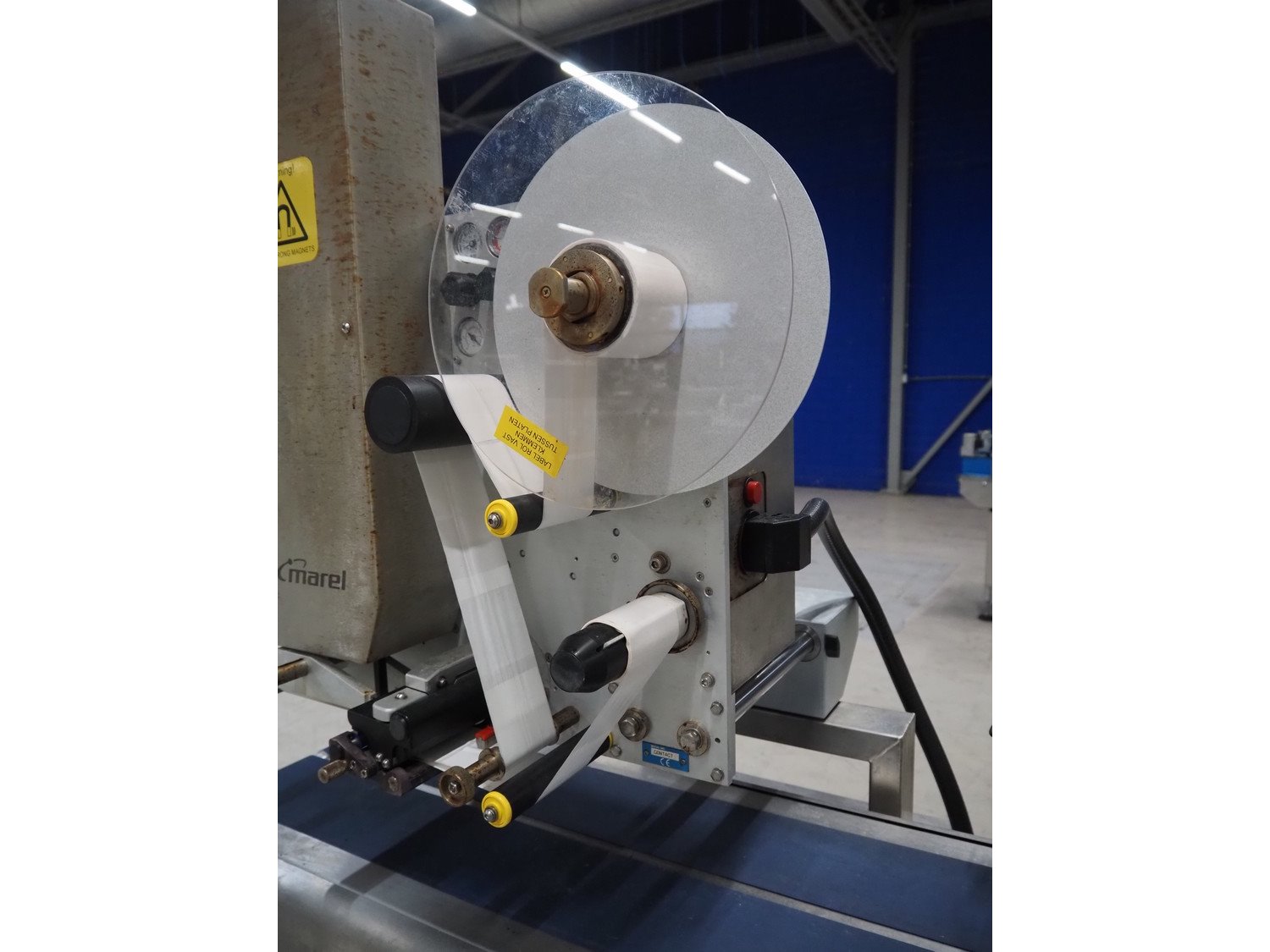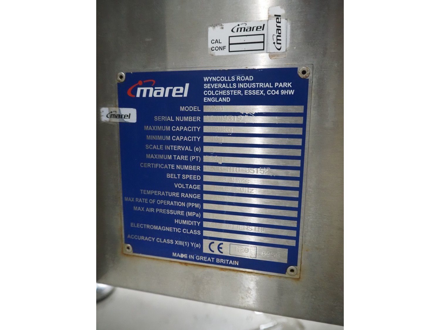 Marel checkweigher and labeller, model: 9000, serial number: 10449319, maximum weight: 3000 kg, minimum weight: 40 gram, e= 2 gram, maximum tare: 900 gram, plastic belts: (2x) 140 mm and 200 mm, total dimensions: 1580 mm x 600 mm x 1600 mm and 1080 mm x 750 mm x 1790 mm.