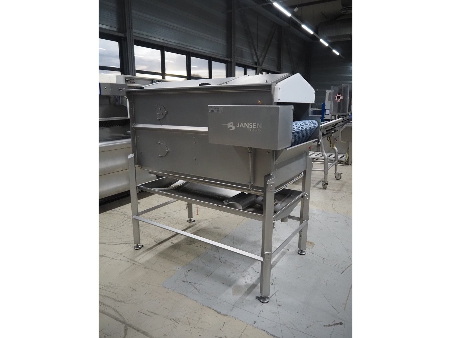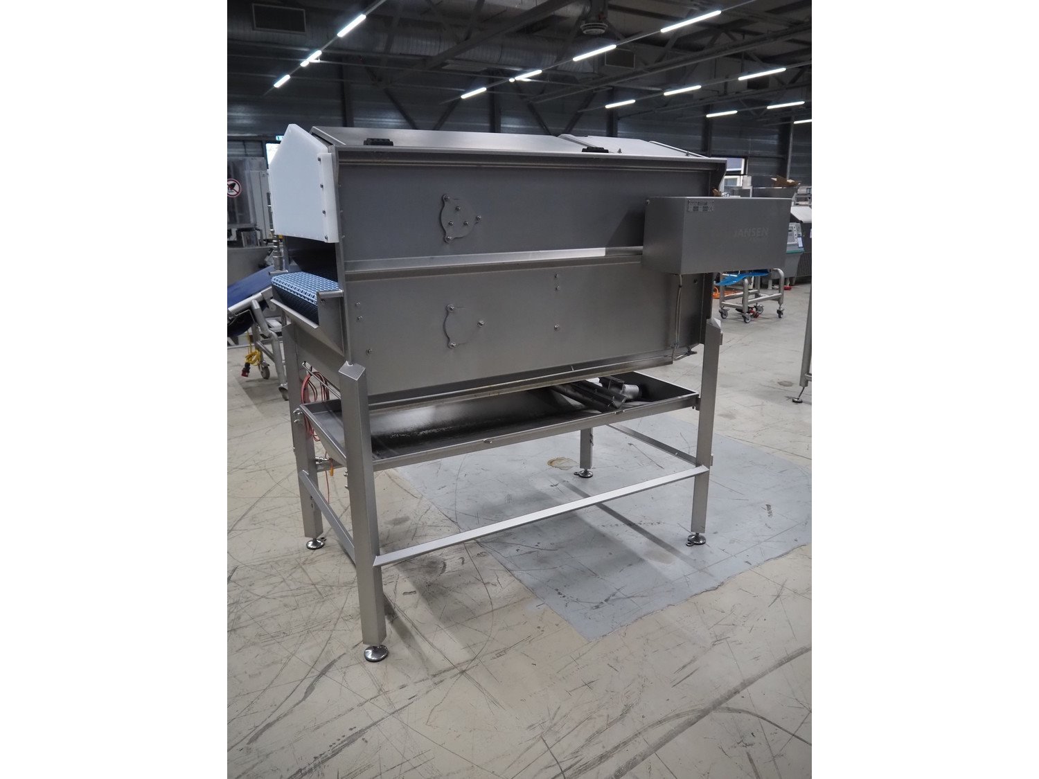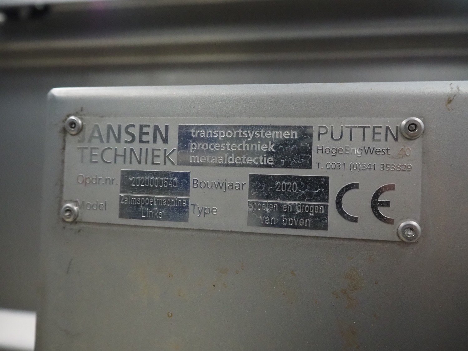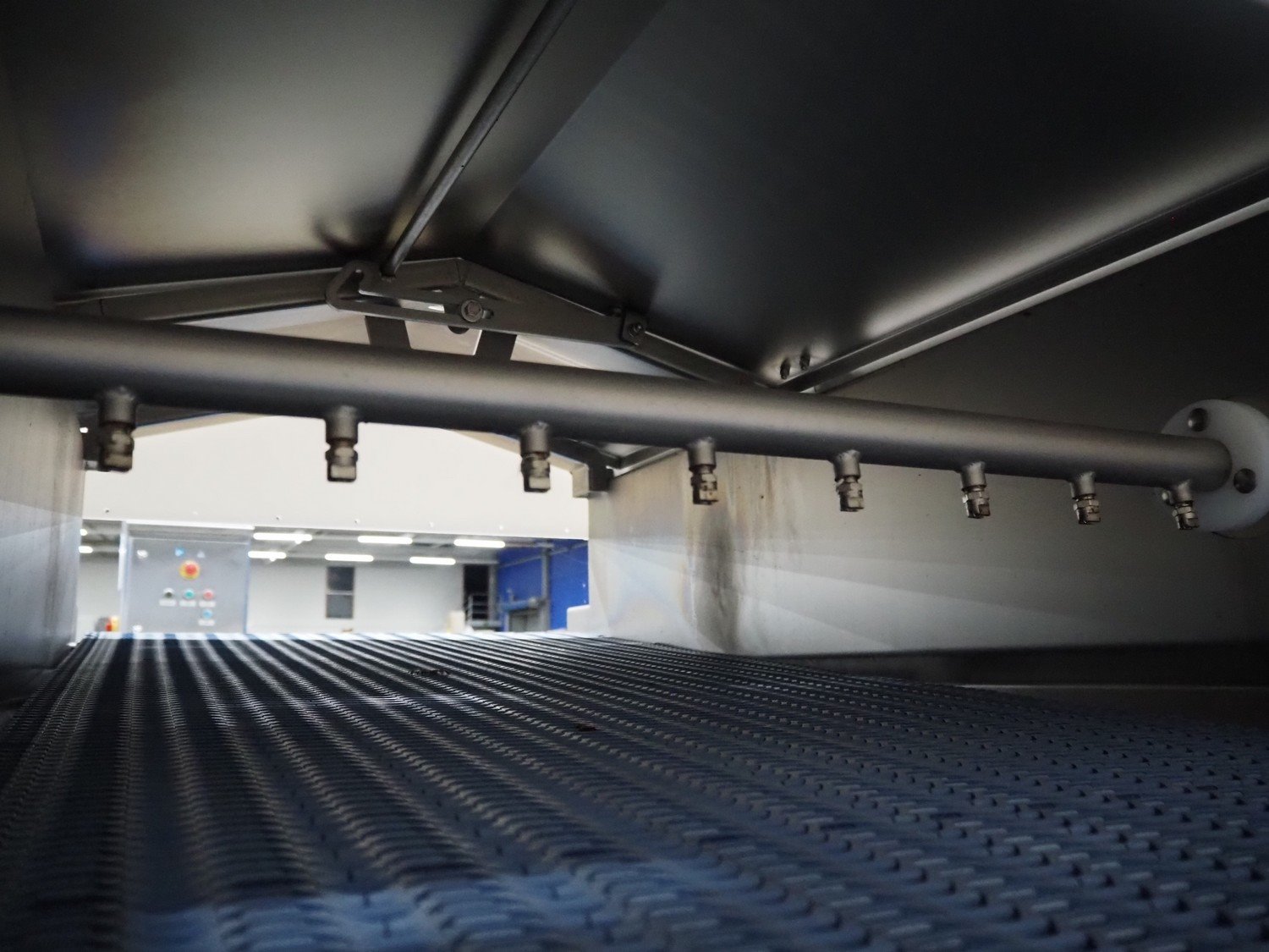 Jansen Techniek salmon rinsing tunnel, model: Zalmspelmachine Links, type: Spoelen en drogen van boven, number: 2020000540, year of construction: 2020, plastic mesh belt, belt width: 710 mm, total dimensions: 1700 mm x 1300 mm x 1730 mm.