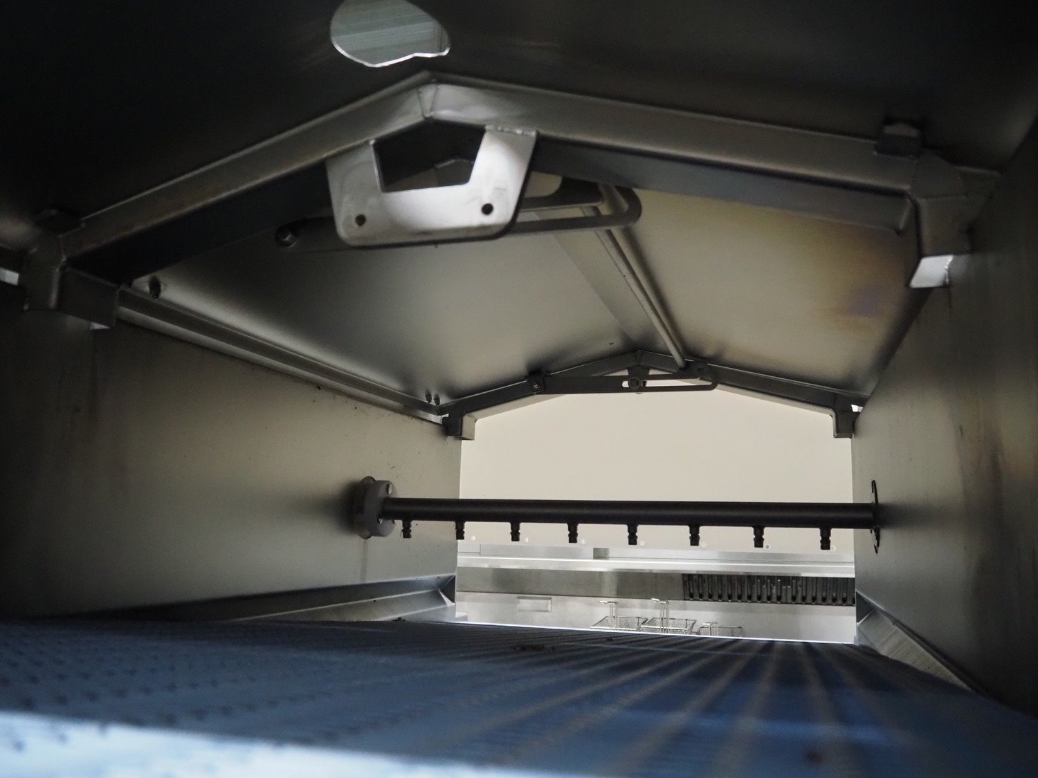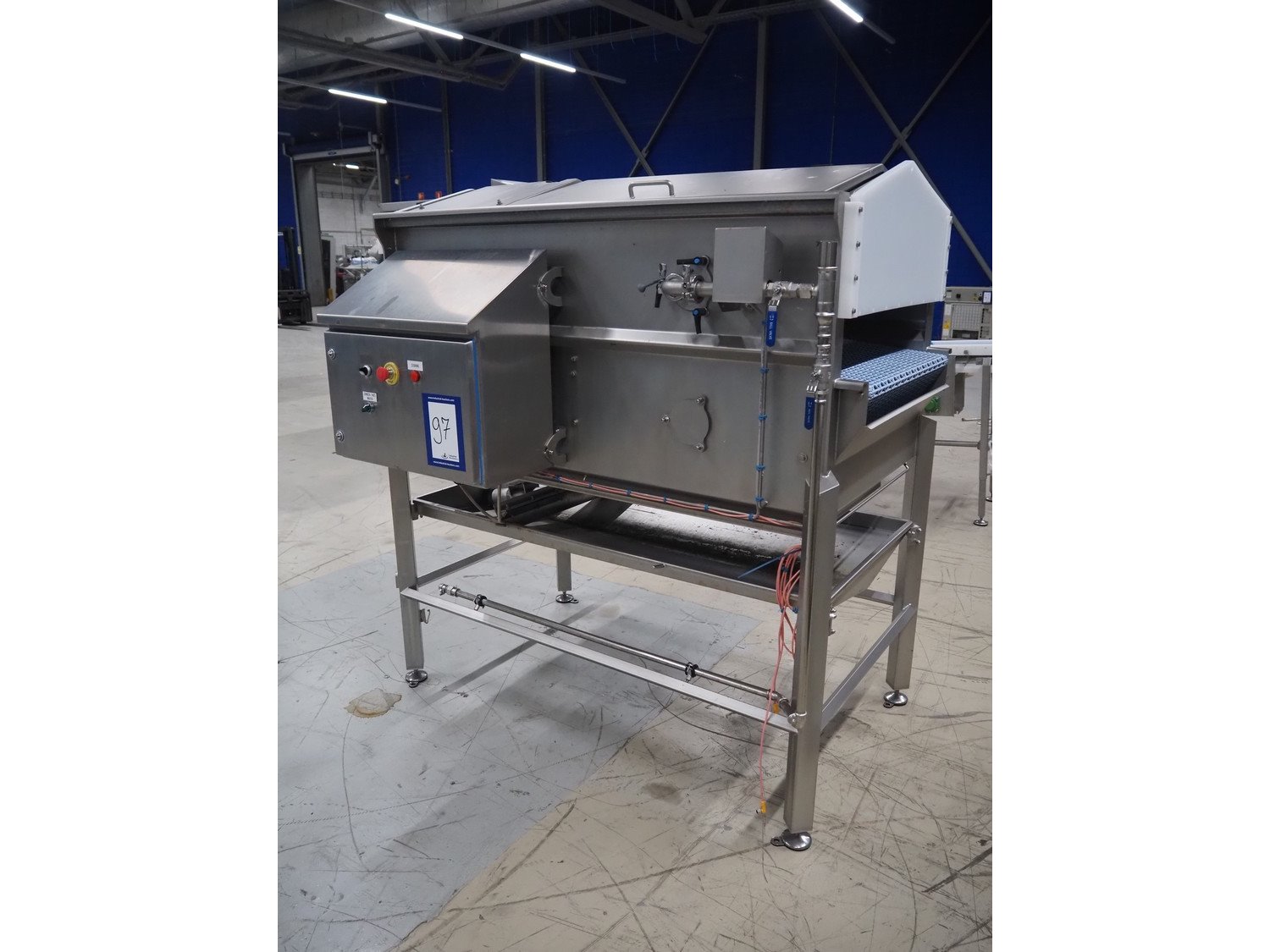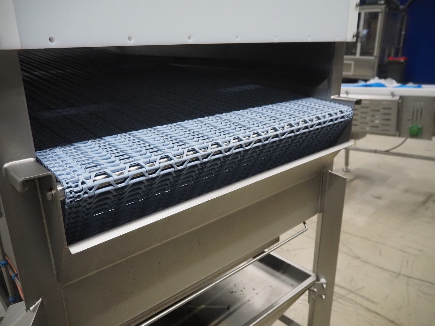 Jansen Techniek salmon rinsing tunnel, model: Zalmspelmachine Links, type: Spoelen en drogen van boven, number: 2020000540, year of construction: 2020, plastic mesh belt, belt width: 710 mm, total dimensions: 1700 mm x 1300 mm x 1730 mm.