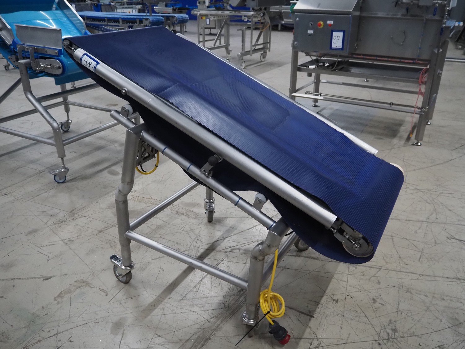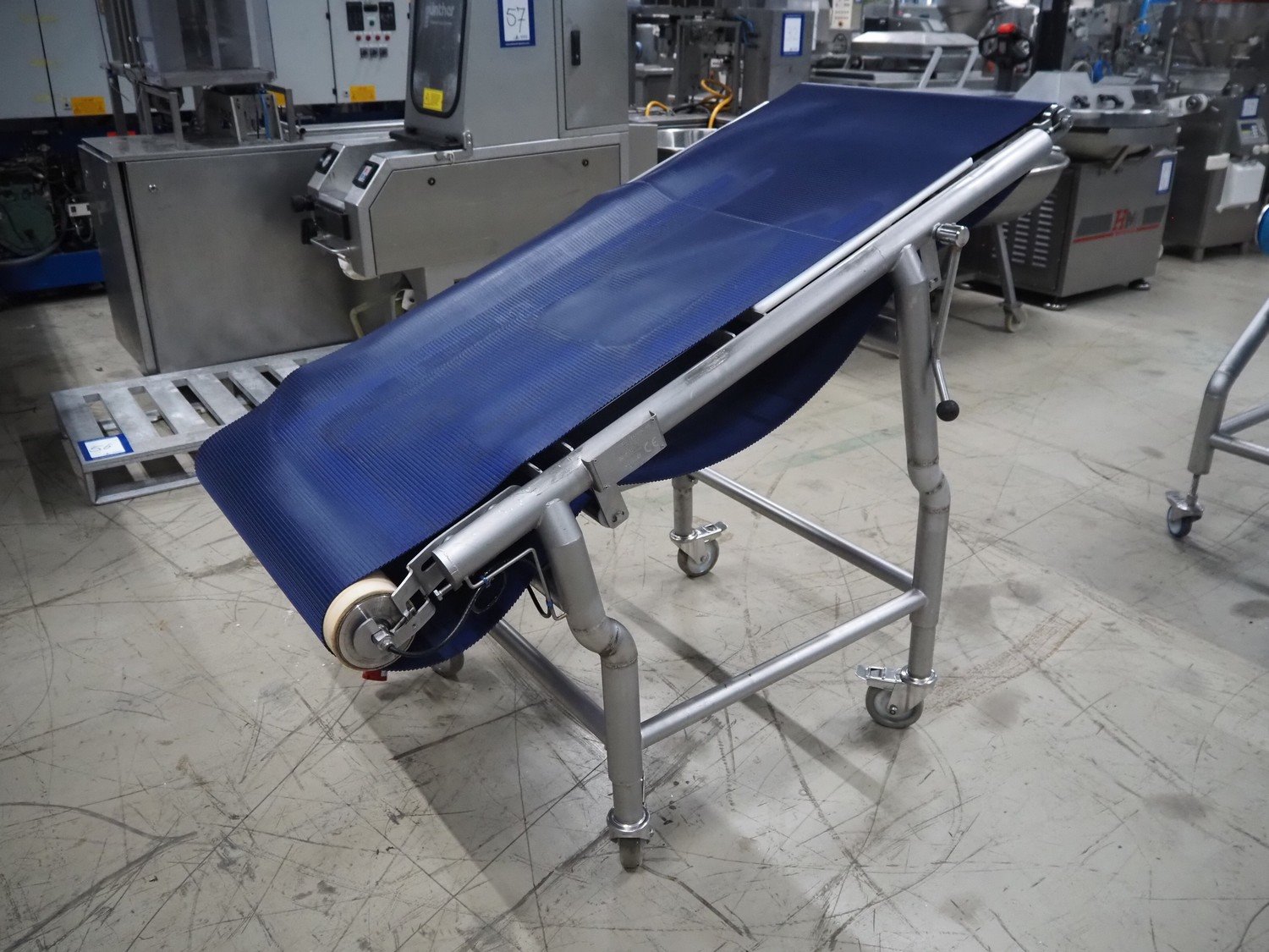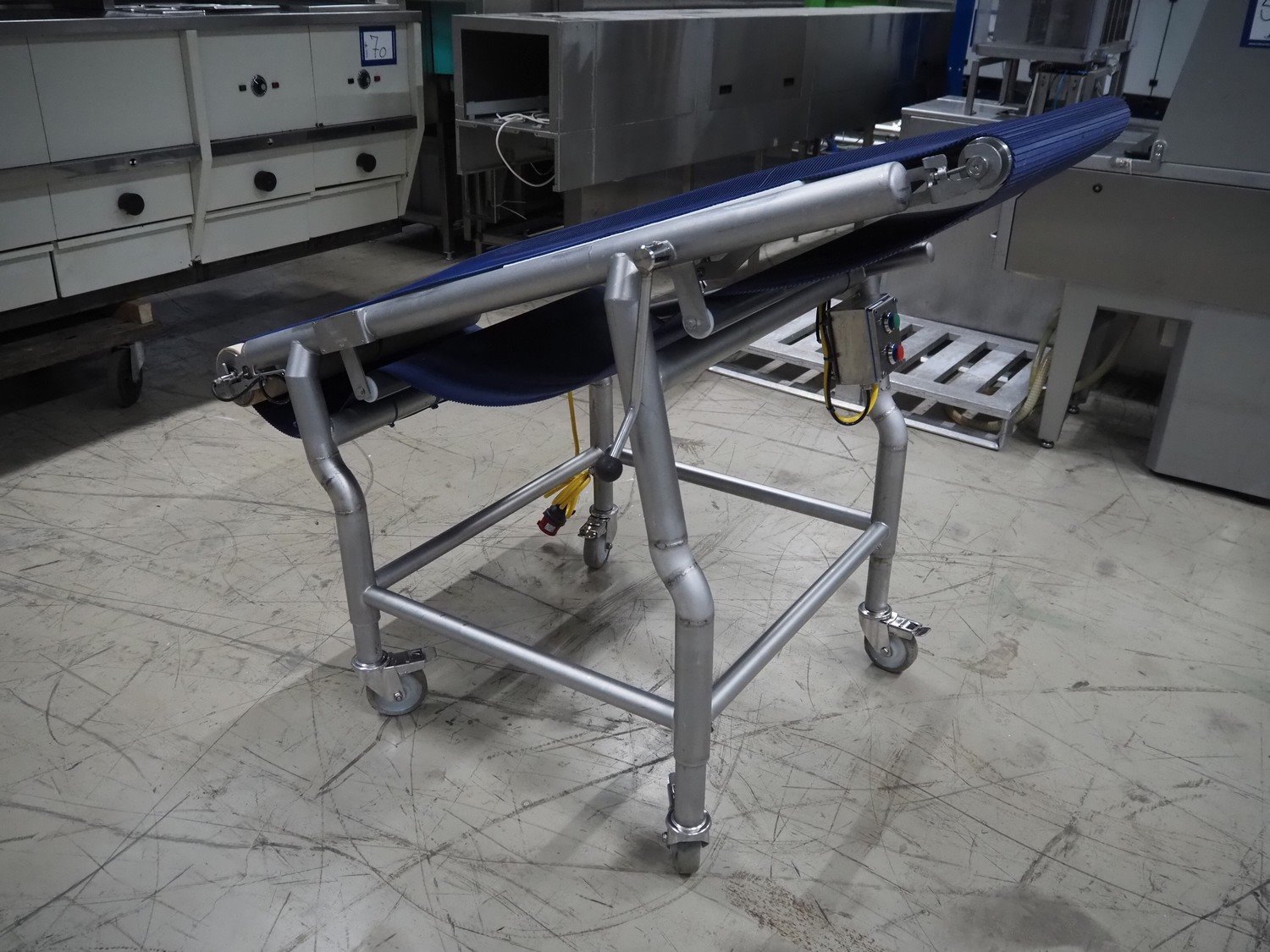Food Technik mobile elevating belt, s/s frame, plastic belt, belt width: 700 mm, elevating height: 1300 mm, total dimensions: 1600 mm x 980 mm x 1300 mm.