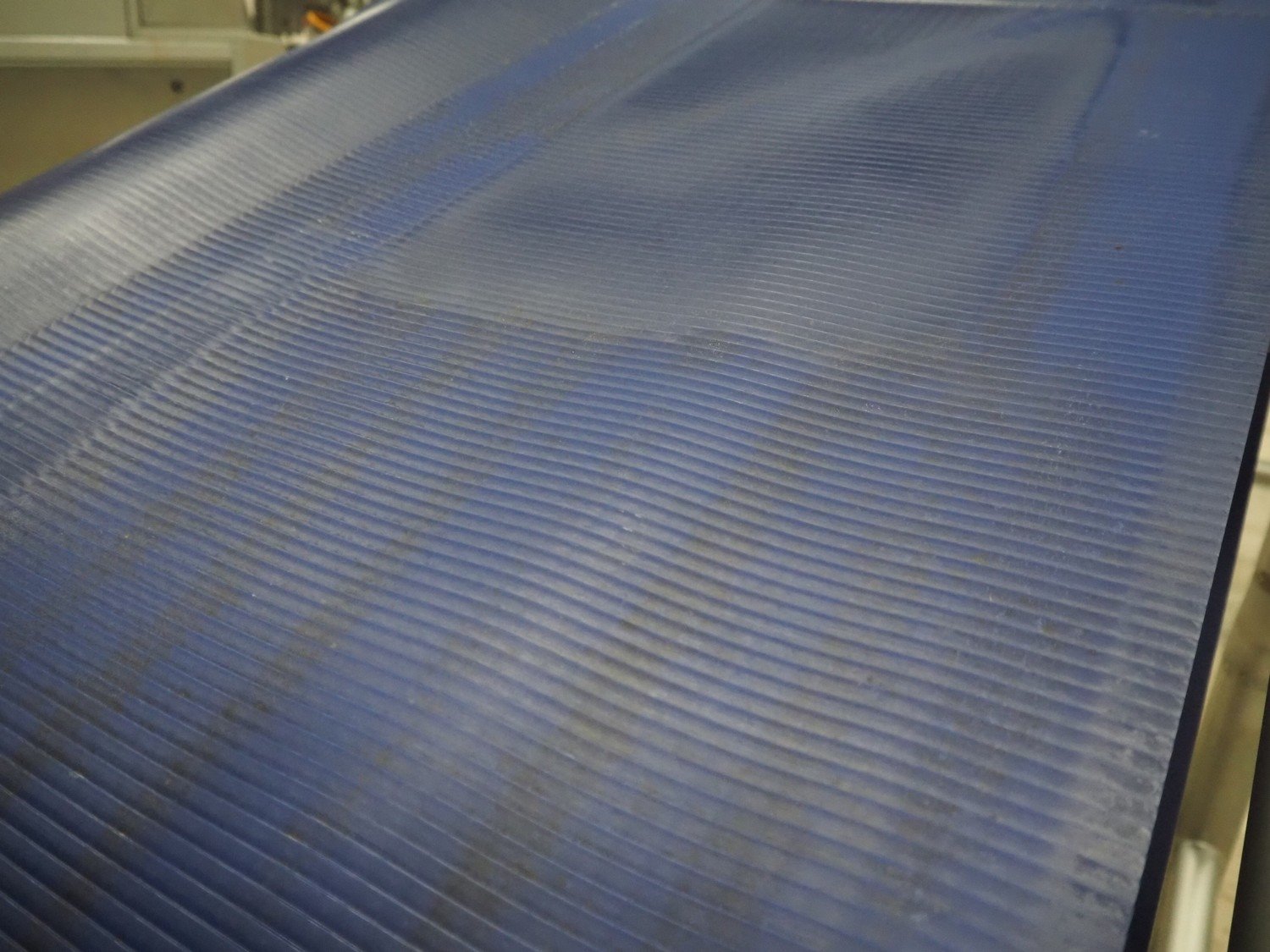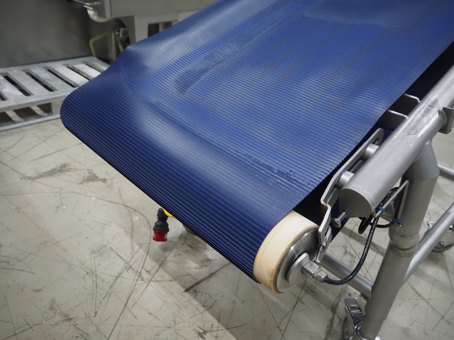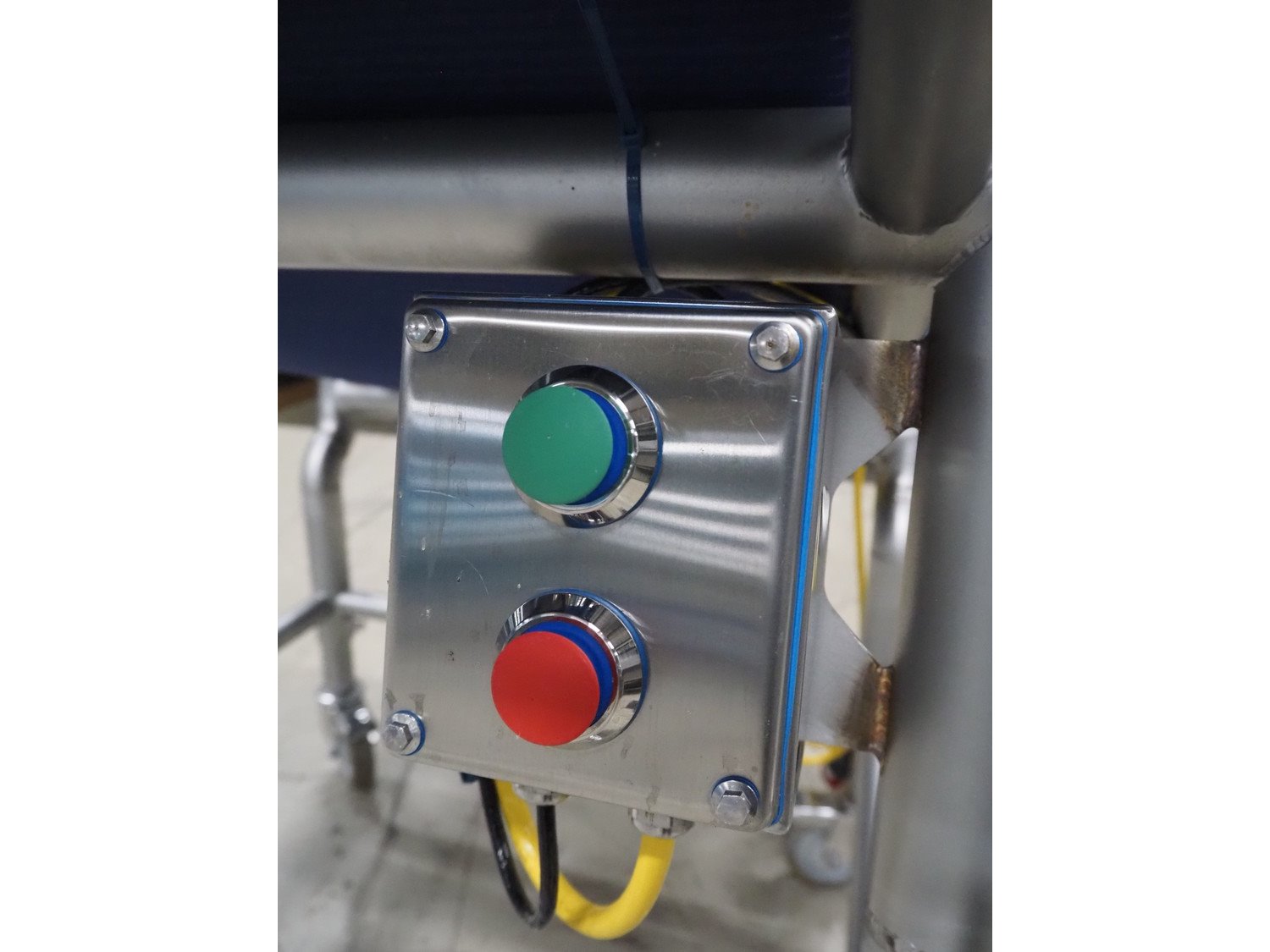 Food Technik mobile elevating belt, s/s frame, plastic belt, belt width: 700 mm, elevating height: 1300 mm, total dimensions: 1600 mm x 980 mm x 1300 mm.