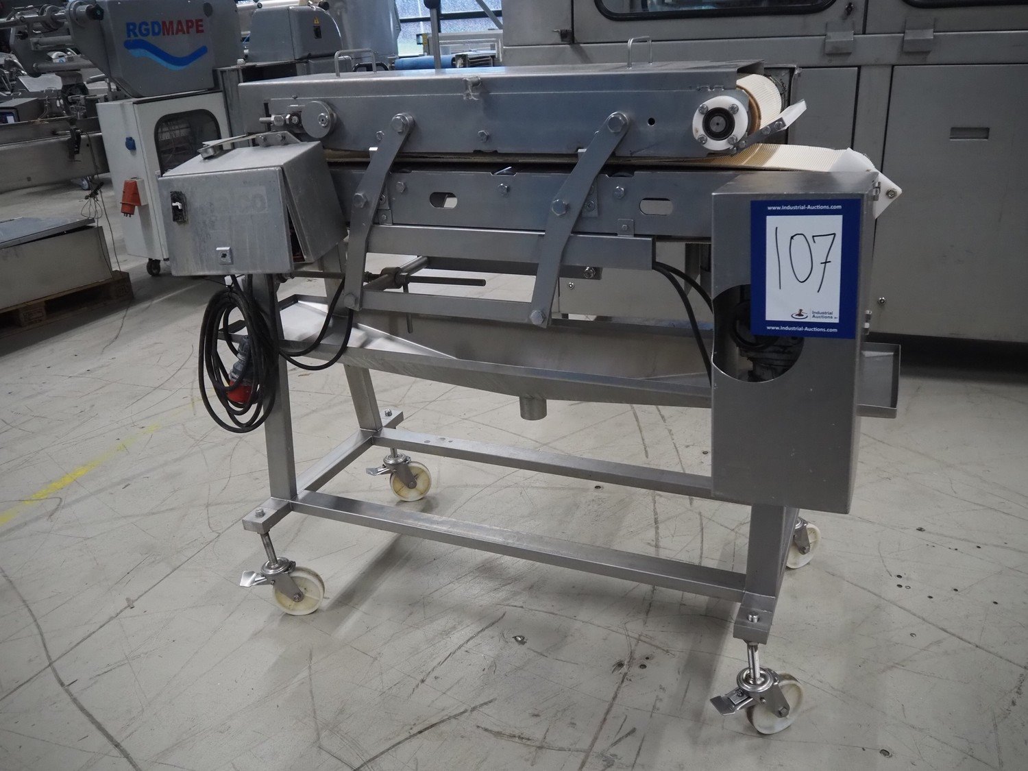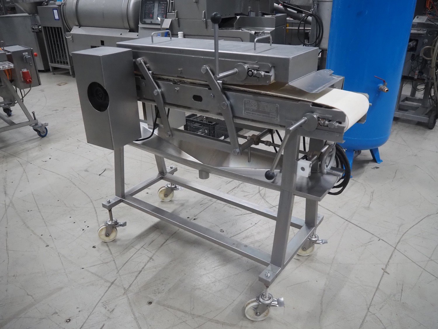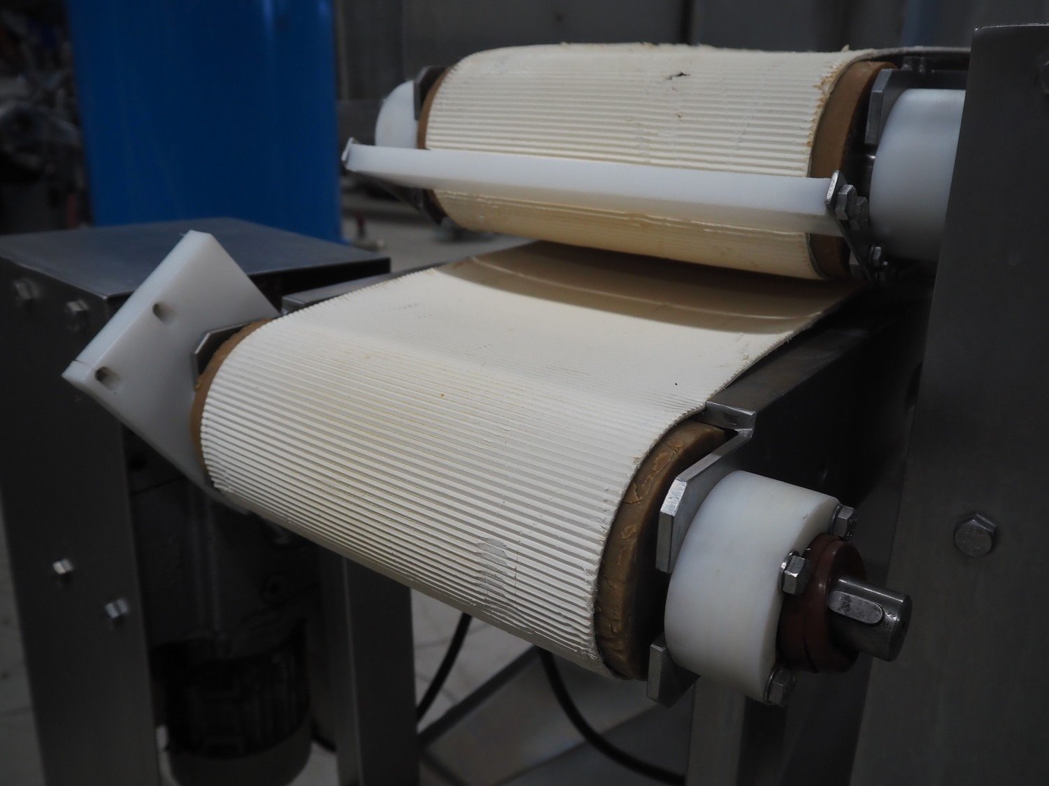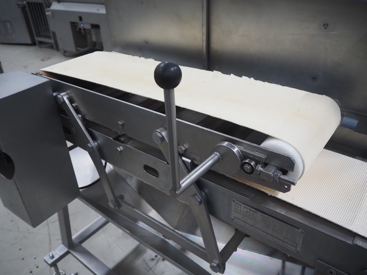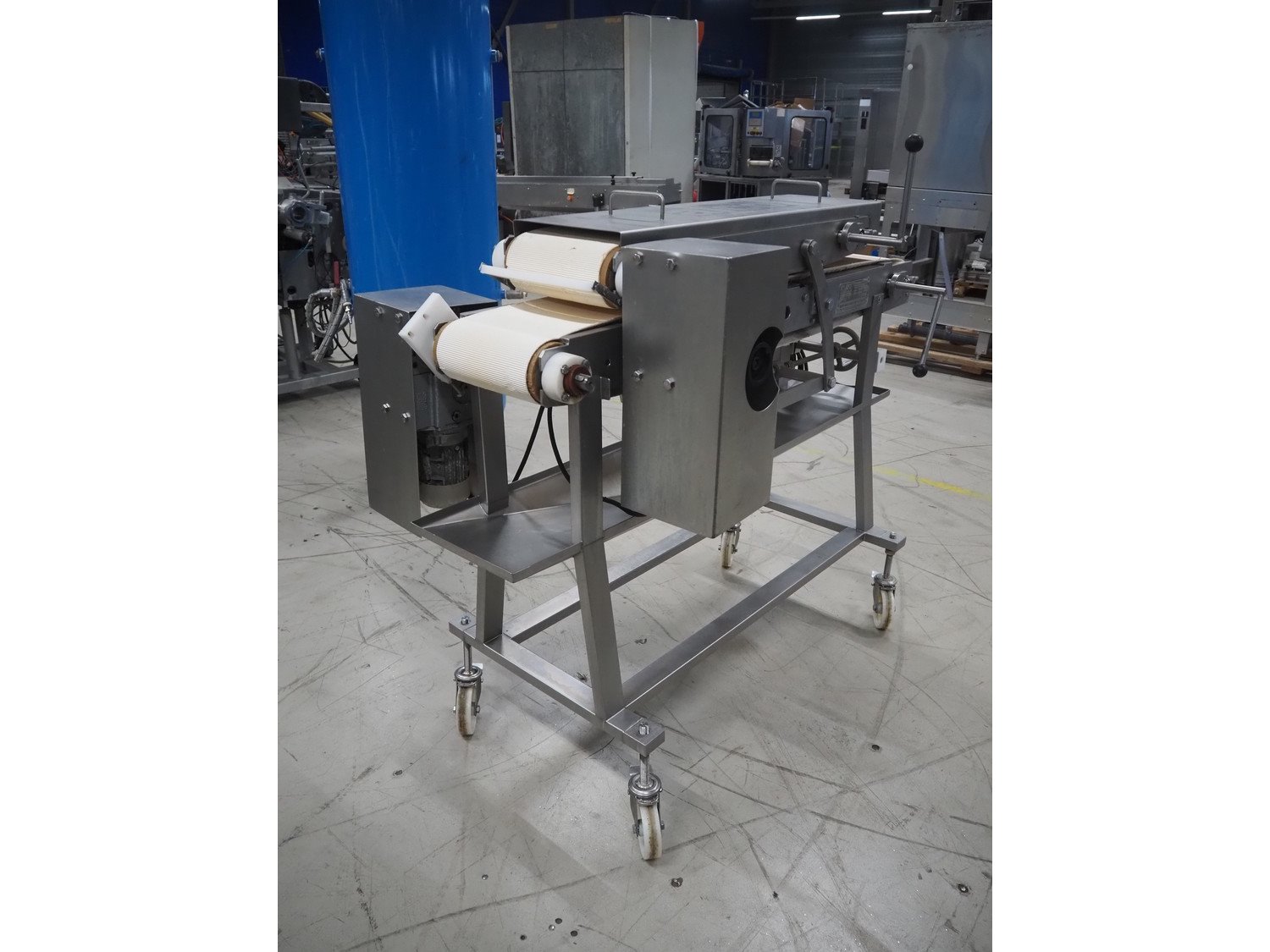 Alco mobile flattening machine, type: ASP 250, serial number: 19301213, year of construction: 2002, 400 V, (2x) 0.18 kW, 260 kg, plastic belt, belt width: (1x) 245 mm, (1x) 250 mm, total dimensions: 1600 mm x 650 mm x 1410 mm. Technical condition unknown.