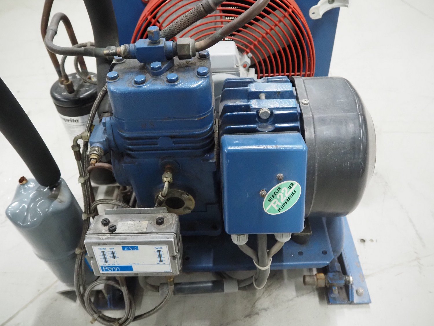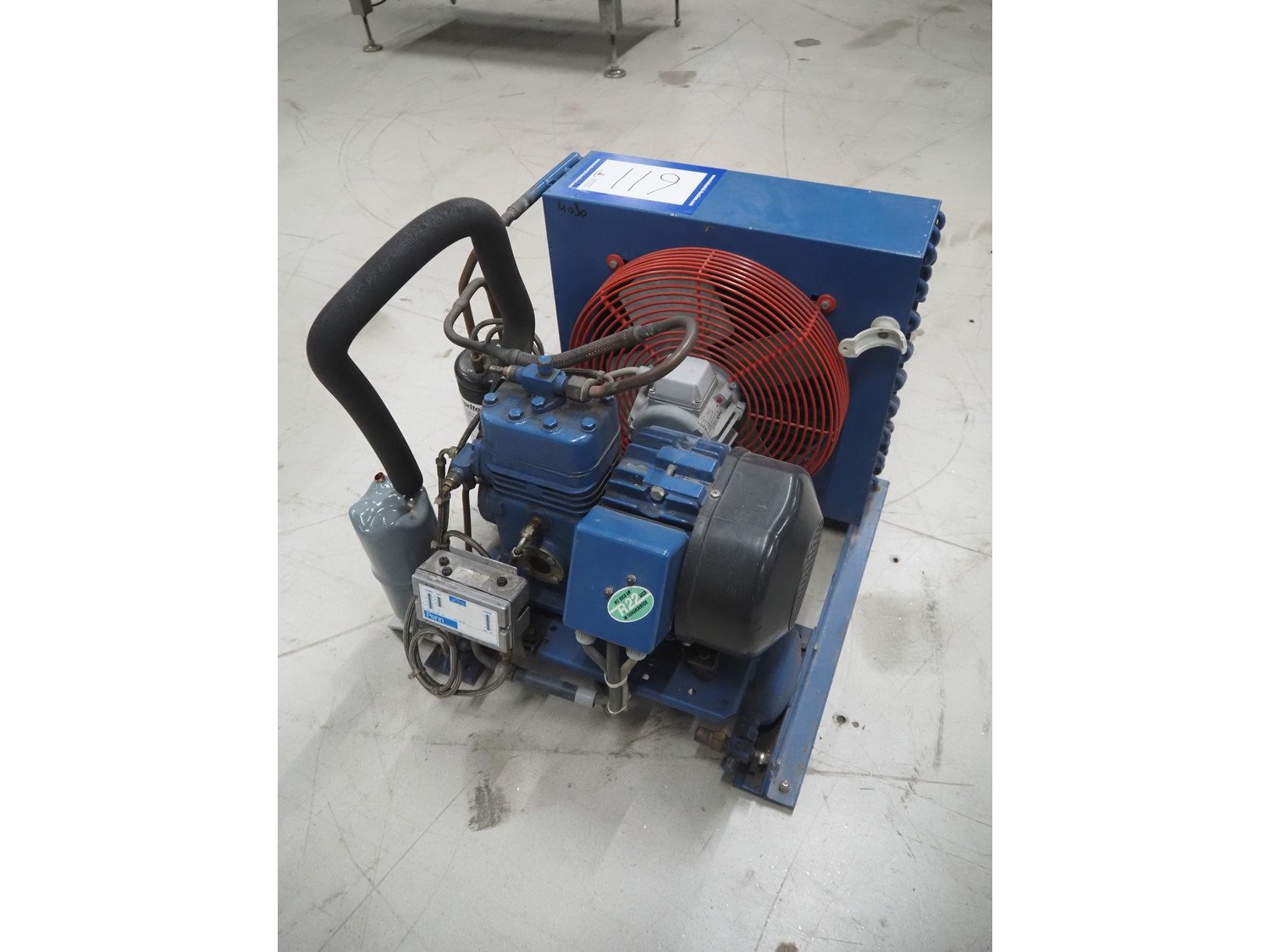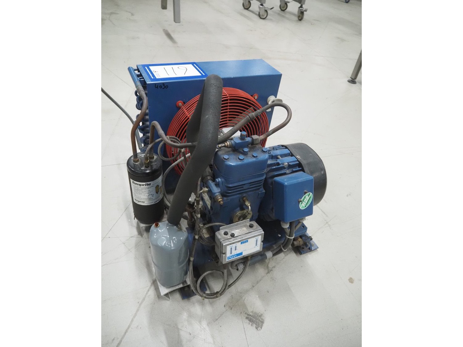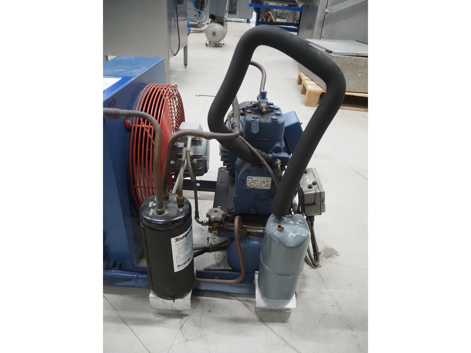 Bock condensing unit with cooling compressor, type: AM2/58-4S, number: W24452, year of construction: 1990, 220/380 V, 50 Hz, 5.4/3.1 A, capacity: 4.93 m³ per hour, dimensions: 650 mm x 550 mm x 630 mm.