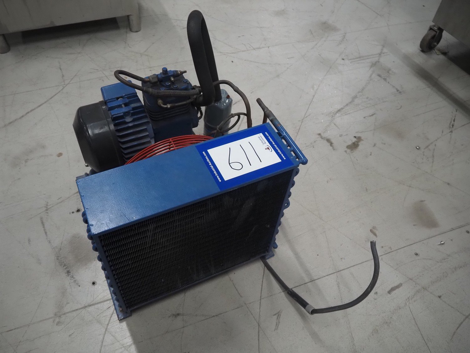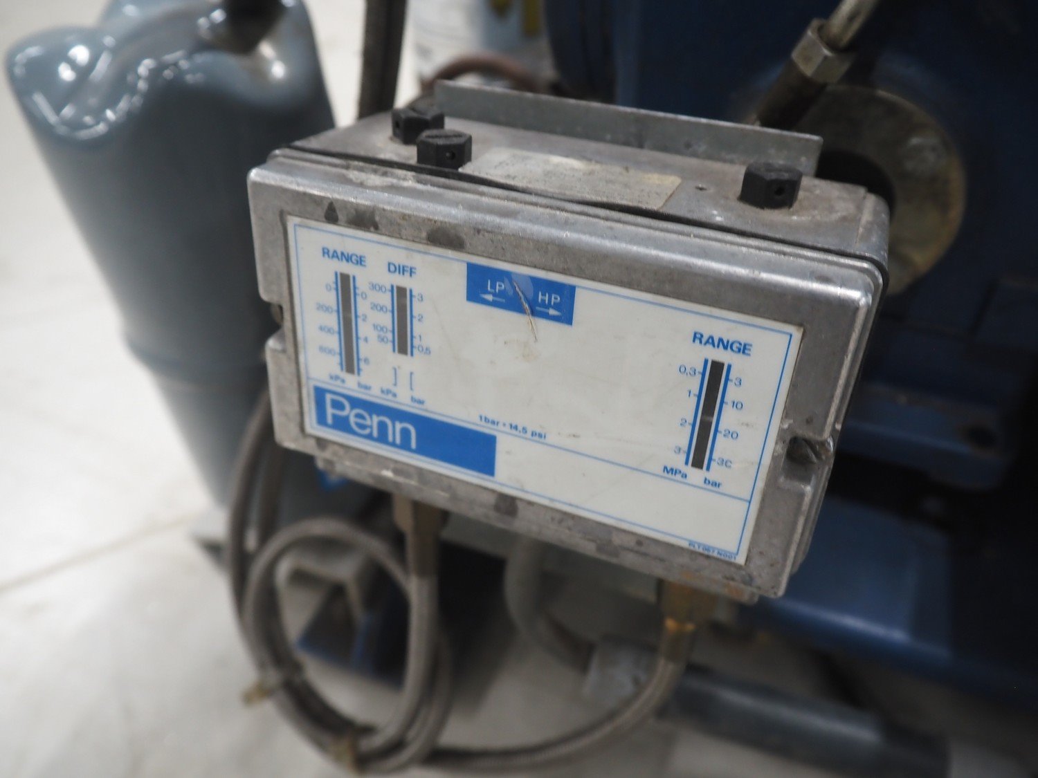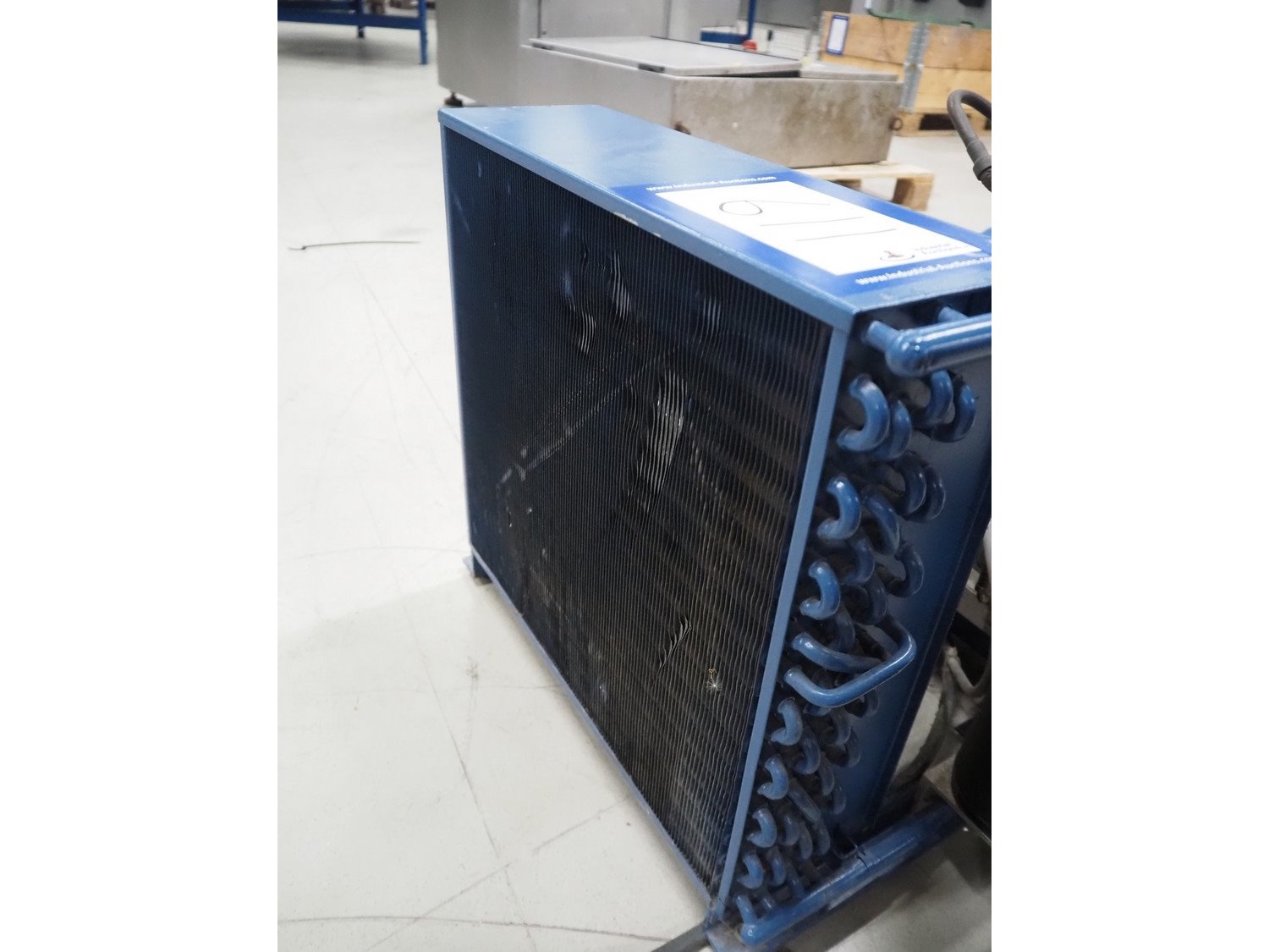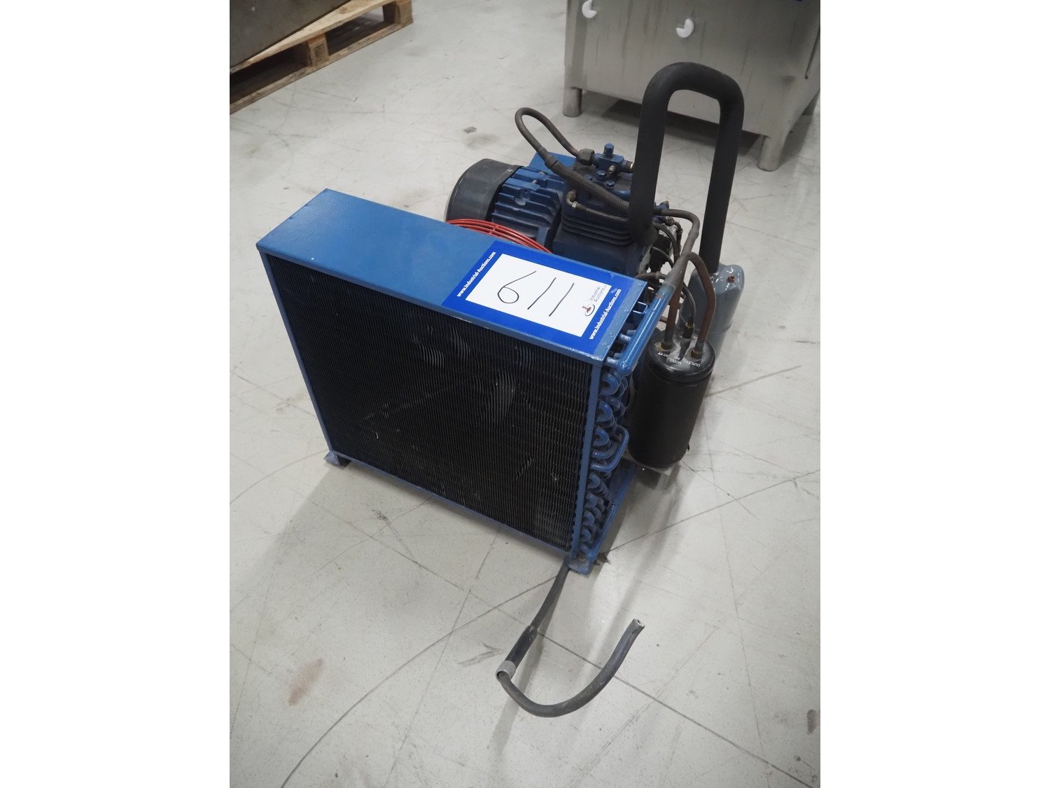 Bock condensing unit with cooling compressor, type: AM2/58-4S, number: W24452, year of construction: 1990, 220/380 V, 50 Hz, 5.4/3.1 A, capacity: 4.93 m³ per hour, dimensions: 650 mm x 550 mm x 630 mm.