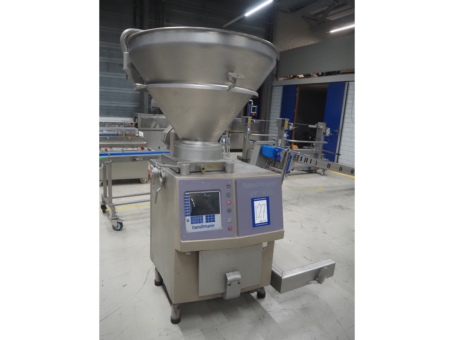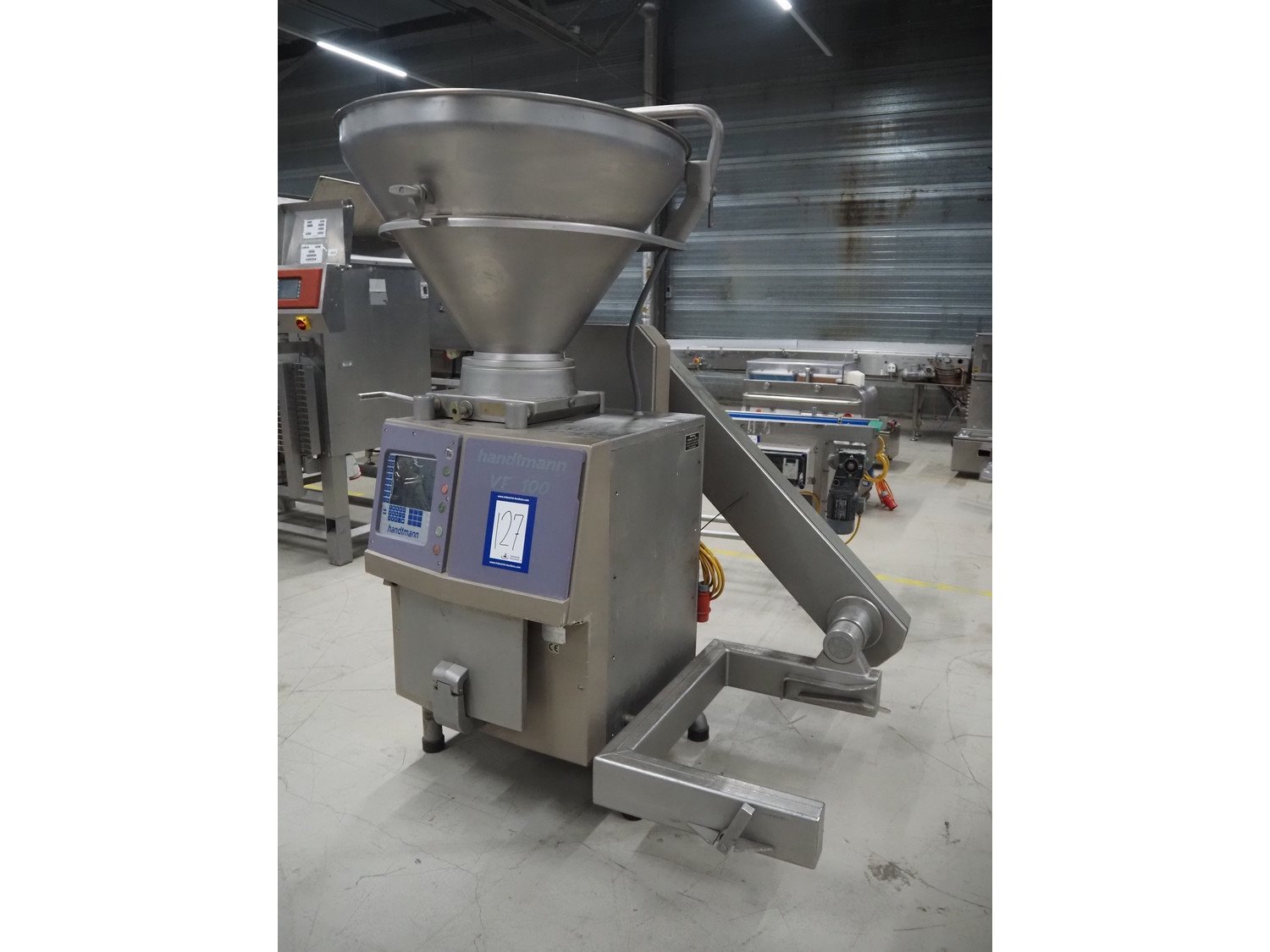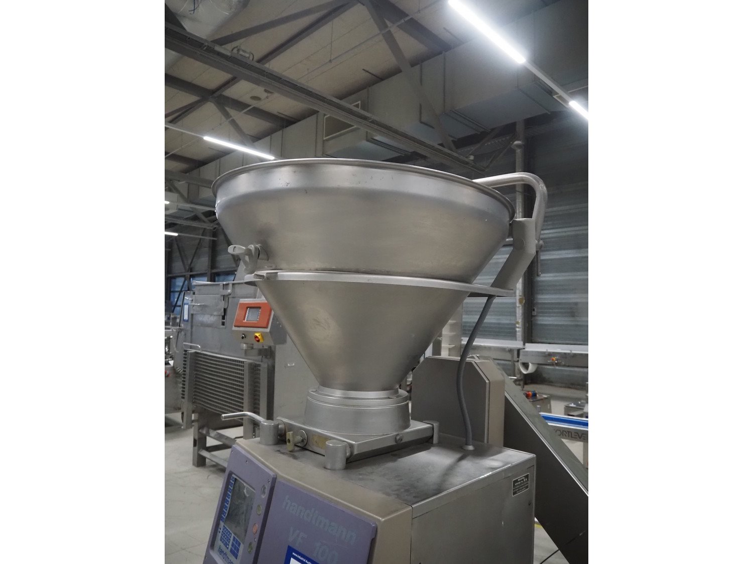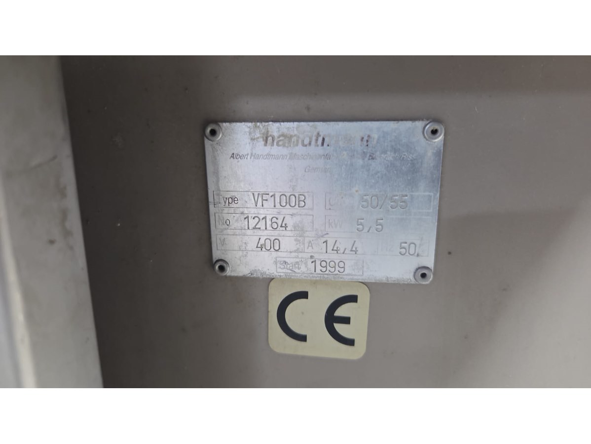 Handtmann vacuum filling machine with lifter for 200 liter meat bins, type: VF100B, number: 12164, year of construction: 1999, 400 V, 50 Hz, 14.4 A, 5.5 kW, Becker vacuum pump, type: U1.16SA-31, number: B3312970, year of construction: 2019, 16/19 m³ per hour, dimensions: 1650 mm x 1350 mm x 2100 mm.