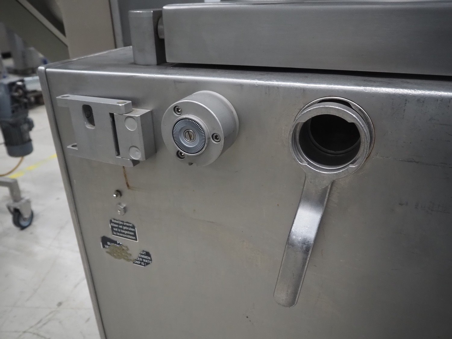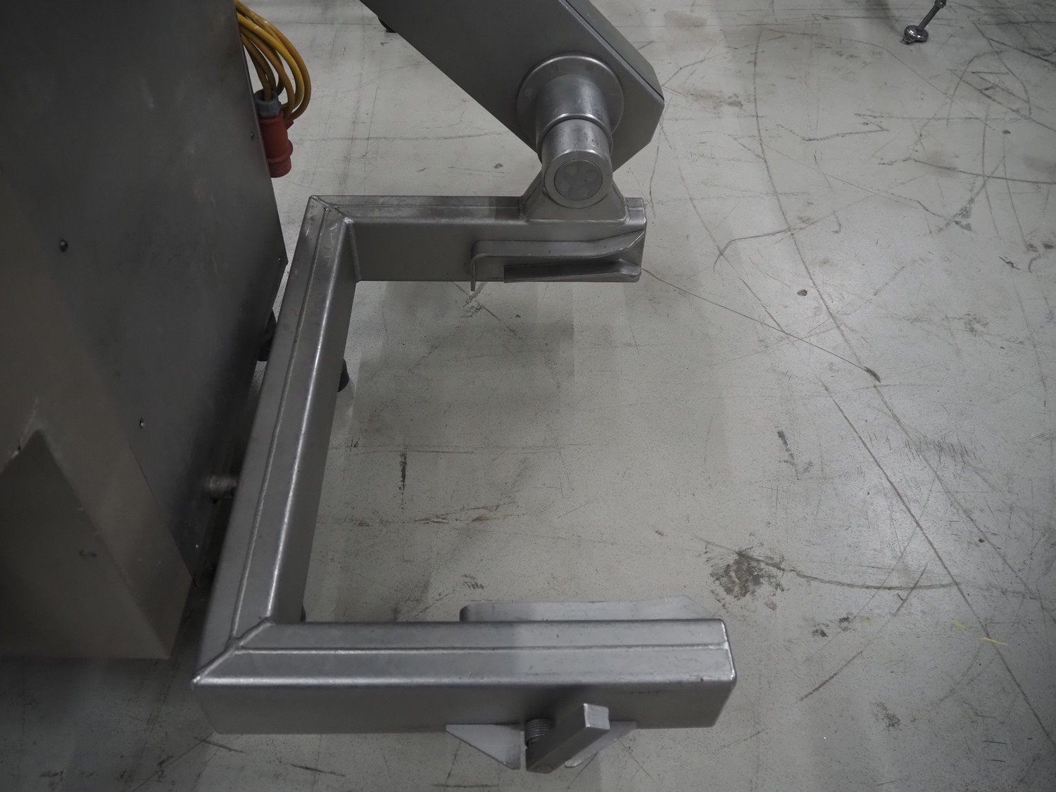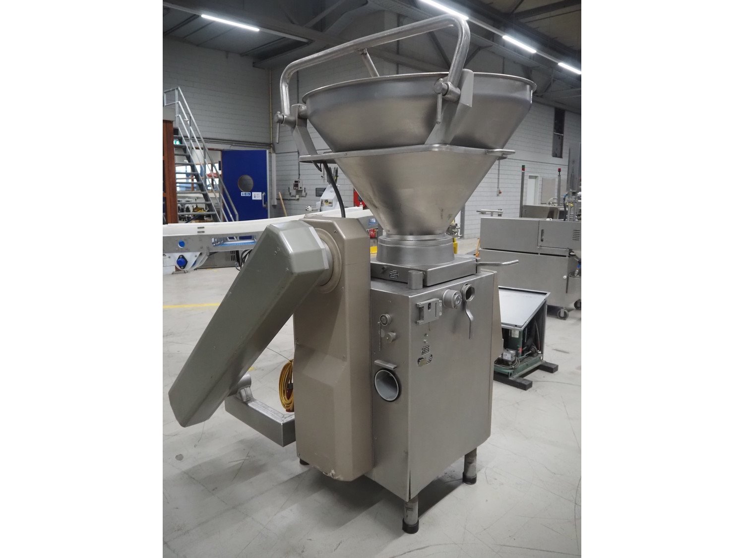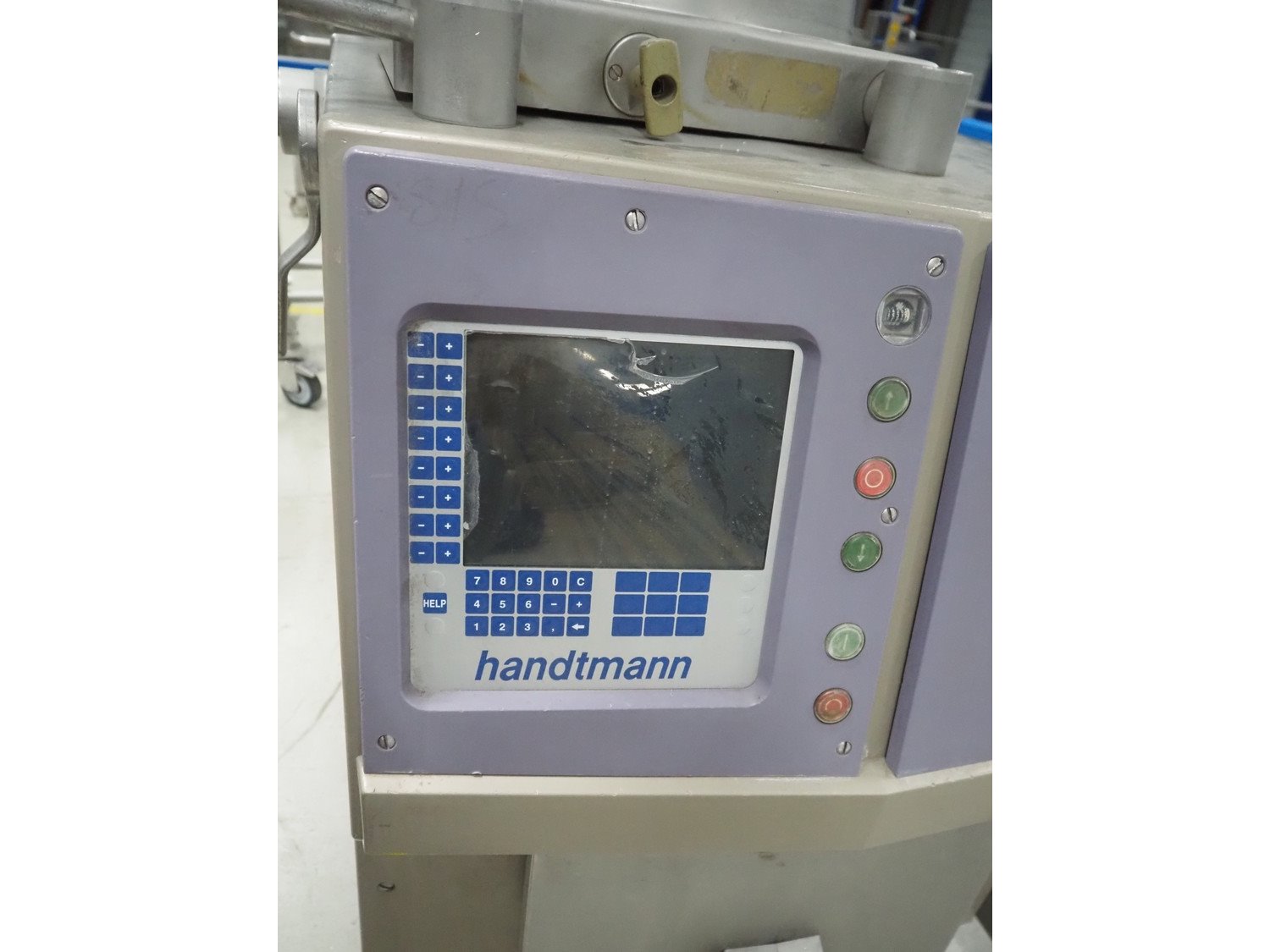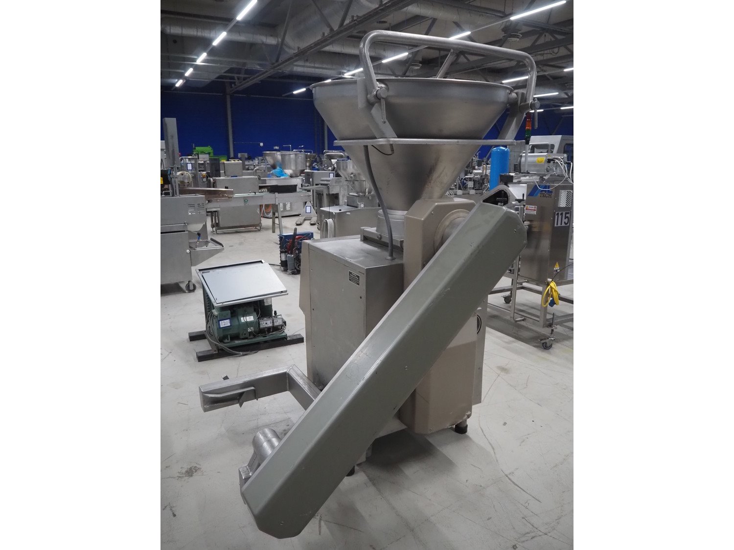 Handtmann vacuum filling machine with lifter for 200 liter meat bins, type: VF100B, number: 12164, year of construction: 1999, 400 V, 50 Hz, 14.4 A, 5.5 kW, Becker vacuum pump, type: U1.16SA-31, number: B3312970, year of construction: 2019, 16/19 m³ per hour, dimensions: 1650 mm x 1350 mm x 2100 mm.