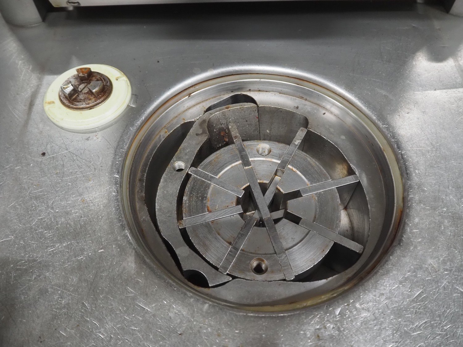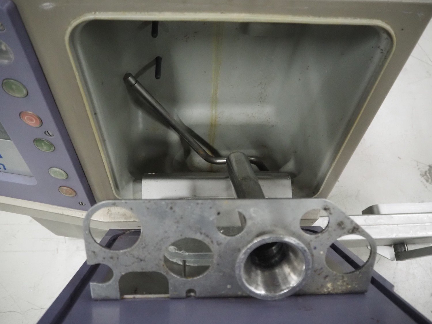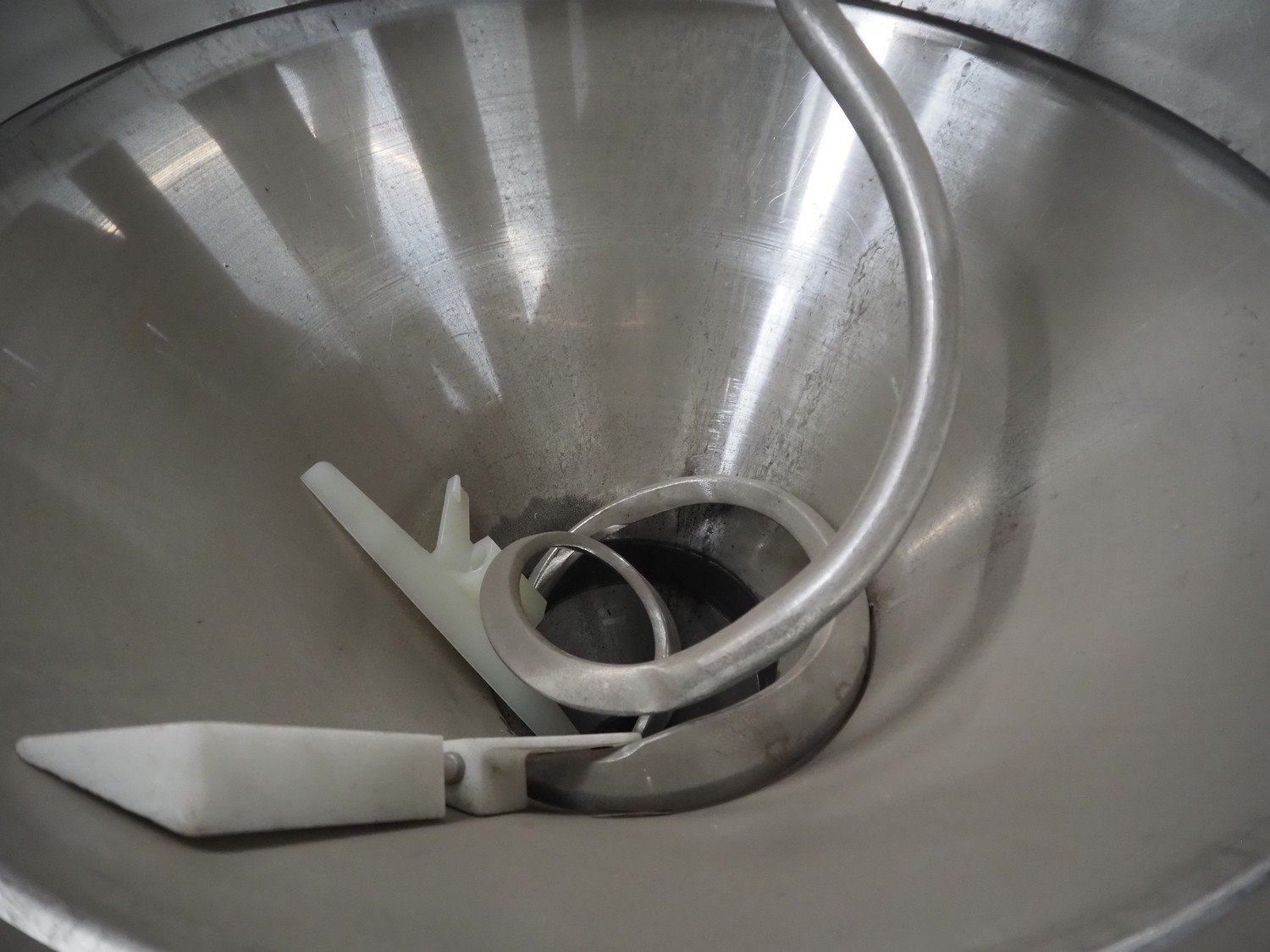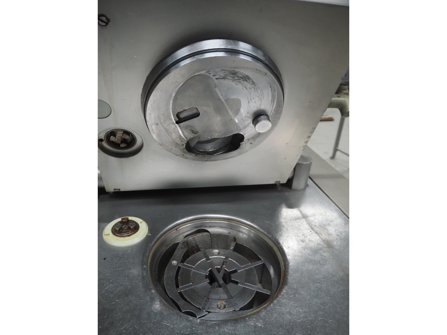 Handtmann vacuum filling machine with lifter for 200 liter meat bins, type: VF100B, number: 12164, year of construction: 1999, 400 V, 50 Hz, 14.4 A, 5.5 kW, Becker vacuum pump, type: U1.16SA-31, number: B3312970, year of construction: 2019, 16/19 m³ per hour, dimensions: 1650 mm x 1350 mm x 2100 mm.