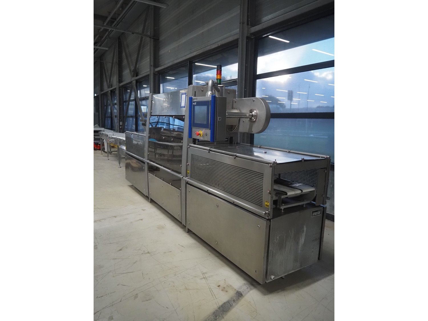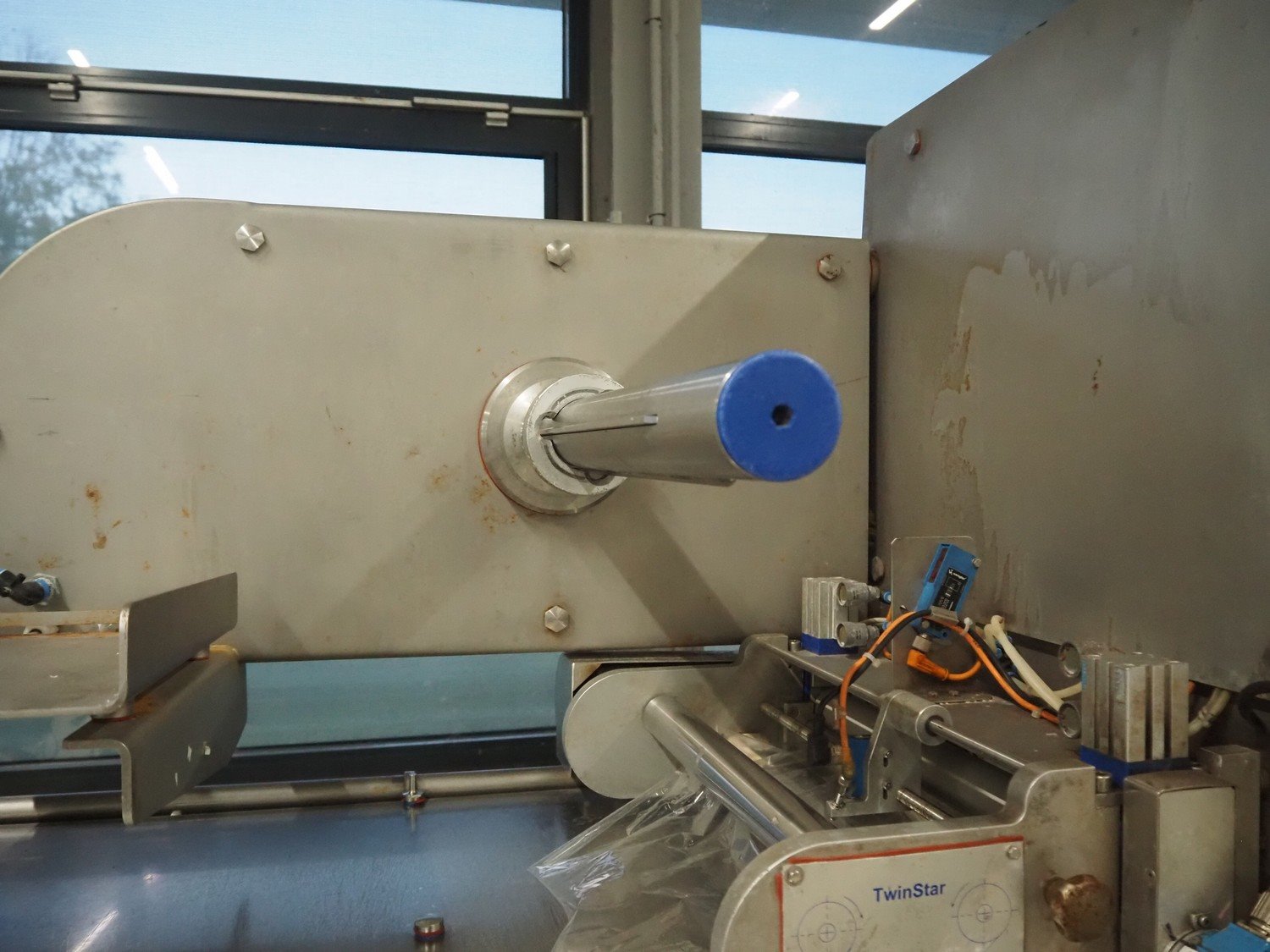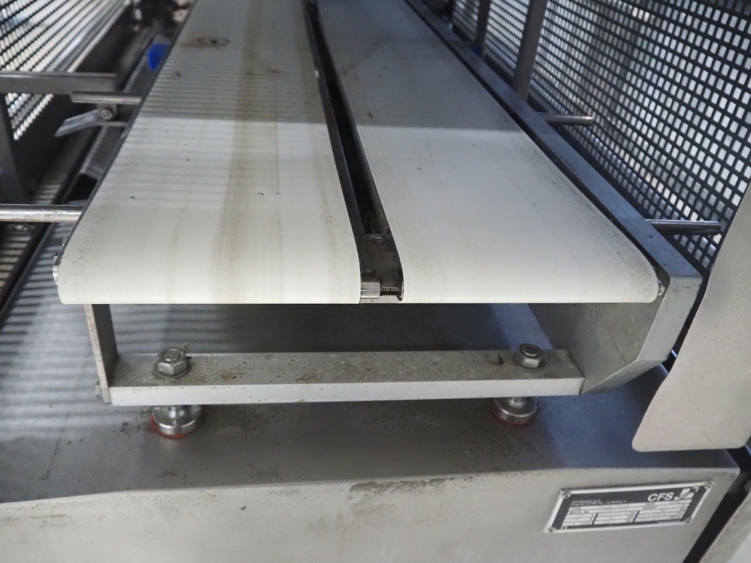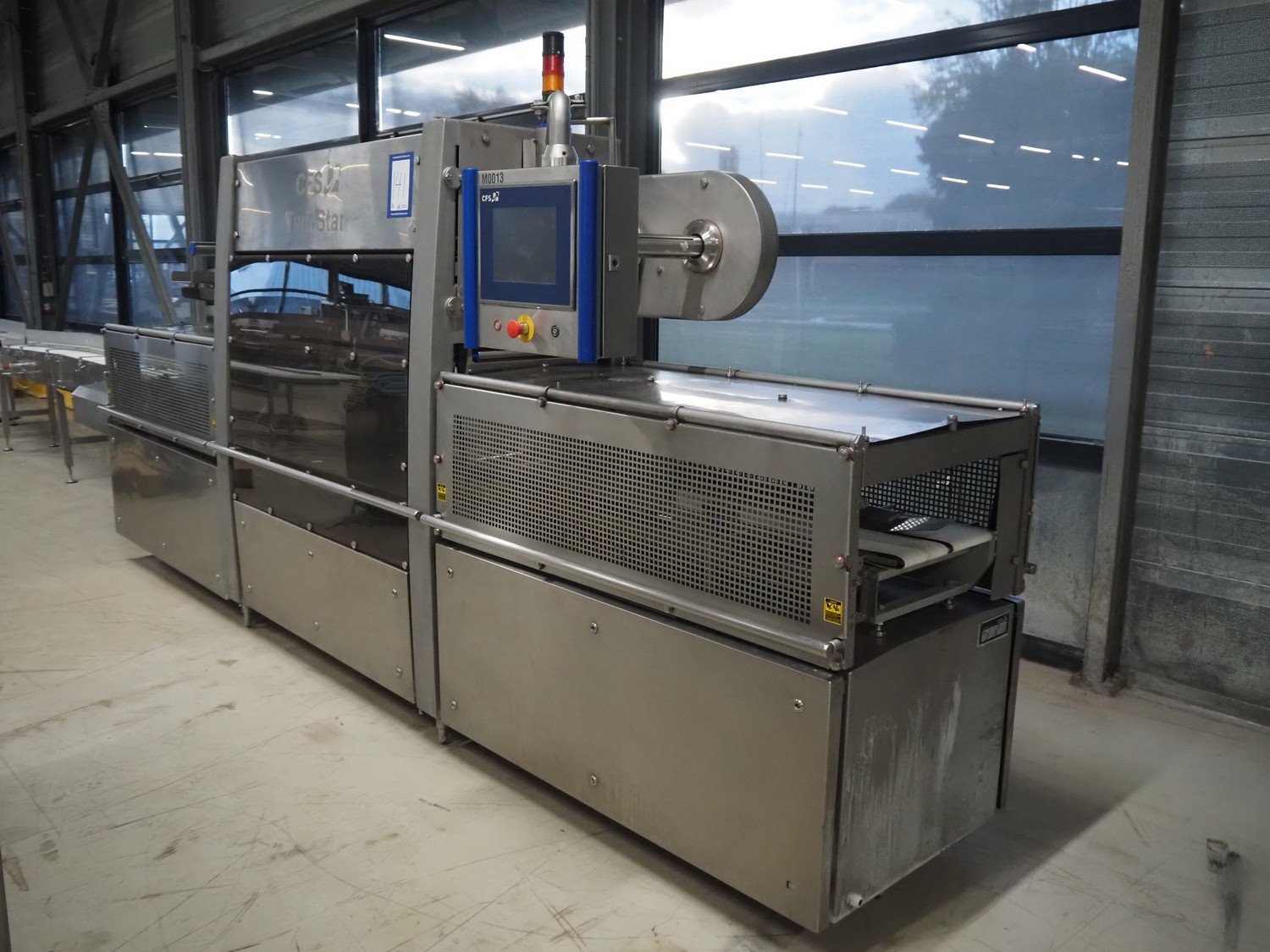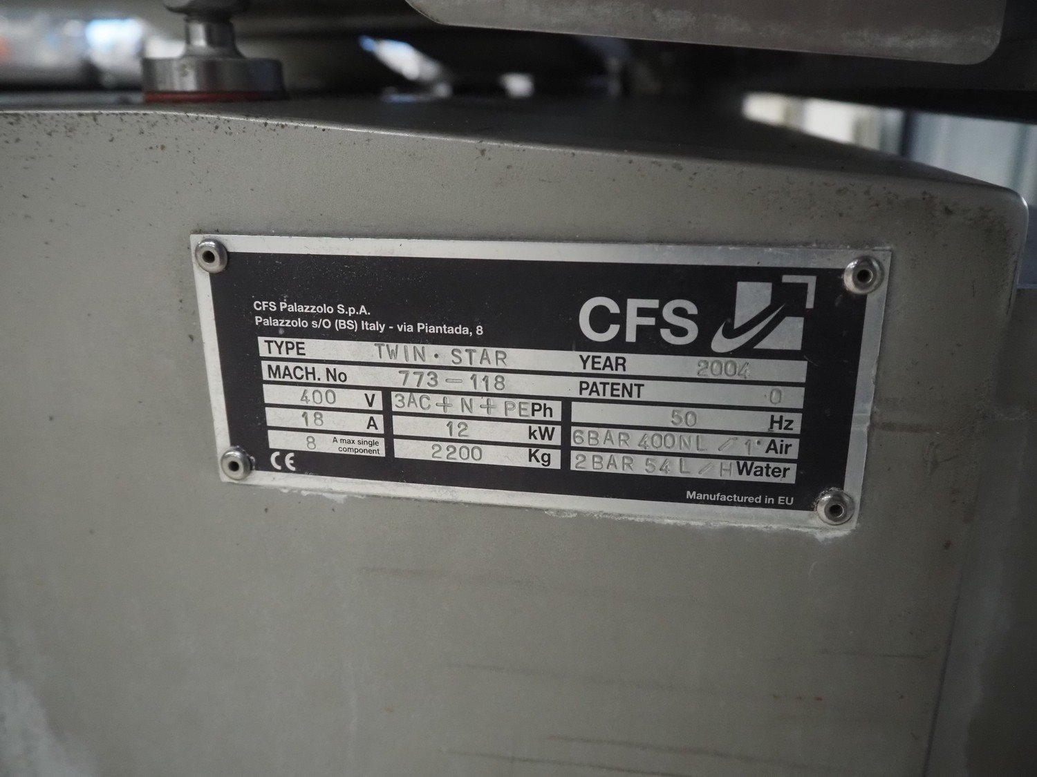 CFS traysealer, type: Twin Star, machine number: 773-118, year of construction: 2004, 400 V, 3 Ph, 50 Hz, 18 A, 12 kW, 2200 kg, plastic mesh infeed belts, belt width: (2x) 170 mm, total dimensions: 4600 mm x 1100 mm x 2200 mm, 2100 mm x 600 mm x 1100 mm and 4000 mm x 1000 mm x 1100 mm. With pallet with spacers and 2 trolleys for changing dyes, dimensions pallet: 2000 mm x 1300 mm x 900 mm, dimensions trolleys: (2x) 1900 mm x 1100 mm x 1350 mm. Incomplete.