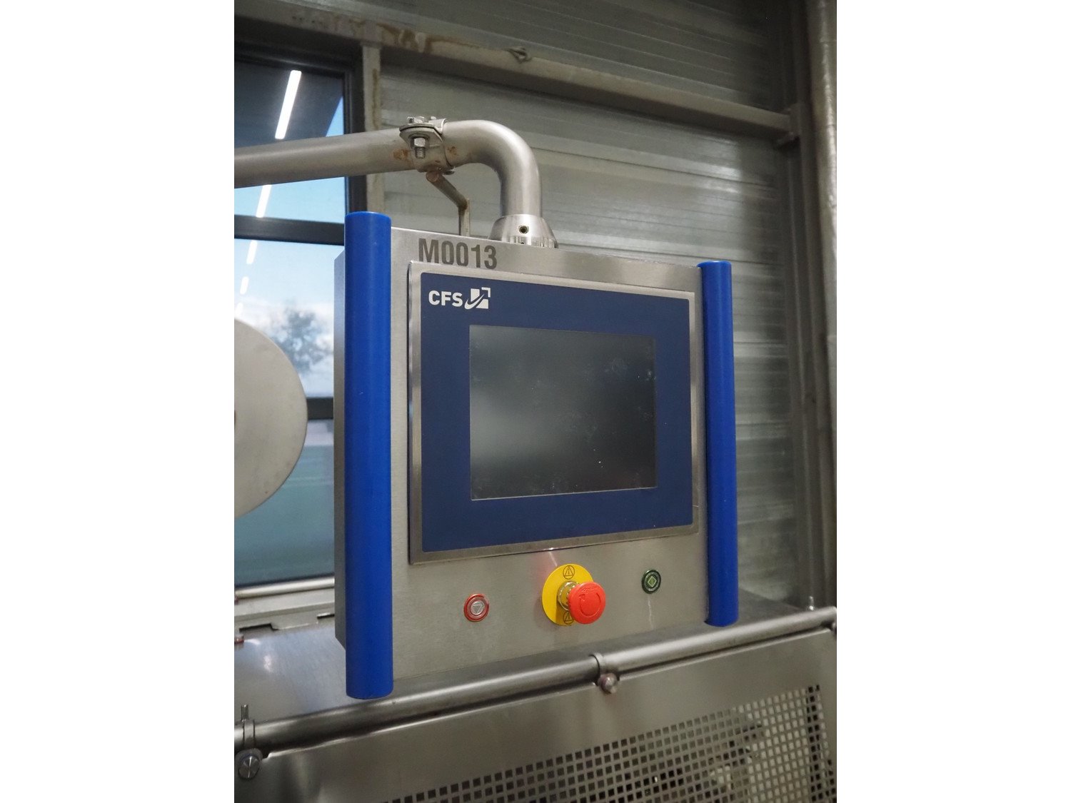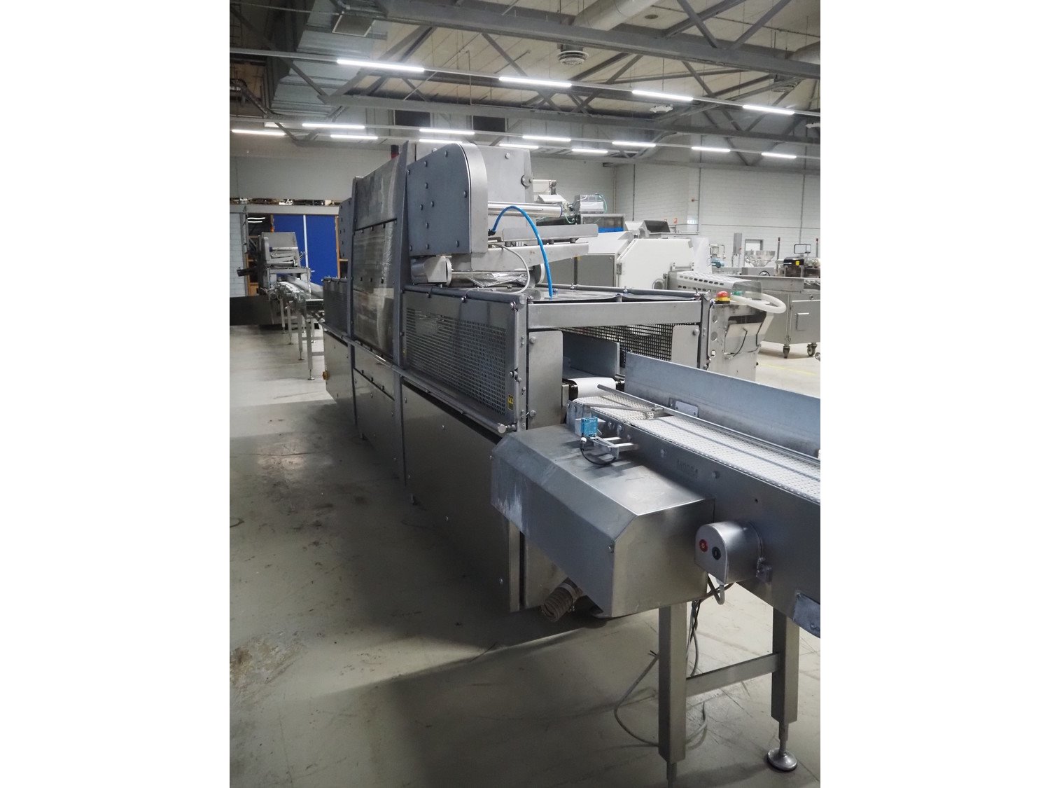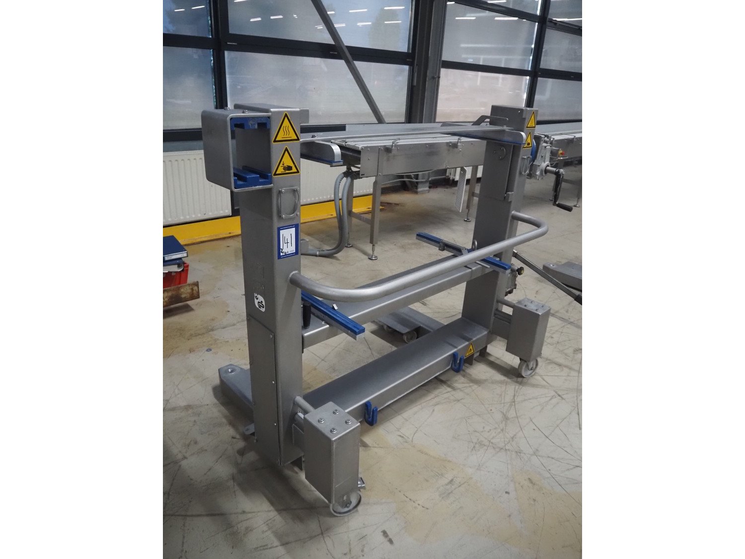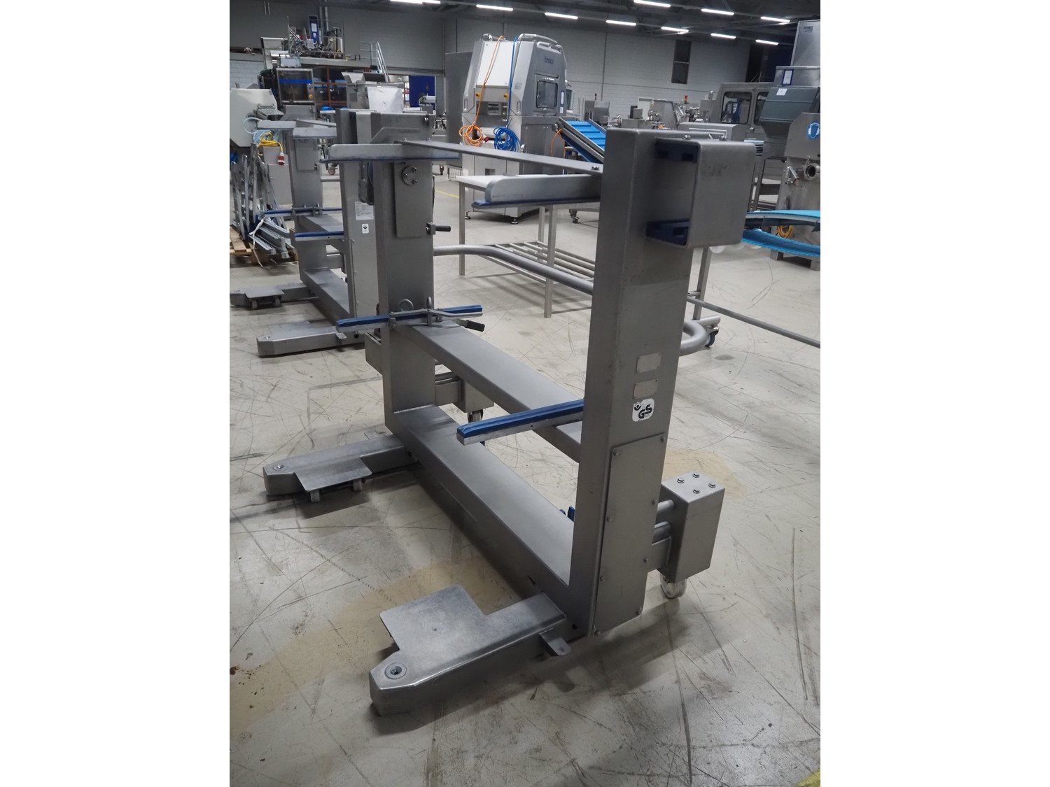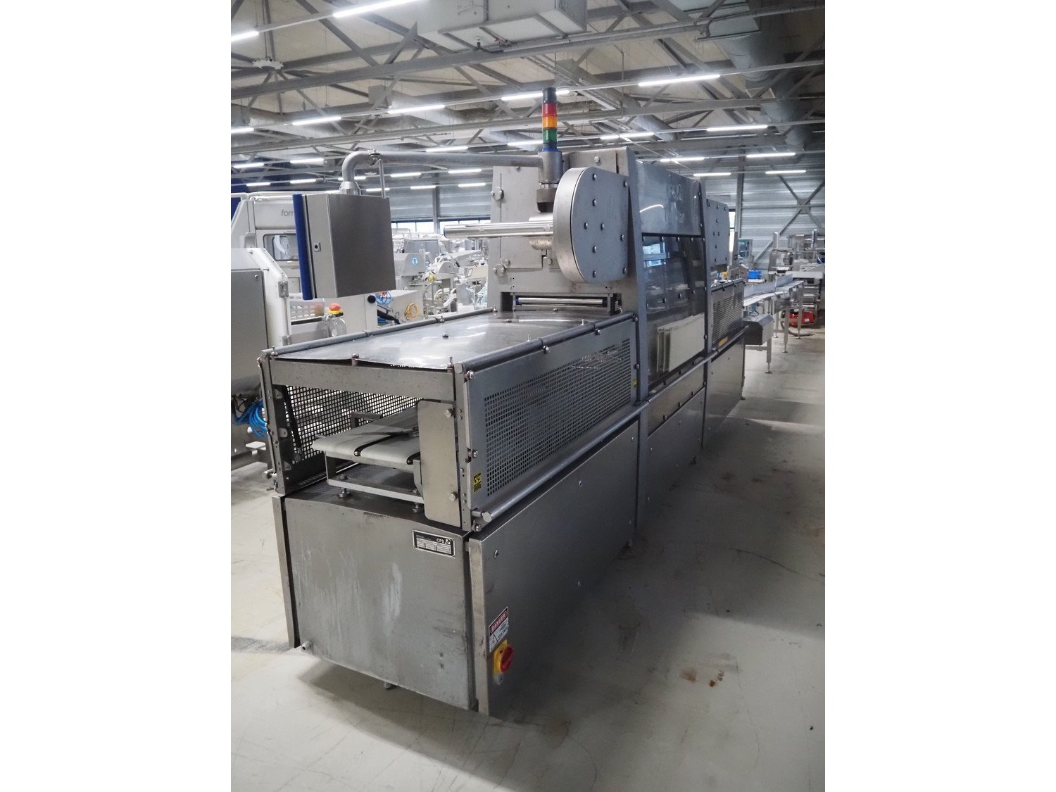 CFS traysealer, type: Twin Star, machine number: 773-118, year of construction: 2004, 400 V, 3 Ph, 50 Hz, 18 A, 12 kW, 2200 kg, plastic mesh infeed belts, belt width: (2x) 170 mm, total dimensions: 4600 mm x 1100 mm x 2200 mm, 2100 mm x 600 mm x 1100 mm and 4000 mm x 1000 mm x 1100 mm. With pallet with spacers and 2 trolleys for changing dyes, dimensions pallet: 2000 mm x 1300 mm x 900 mm, dimensions trolleys: (2x) 1900 mm x 1100 mm x 1350 mm. Incomplete.