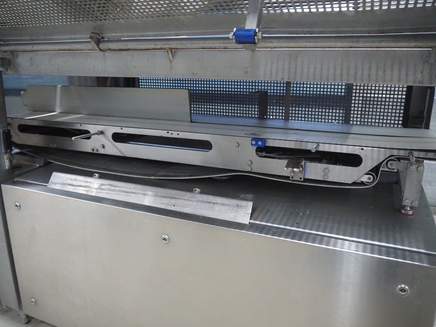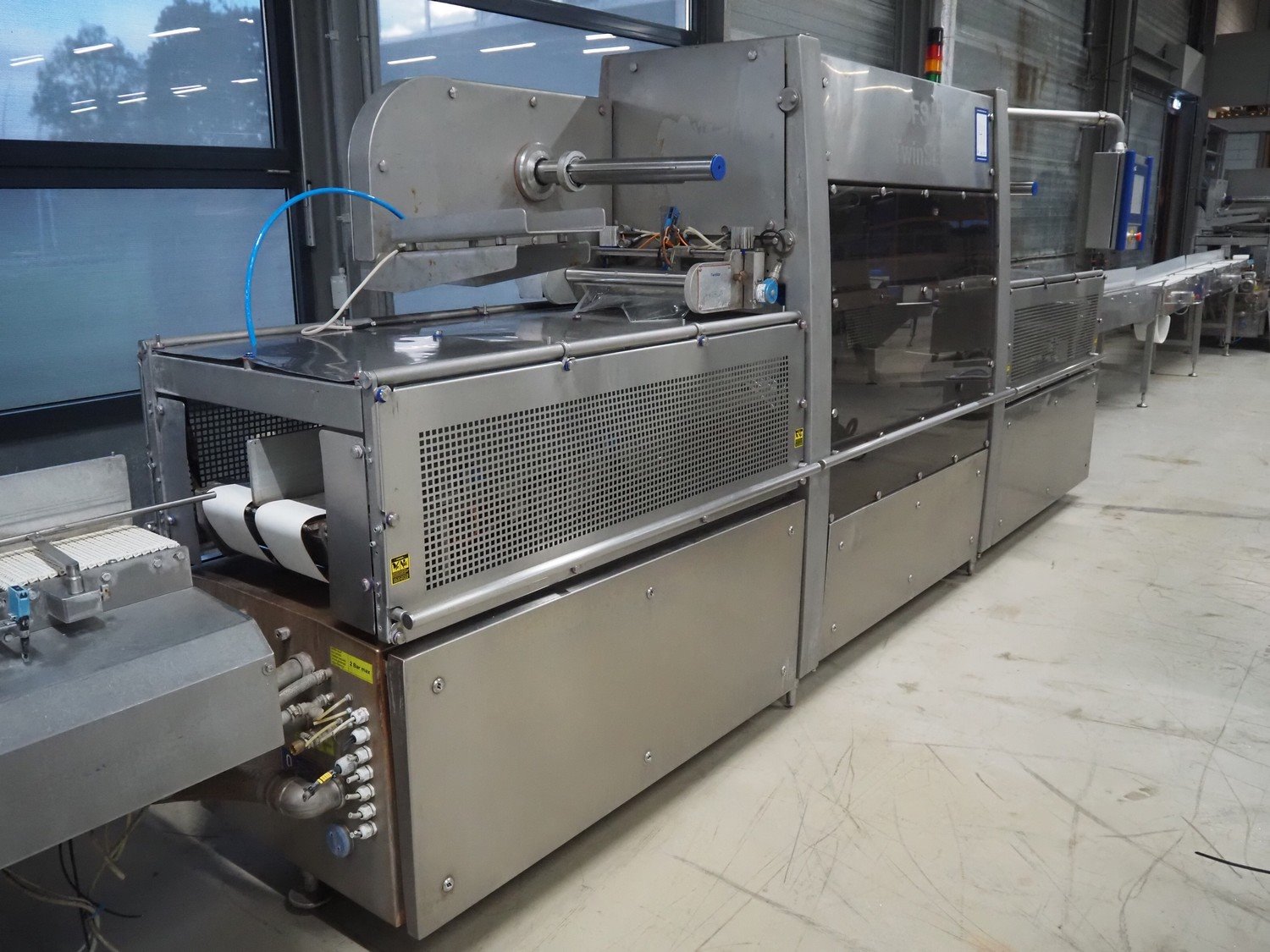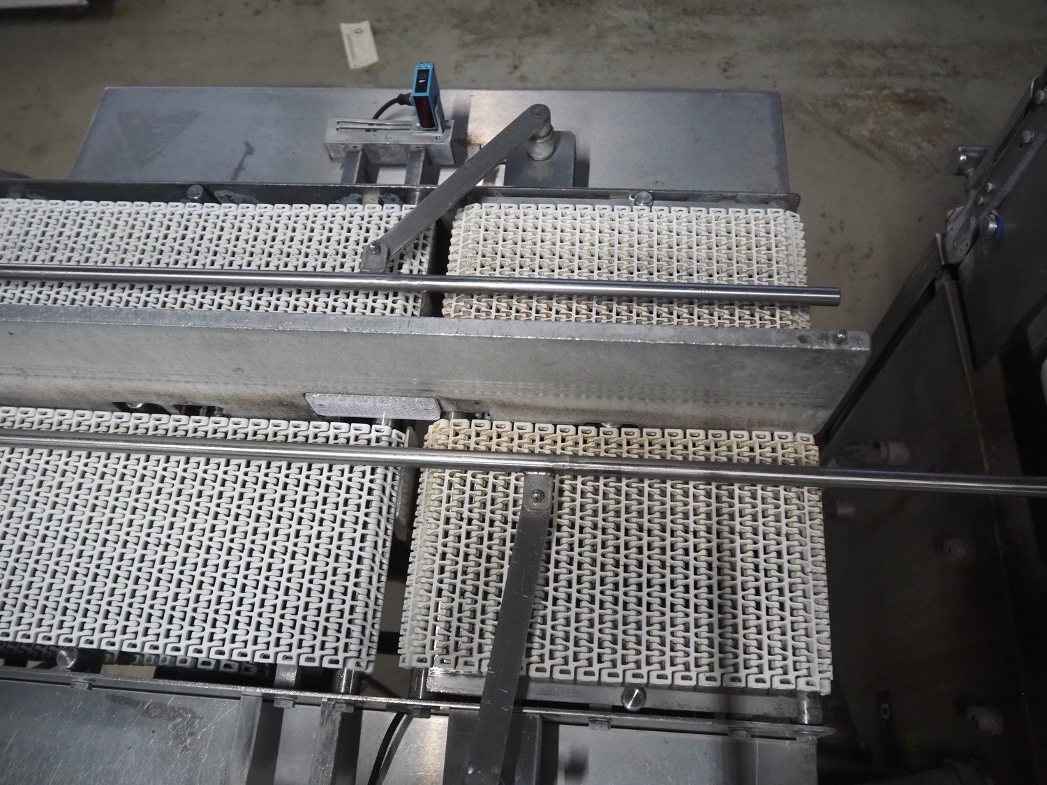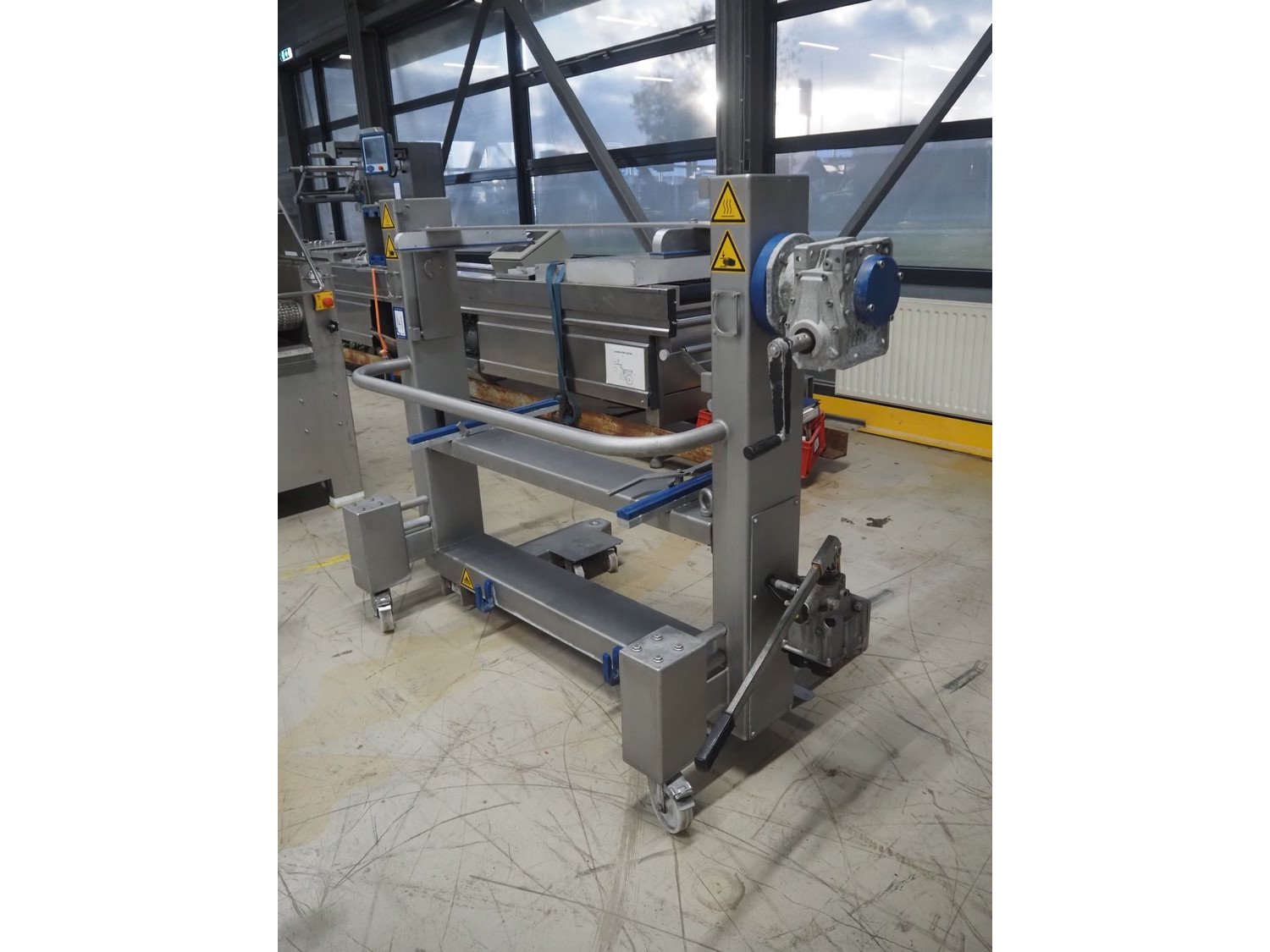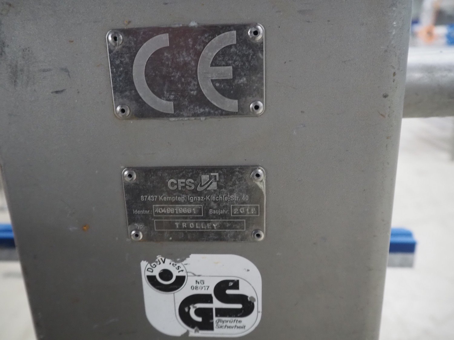 CFS traysealer, type: Twin Star, machine number: 773-118, year of construction: 2004, 400 V, 3 Ph, 50 Hz, 18 A, 12 kW, 2200 kg, plastic mesh infeed belts, belt width: (2x) 170 mm, total dimensions: 4600 mm x 1100 mm x 2200 mm, 2100 mm x 600 mm x 1100 mm and 4000 mm x 1000 mm x 1100 mm. With pallet with spacers and 2 trolleys for changing dyes, dimensions pallet: 2000 mm x 1300 mm x 900 mm, dimensions trolleys: (2x) 1900 mm x 1100 mm x 1350 mm. Incomplete.
