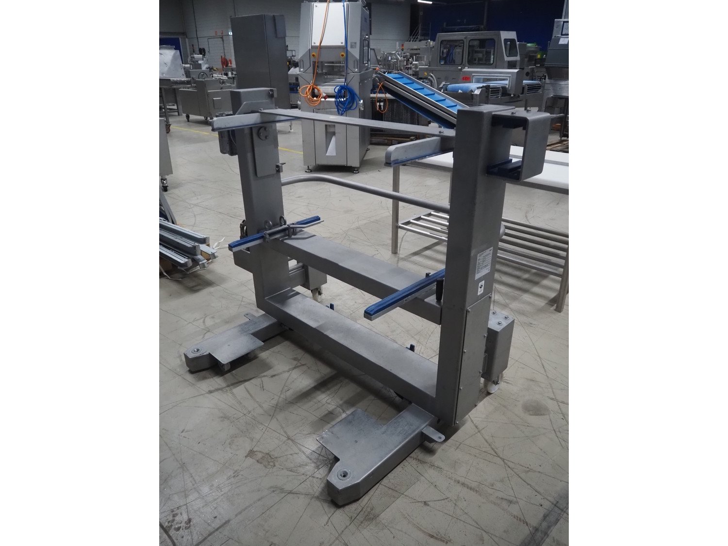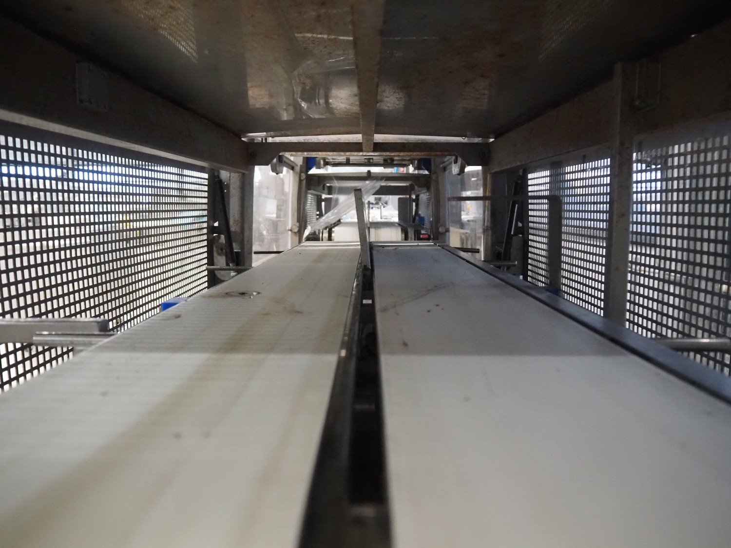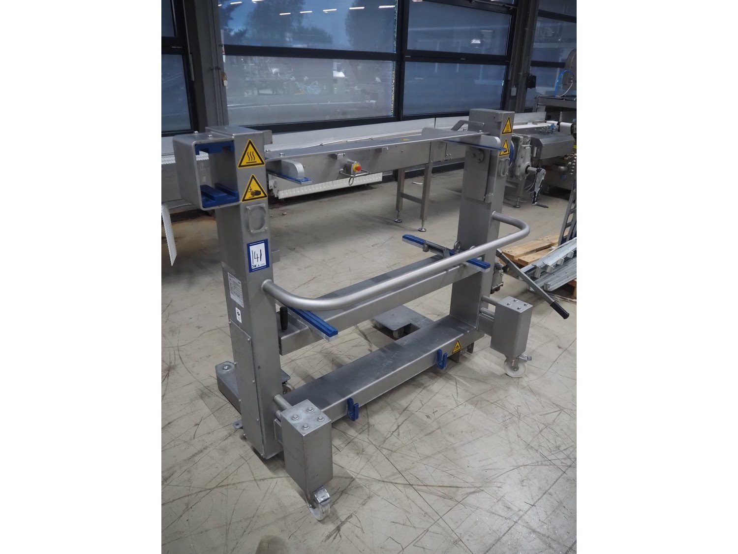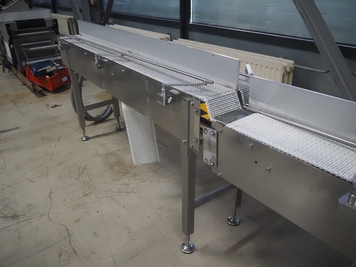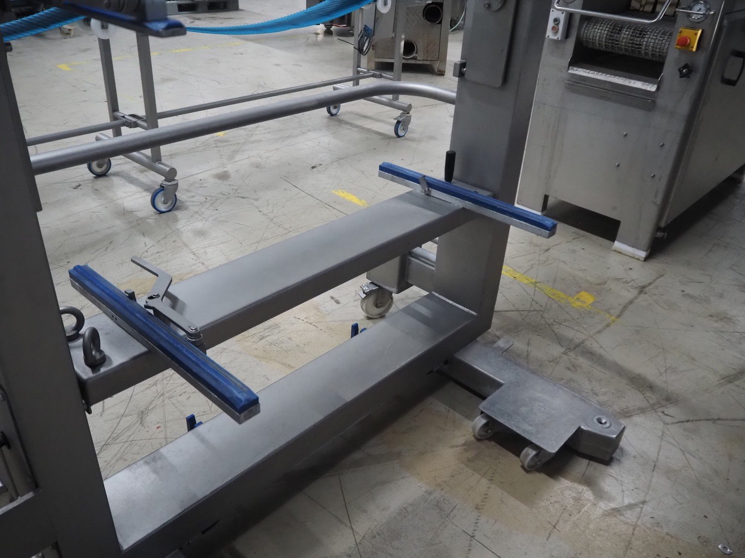 CFS traysealer, type: Twin Star, machine number: 773-118, year of construction: 2004, 400 V, 3 Ph, 50 Hz, 18 A, 12 kW, 2200 kg, plastic mesh infeed belts, belt width: (2x) 170 mm, total dimensions: 4600 mm x 1100 mm x 2200 mm, 2100 mm x 600 mm x 1100 mm and 4000 mm x 1000 mm x 1100 mm. With pallet with spacers and 2 trolleys for changing dyes, dimensions pallet: 2000 mm x 1300 mm x 900 mm, dimensions trolleys: (2x) 1900 mm x 1100 mm x 1350 mm. Incomplete.