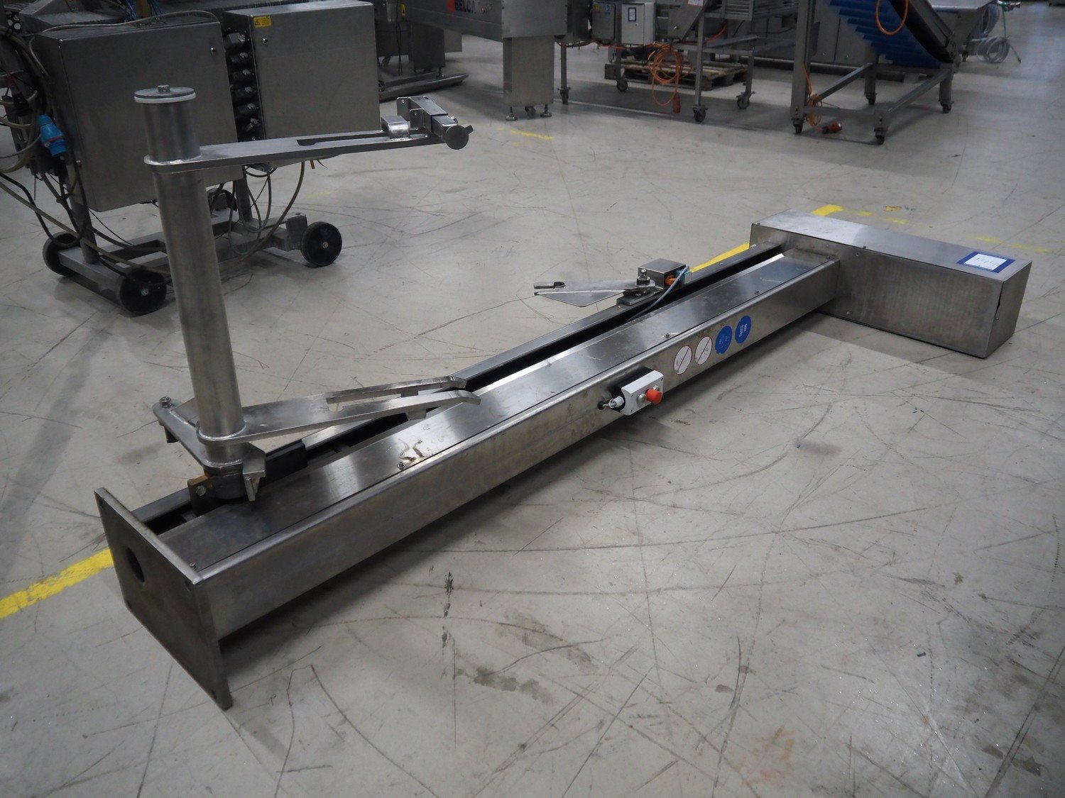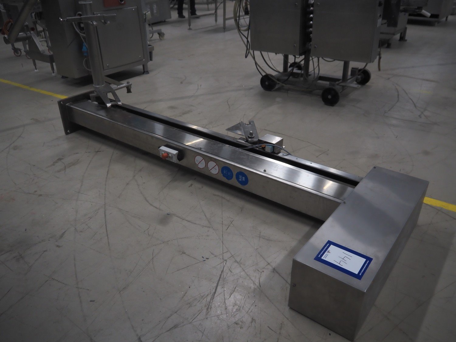 Lifter for 120 liter meat bins, capacity: 350 kg, lifting height: 1550 mm, total dimensions: 2900 mm x 970 mm x 1150 mm.