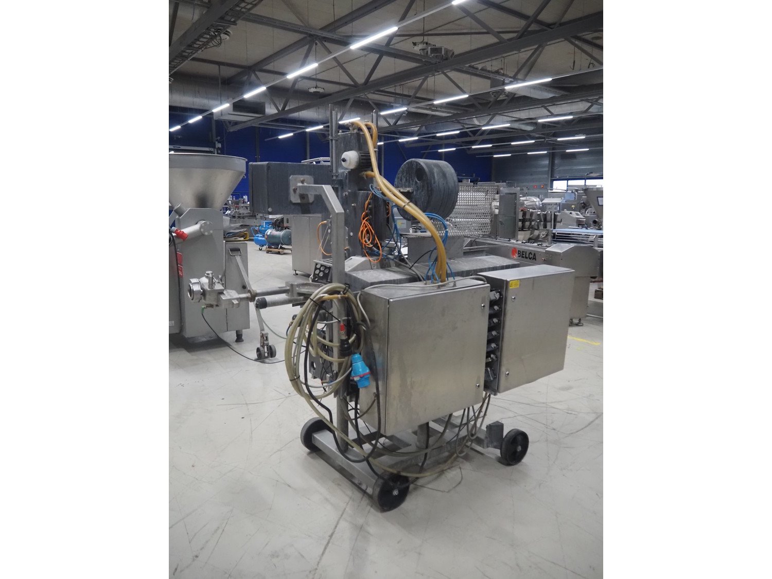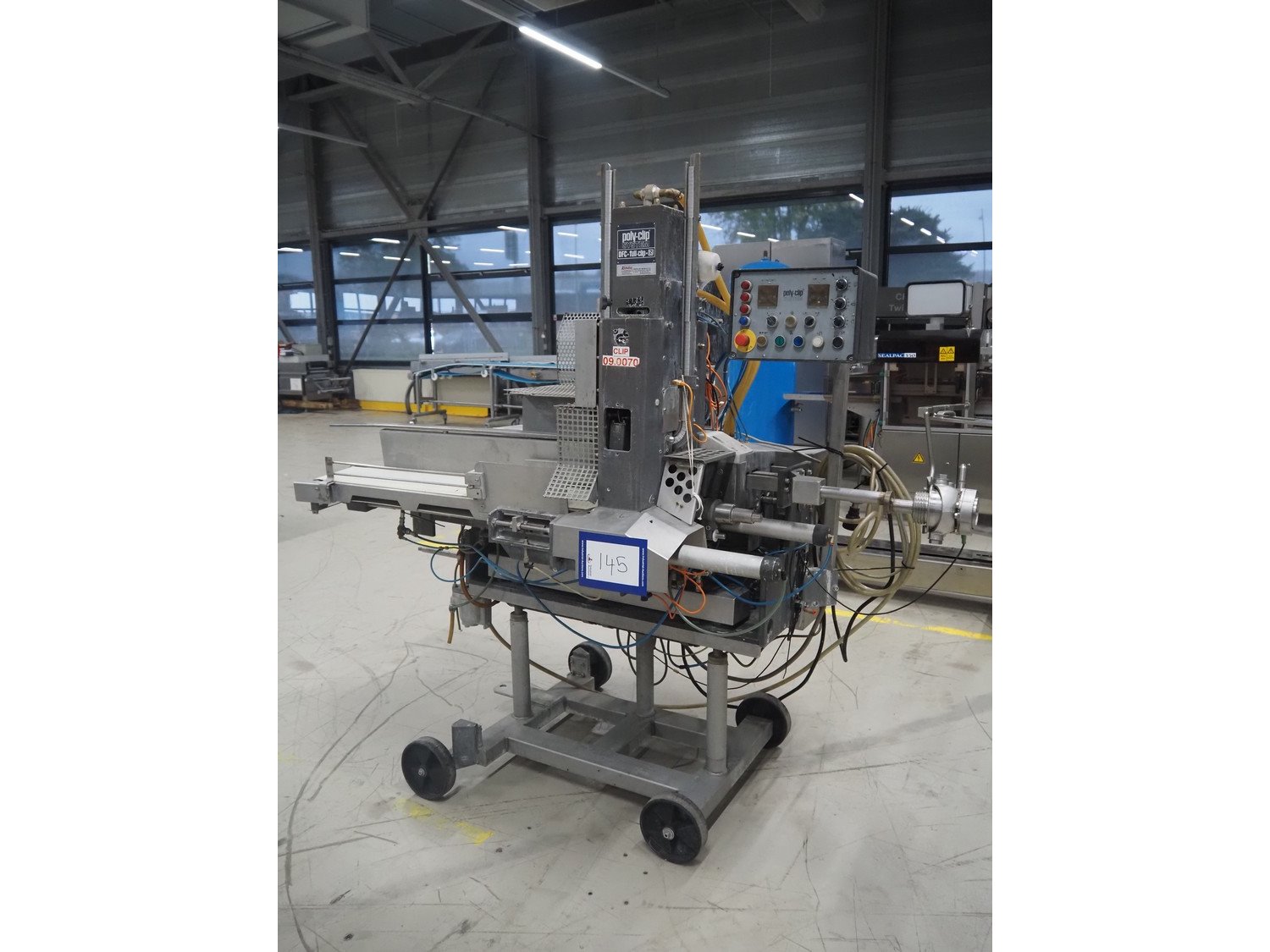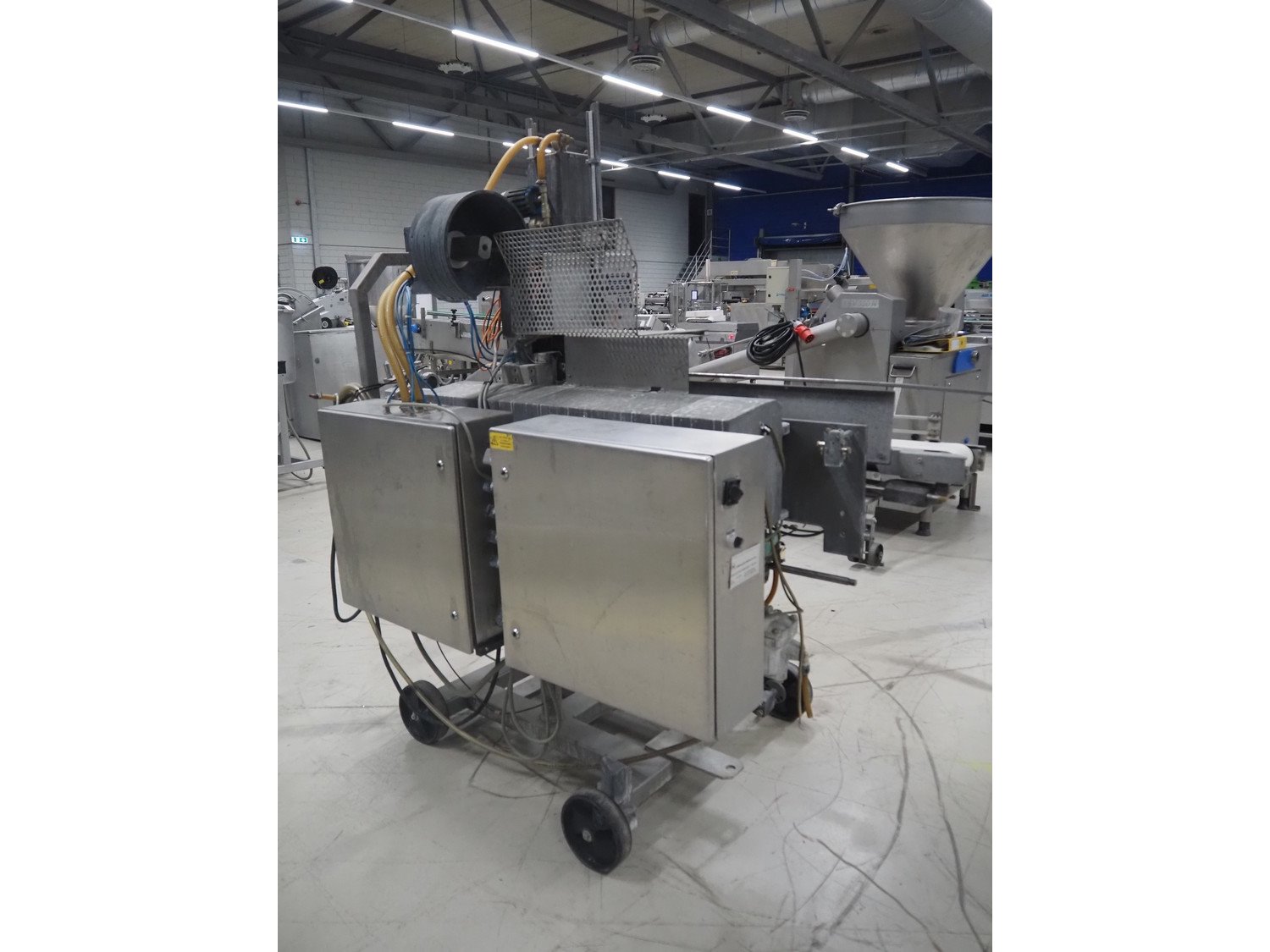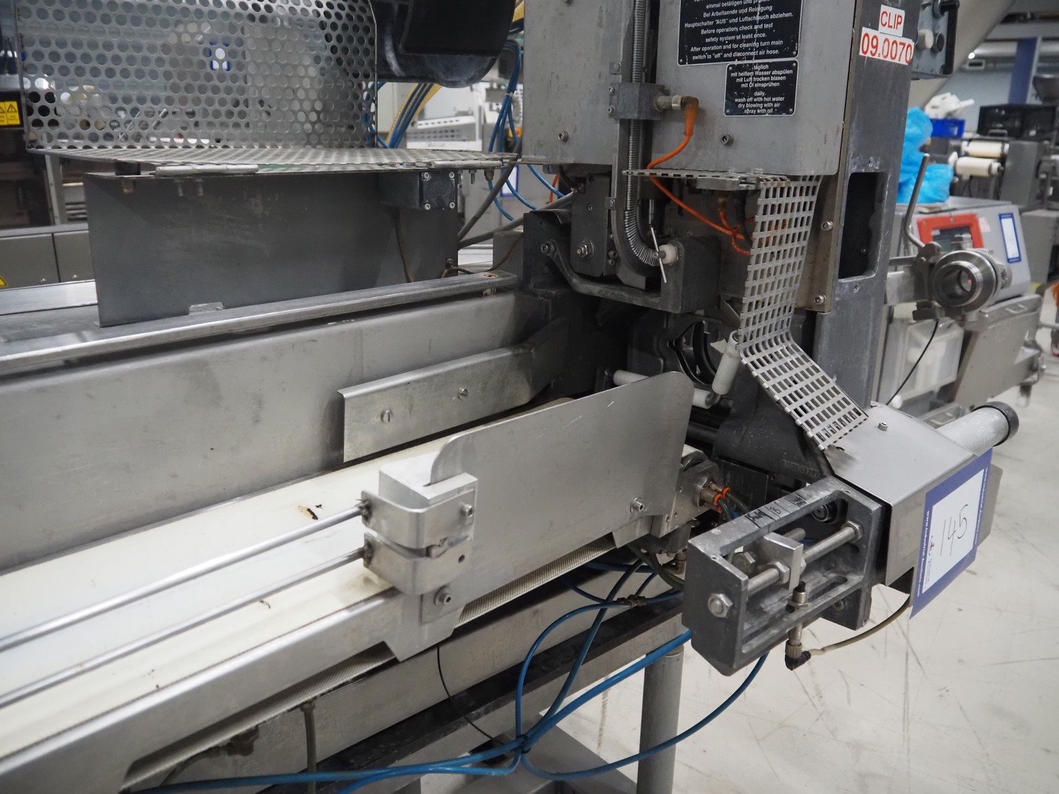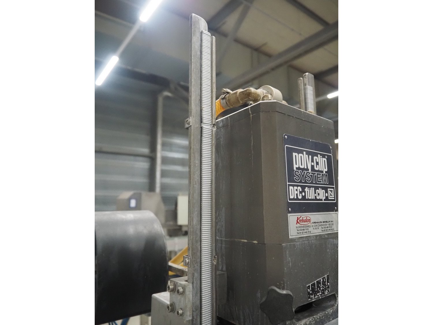 Poly-clip system GmbH & Co. KG mobile double automatic clipper, type: DFC 8161, number: 12879, 380 V, 1 Ph, 50 Hz, 5/7 bar, plastic belt, belt width: 185 mm, total dimensions: 2200 mm x 1100 mm x 1950 mm.