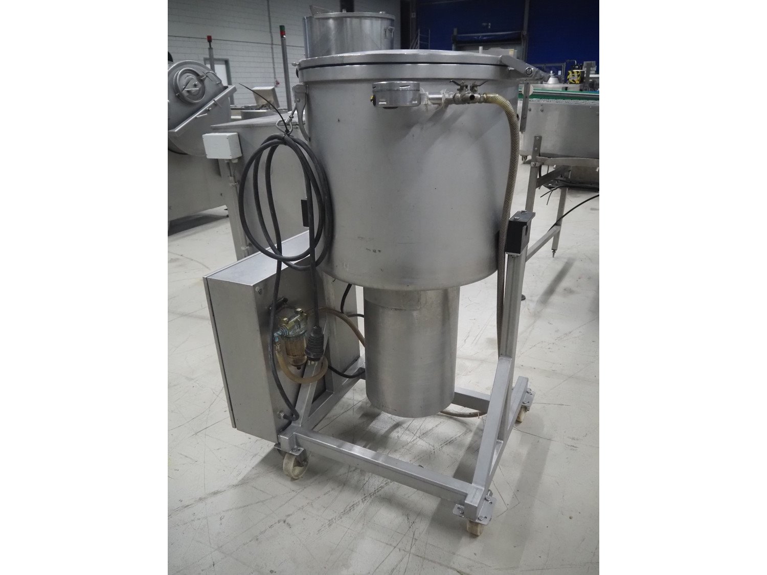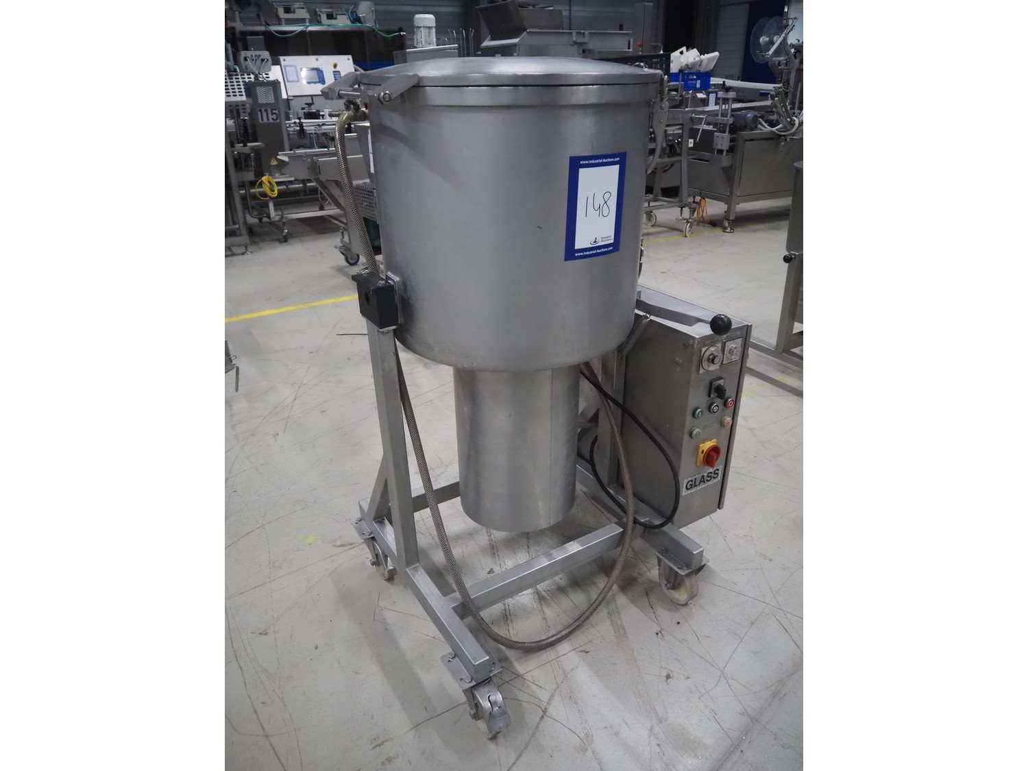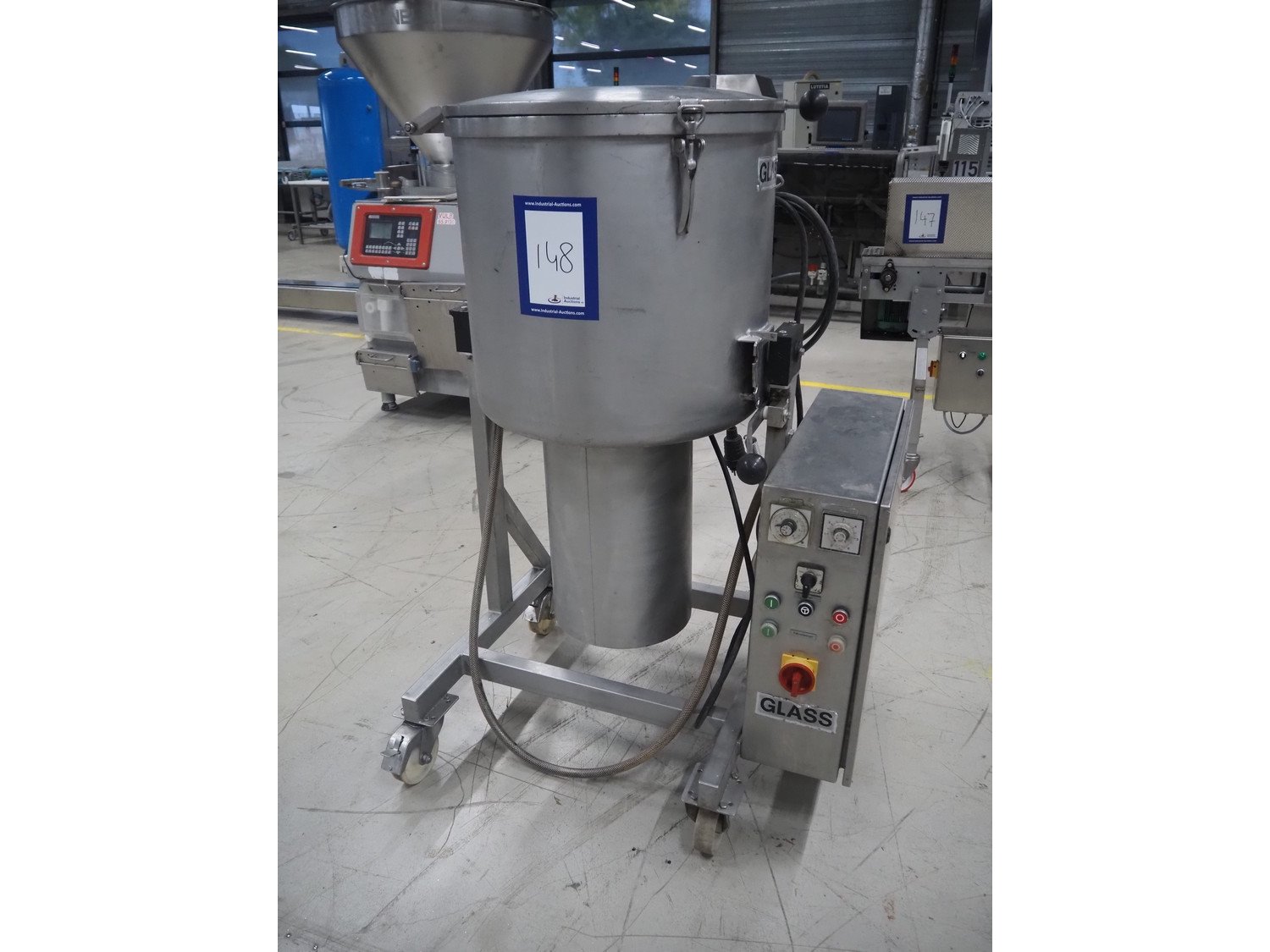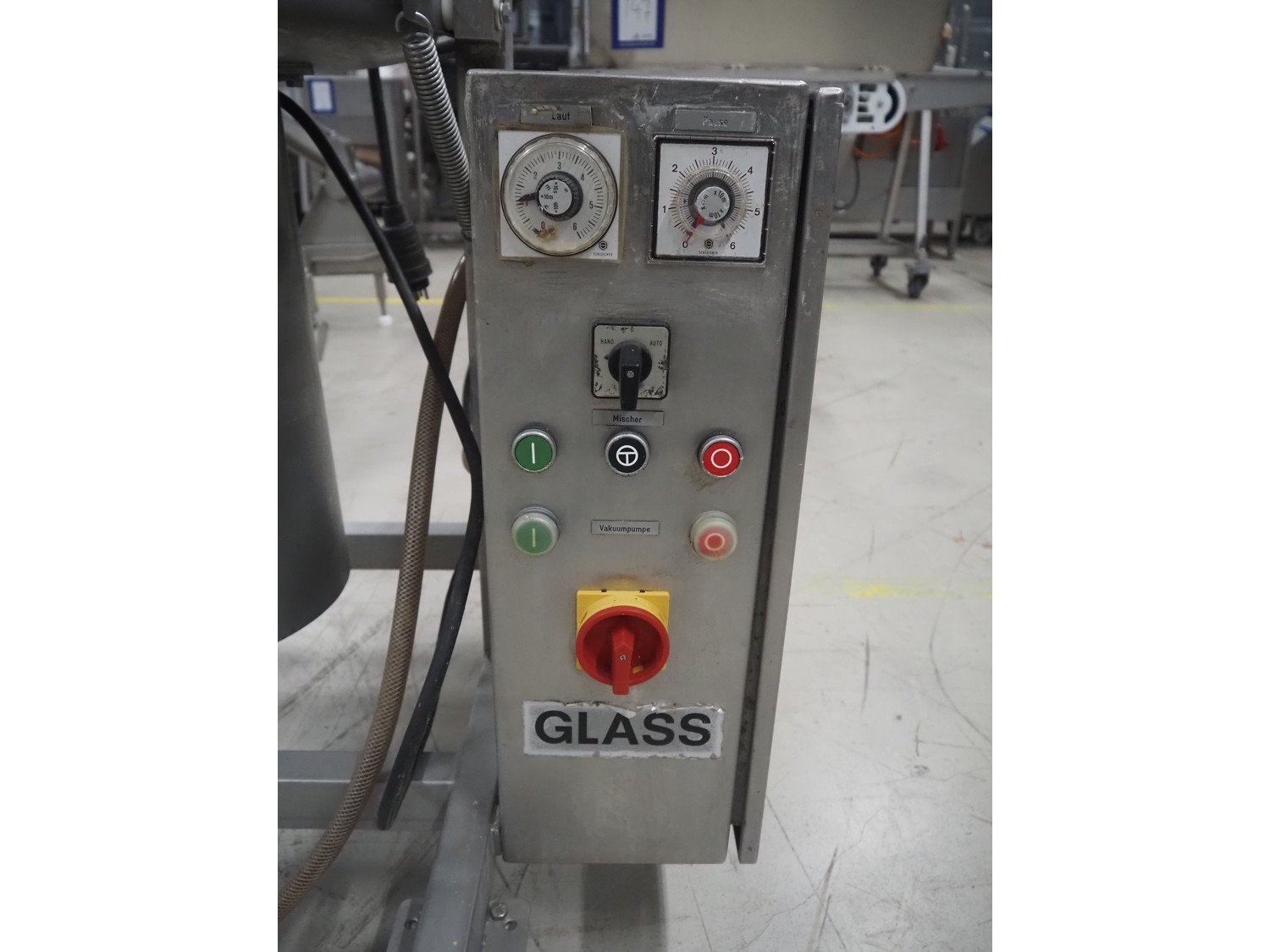 H.Glass mobile vacuum tumbler, type: VSM 150, machine number: 2065, year of construction: 1999, 220/380 V, 1 Ph, 50 Hz, 1.12 kW, volume: 150 liter, Busch vacuum pump, type: 016-116, number: 343191, capacity: 16 m³ per hour, total dimensions: 950 mm x 750 mm x 1400 mm.