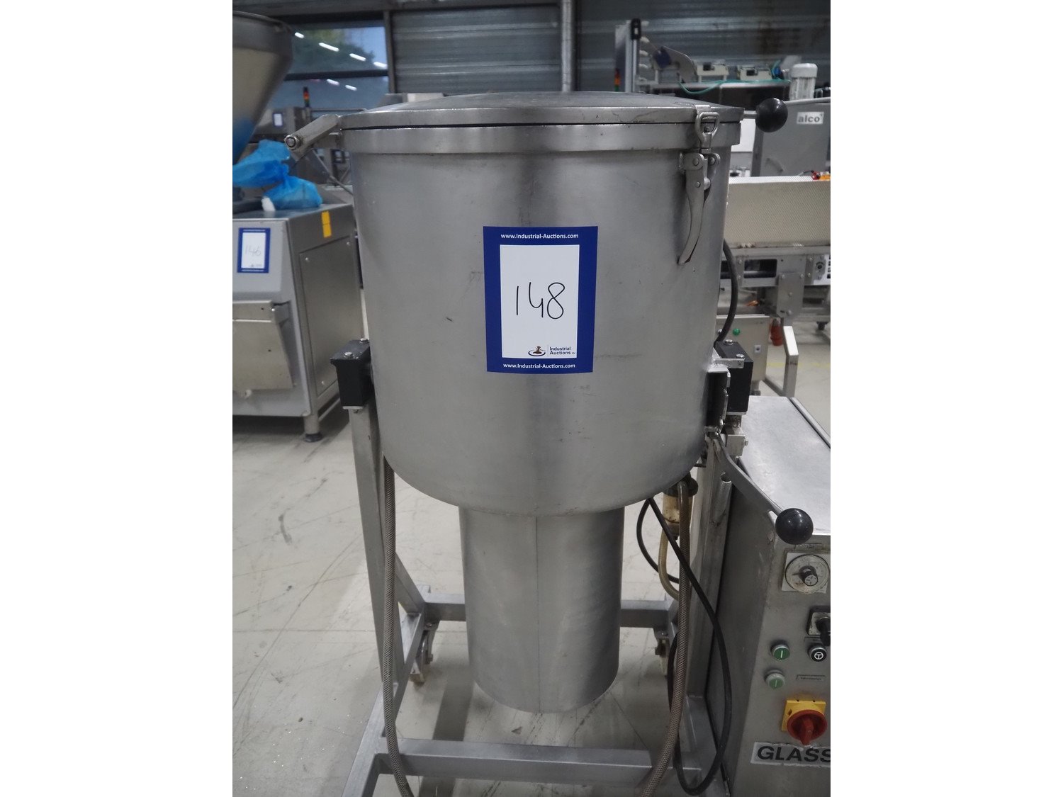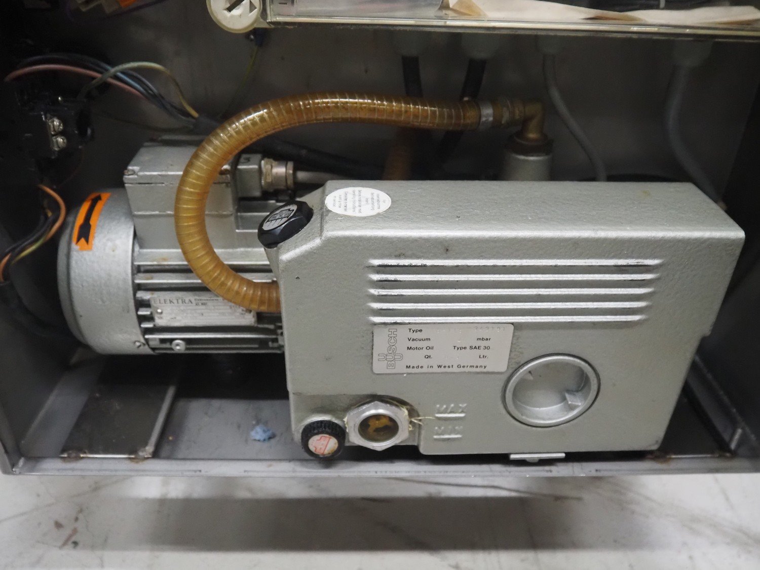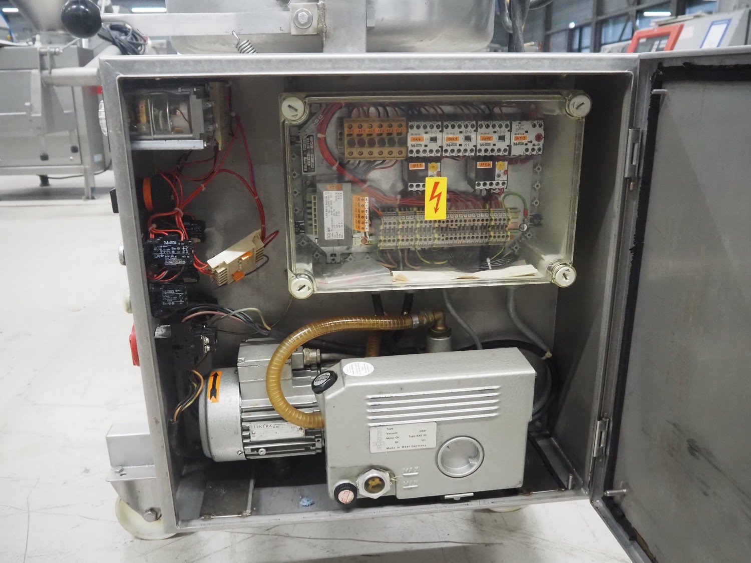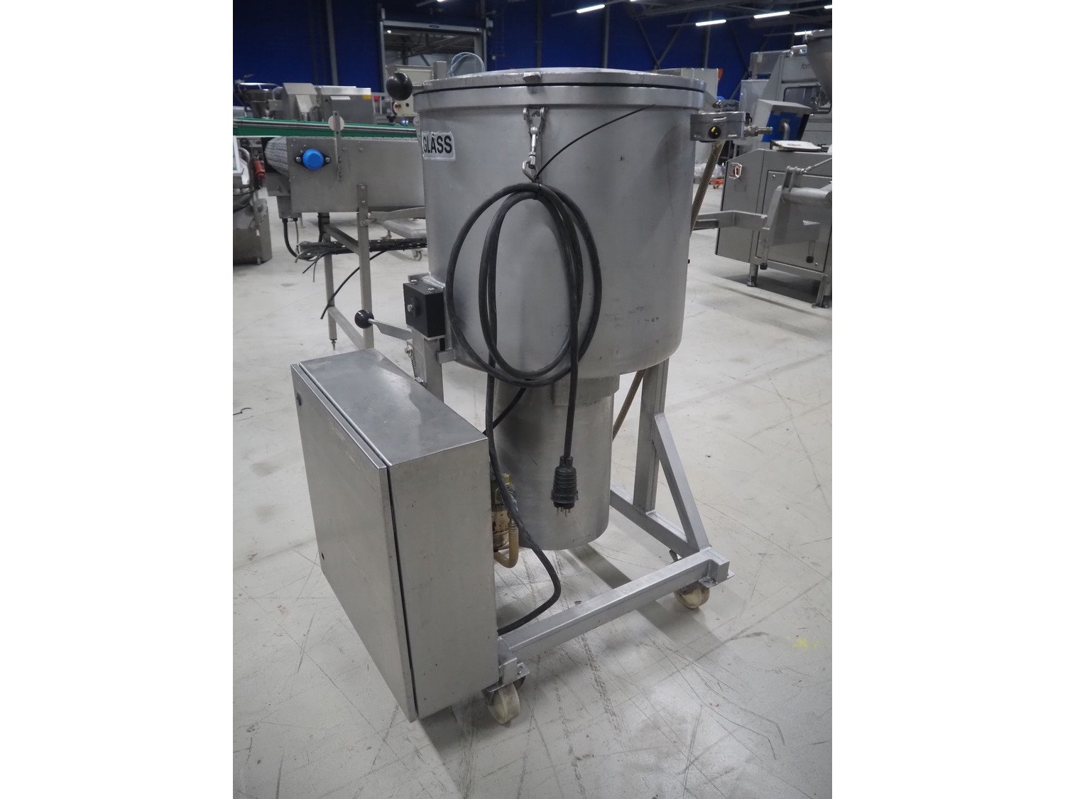 H.Glass mobile vacuum tumbler, type: VSM 150, machine number: 2065, year of construction: 1999, 220/380 V, 1 Ph, 50 Hz, 1.12 kW, volume: 150 liter, Busch vacuum pump, type: 016-116, number: 343191, capacity: 16 m³ per hour, total dimensions: 950 mm x 750 mm x 1400 mm.