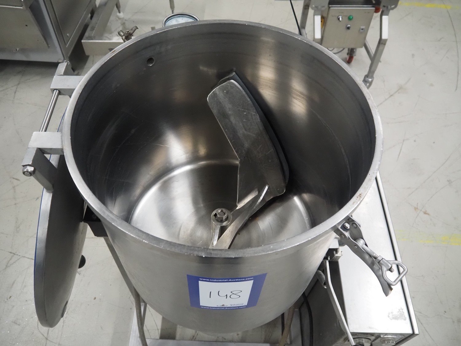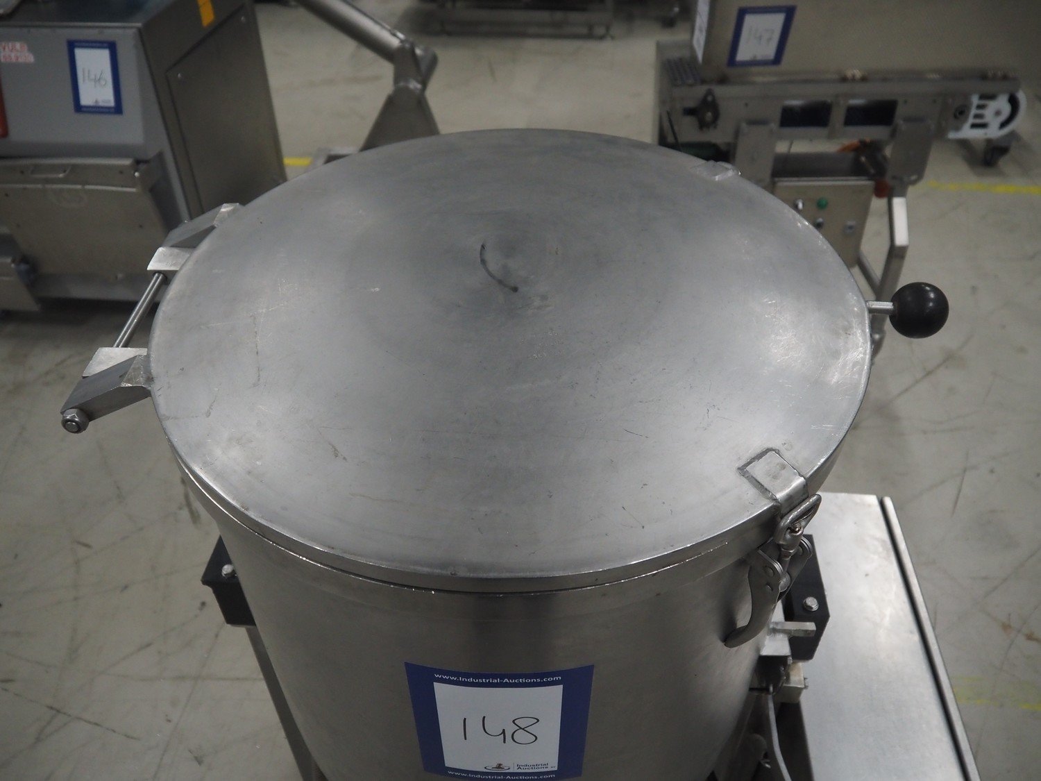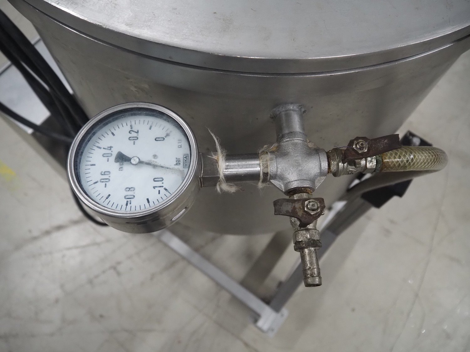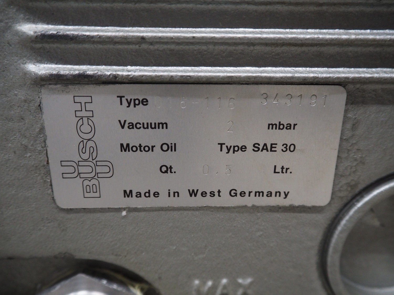 H.Glass mobile vacuum tumbler, type: VSM 150, machine number: 2065, year of construction: 1999, 220/380 V, 1 Ph, 50 Hz, 1.12 kW, volume: 150 liter, Busch vacuum pump, type: 016-116, number: 343191, capacity: 16 m³ per hour, total dimensions: 950 mm x 750 mm x 1400 mm.