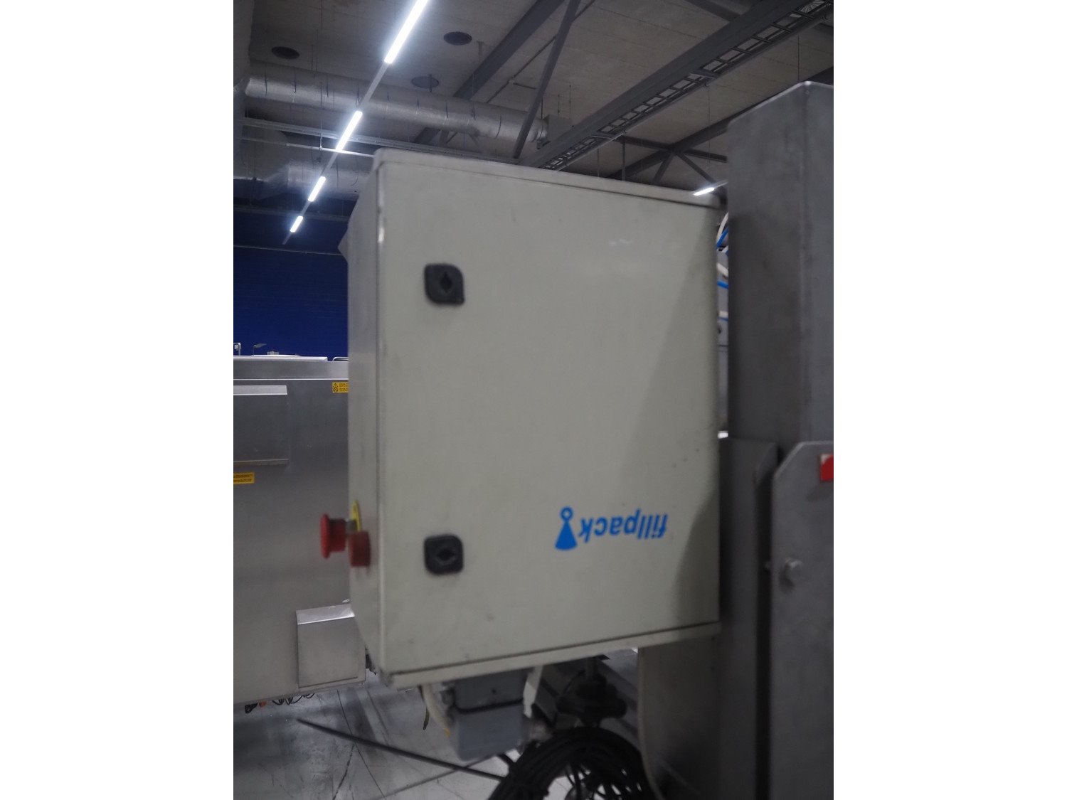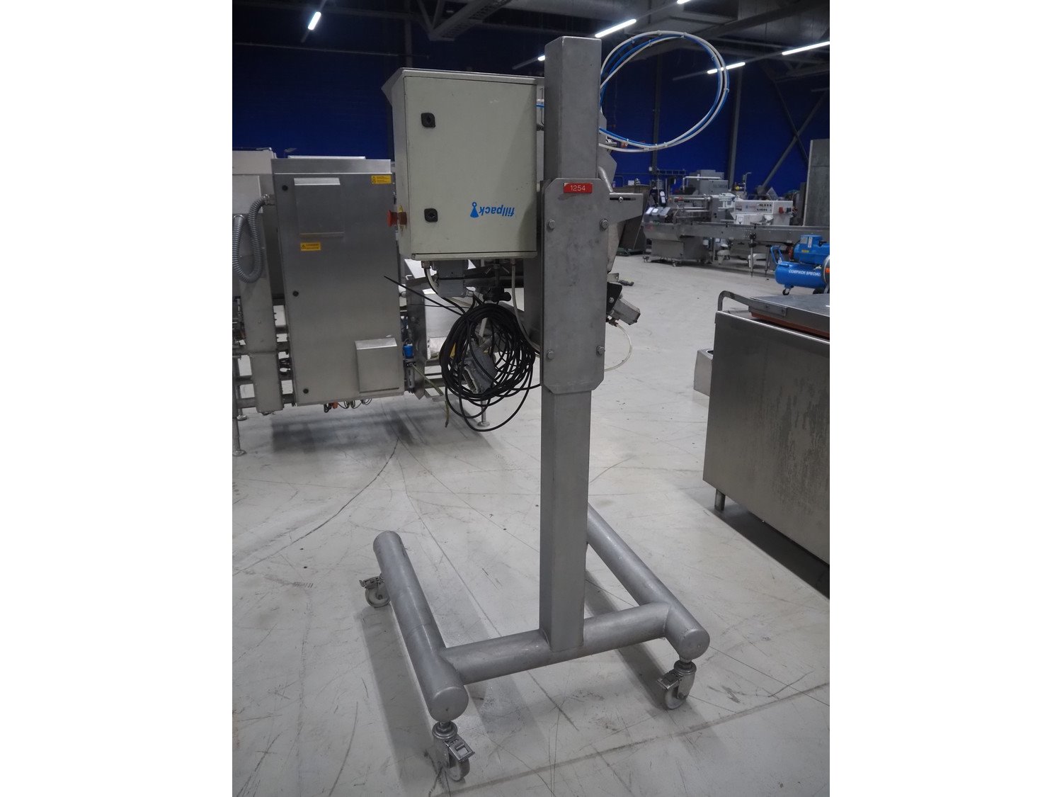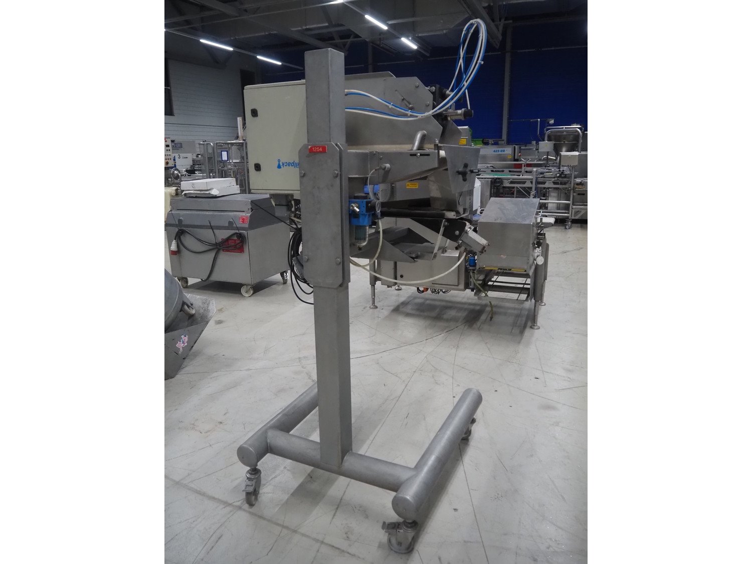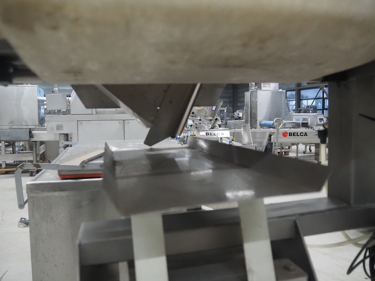 Fillpack mobile infeed hopper, type: DV2, number: 90105, year of construction: 1999, plastic belt, belt width: 680 mm, gutter width: 210 mm, total dimensions: 840 mm x 900 mm x 1800 mm.