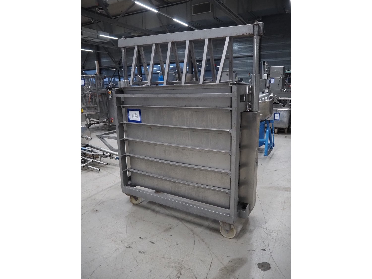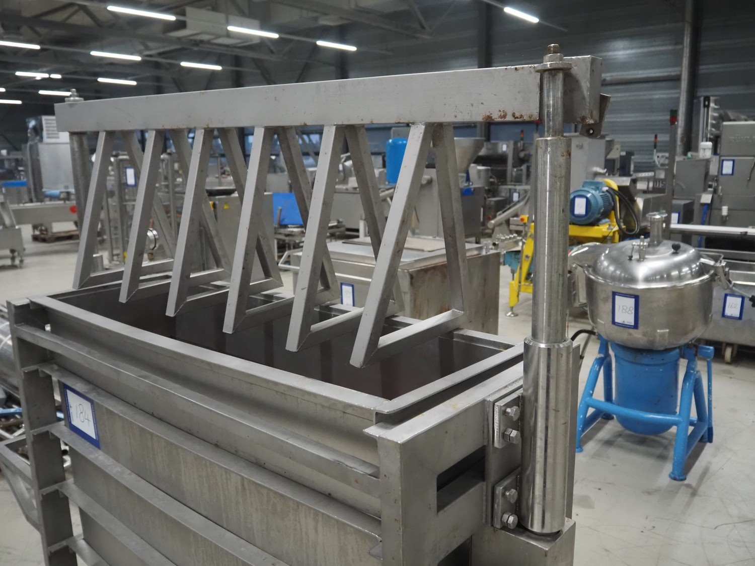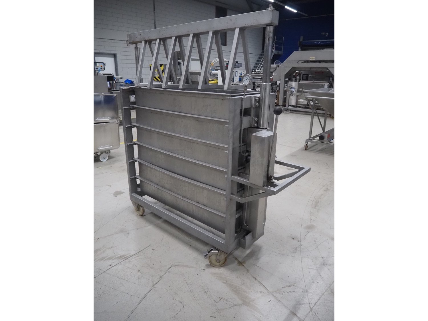 Mobile meat press, dimensions: 1800 mm x 600 mm x 950 mm.