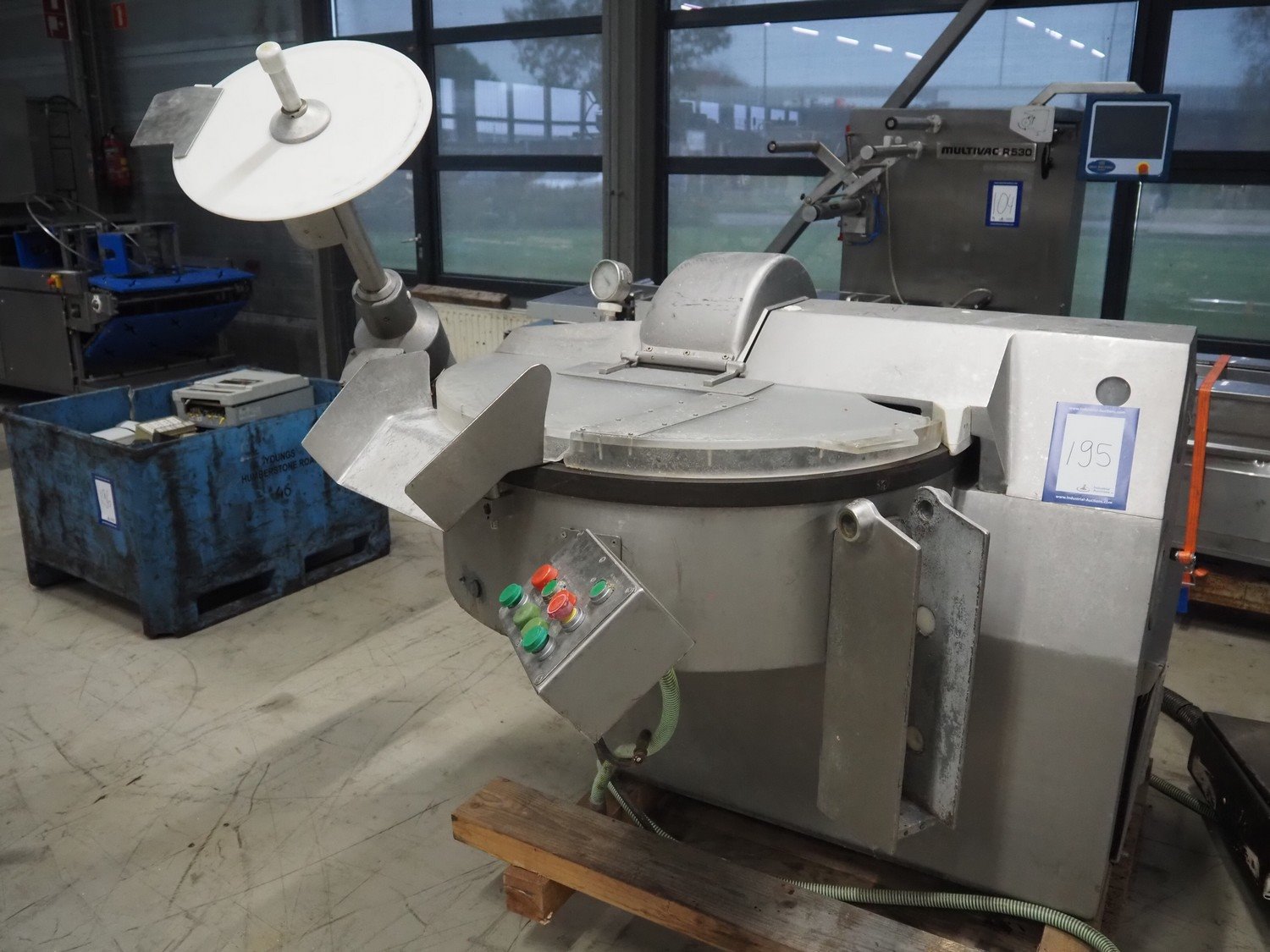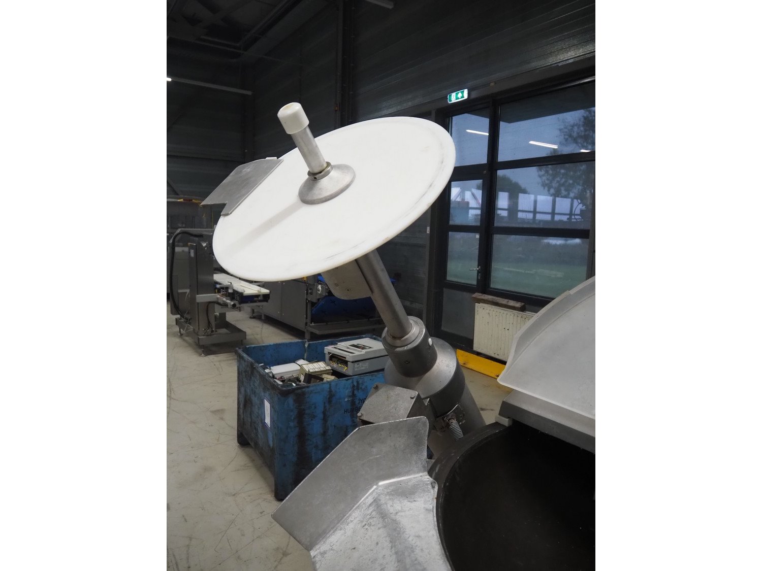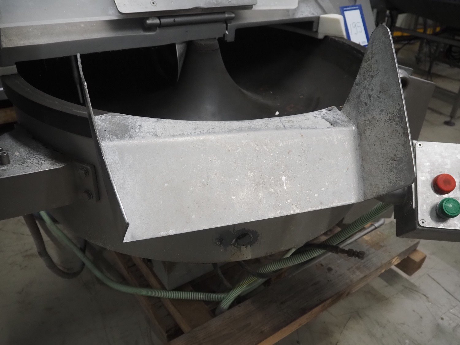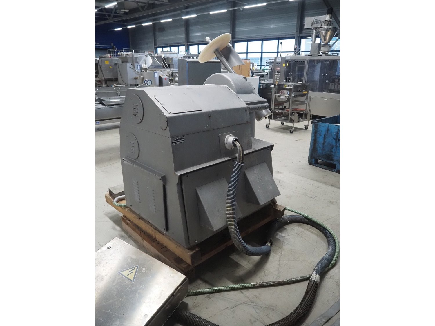 Kilia cutter with ejector and switch cabinet, model: 120 1 EX 2000S, machine number: 18710870, year of construction: 1987, 380 V, 57/68 A, 28/25 kW, steel bowl, volume: 120 liter, dimensions: 2050 mm x 1750 mm x 1950 mm, dimensions switch cabinet: 660 mm x 200 mm x 760 mm.