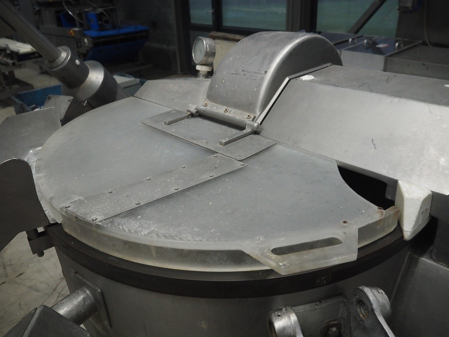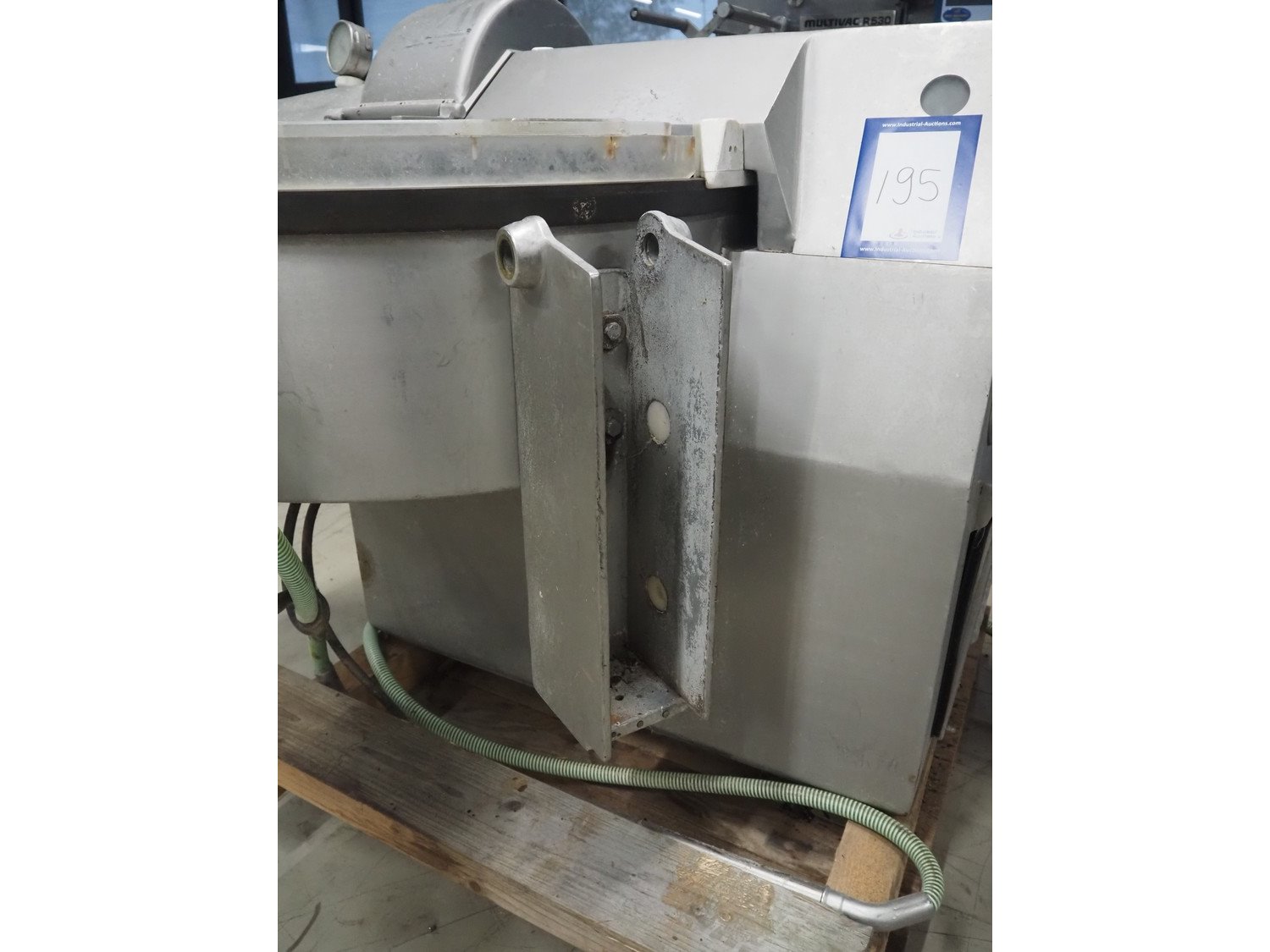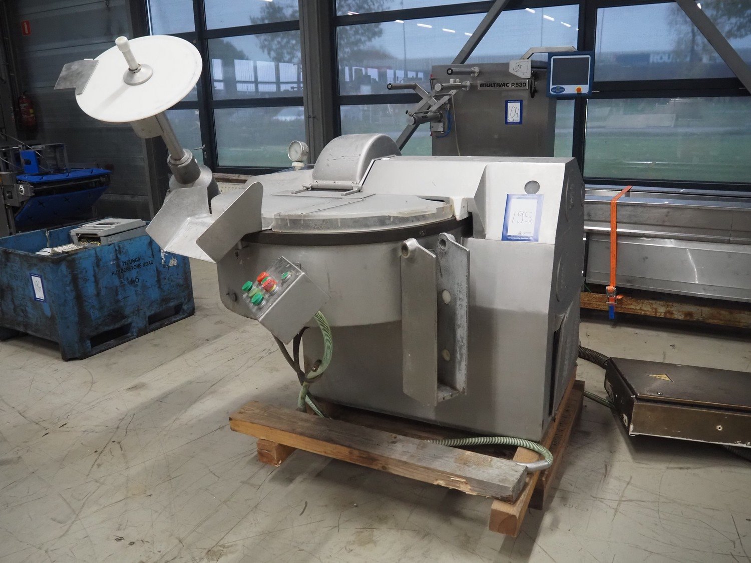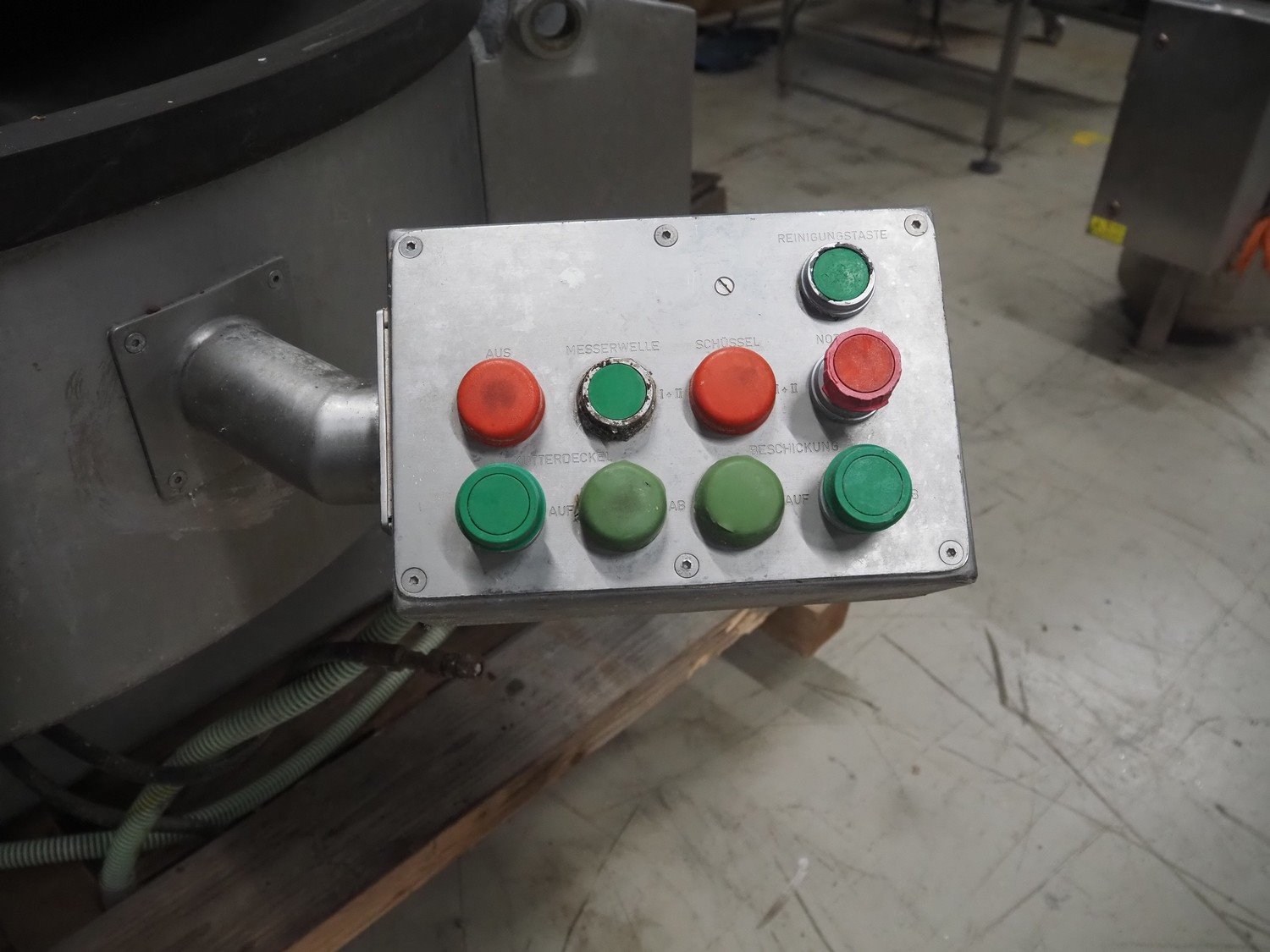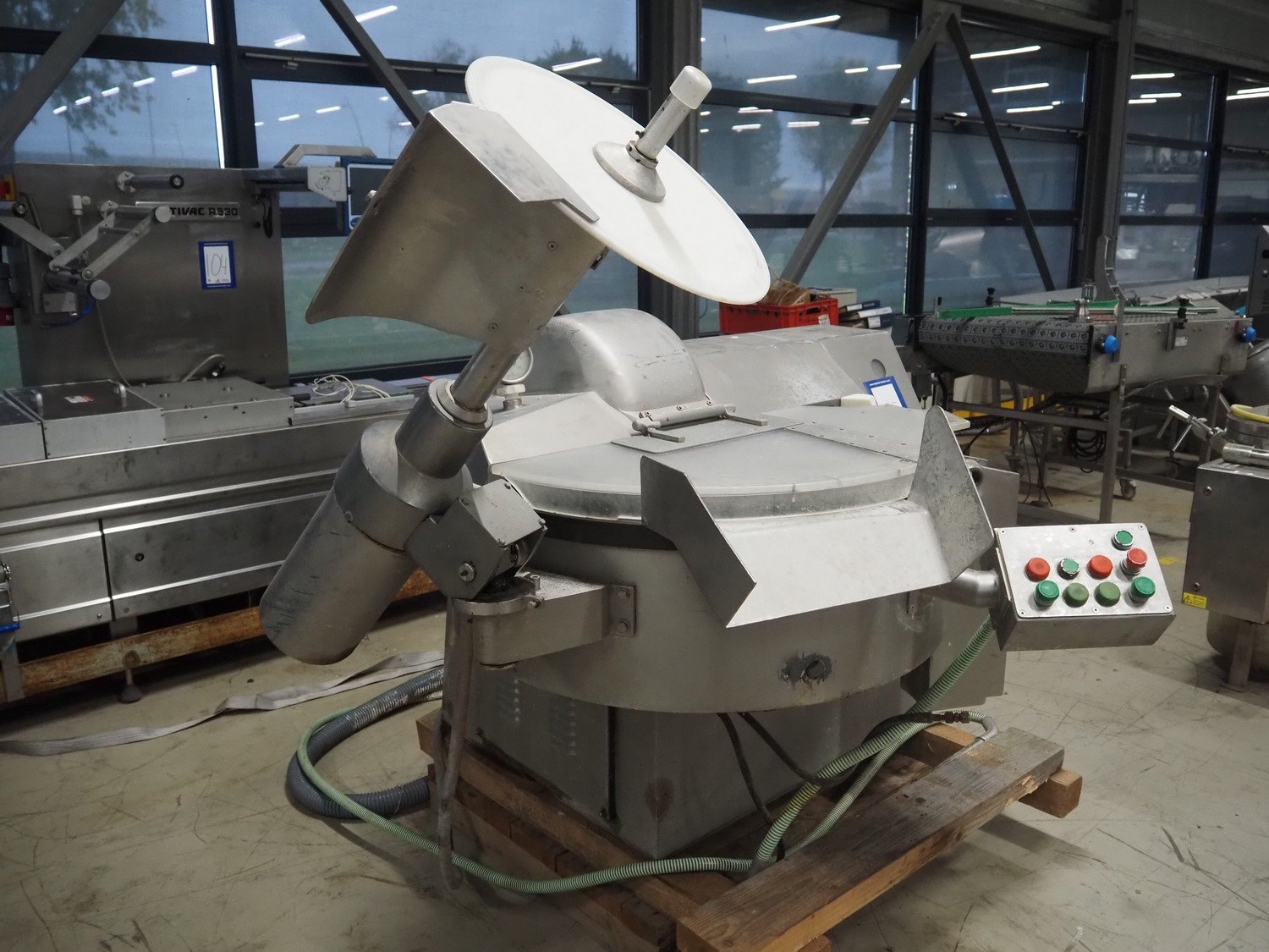 Kilia cutter with ejector and switch cabinet, model: 120 1 EX 2000S, machine number: 18710870, year of construction: 1987, 380 V, 57/68 A, 28/25 kW, steel bowl, volume: 120 liter, dimensions: 2050 mm x 1750 mm x 1950 mm, dimensions switch cabinet: 660 mm x 200 mm x 760 mm.