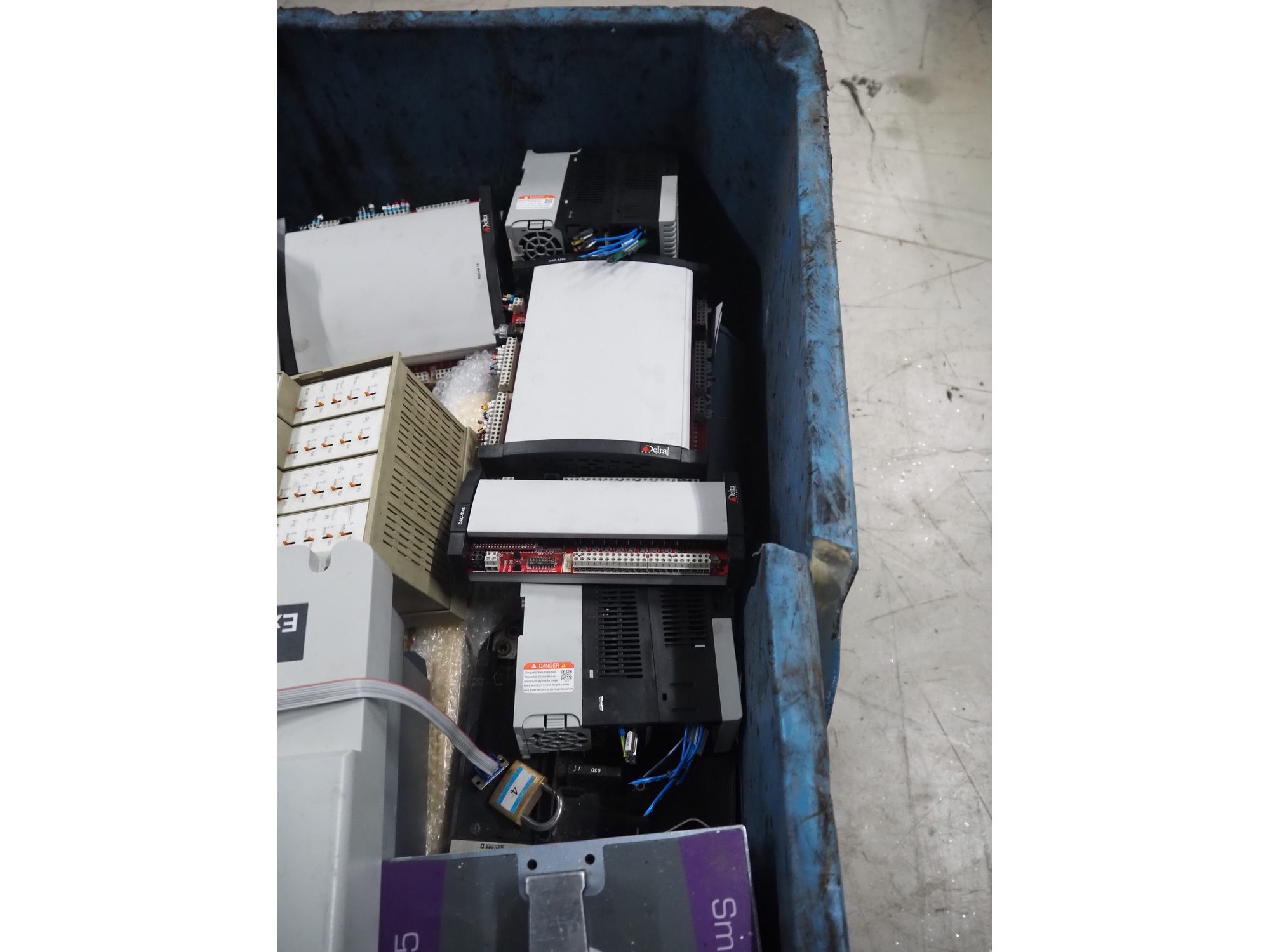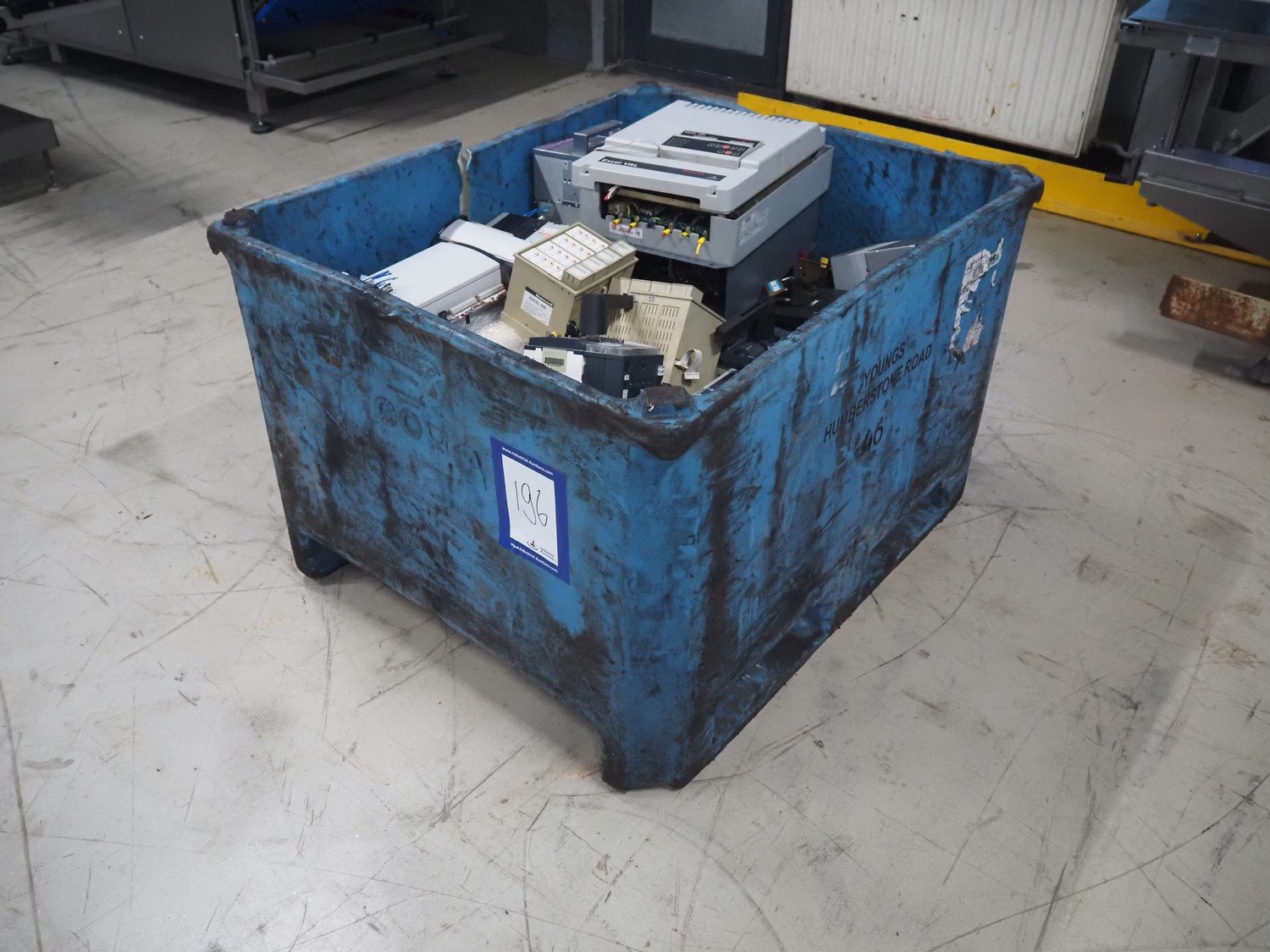 Plastic pallet box with large amount of electric parts, dimensions: 1200 mm x 1000 mm x 750 mm.