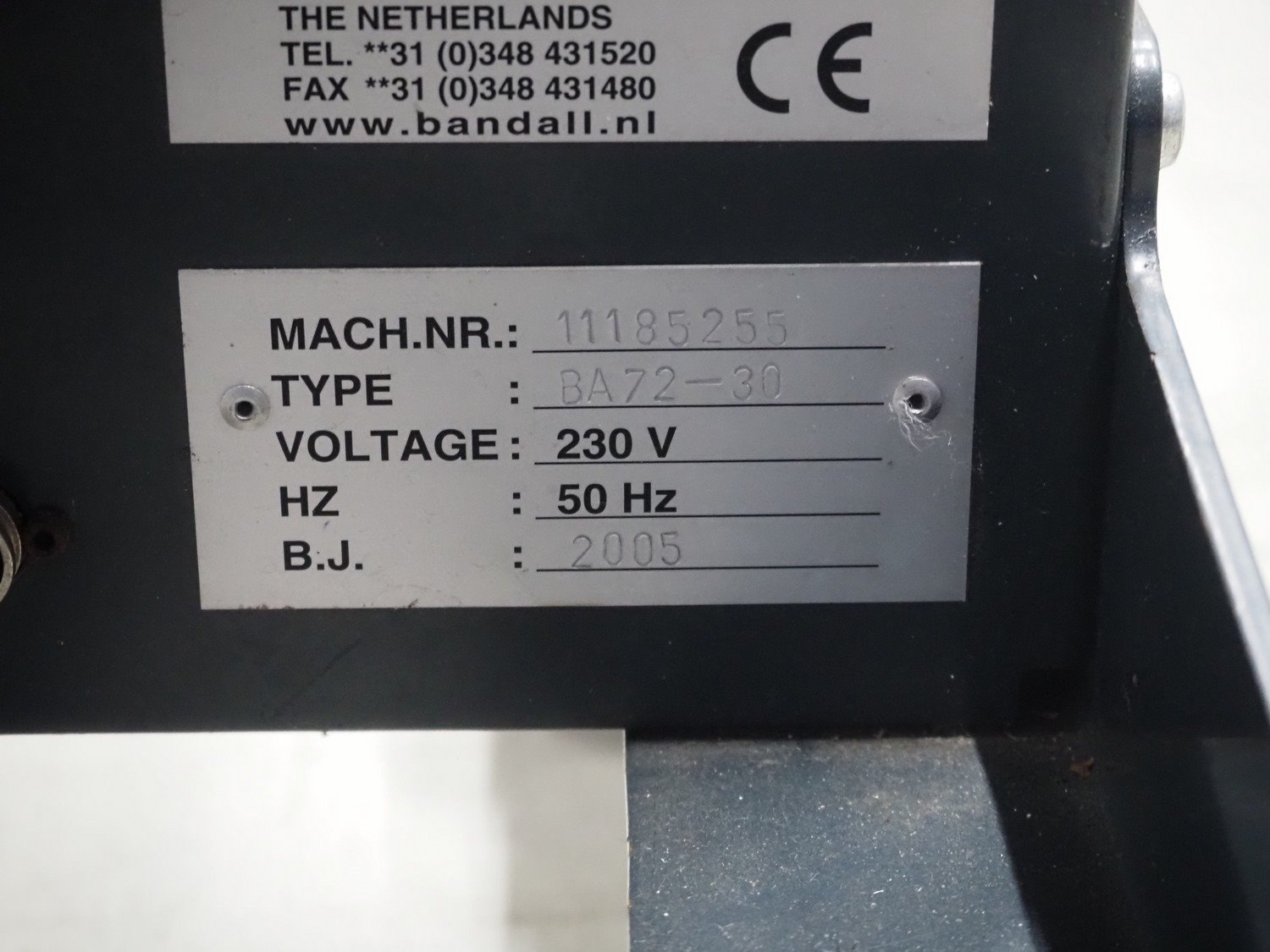 Bandall mobile binding machine, type: BA72-30, machine number: 11185255, year of construction: 2005, 230 V, 50 Hz, clearance: 680 mm x 360 mm, dimensions: 1300 mm x 520 mm x 1450 mm.