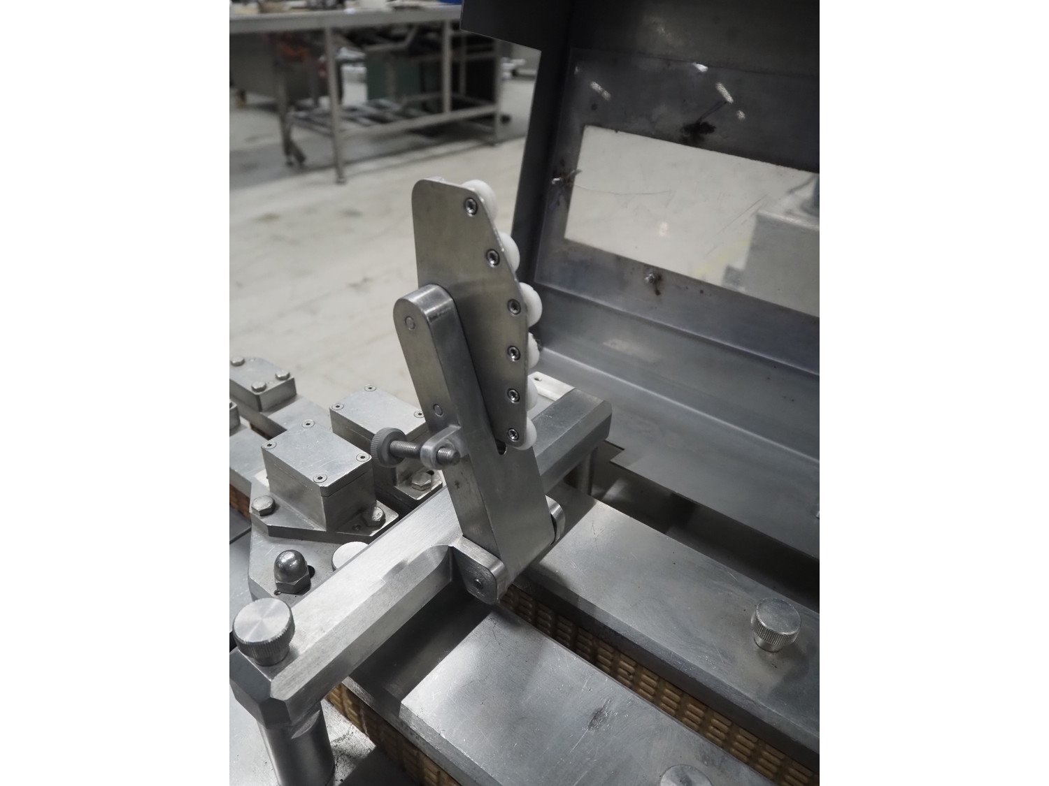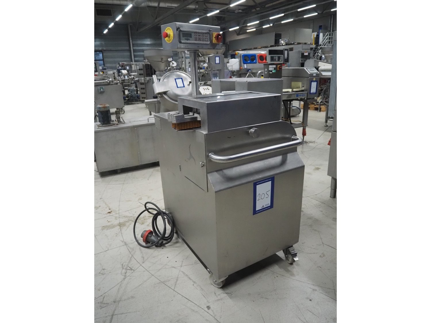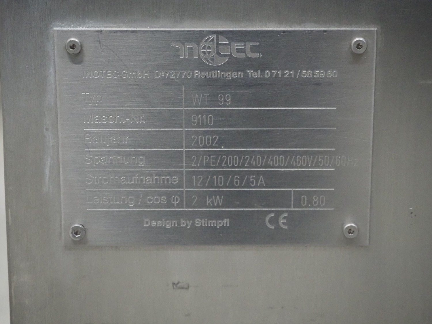 Inotec mobile sausage cutter, type: WT 99, machine number: 9110, year of construction: 2002, 200/240/400/460 V, 50/60 Hz, 12/10/6/5 A, 2 kW, plastic belts, belt width: 30 mm, total dimensions: 900 mm x 750 mm x 1500 mm.