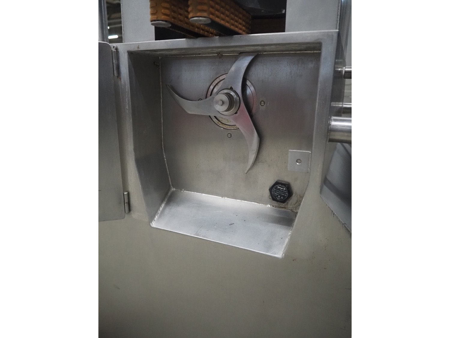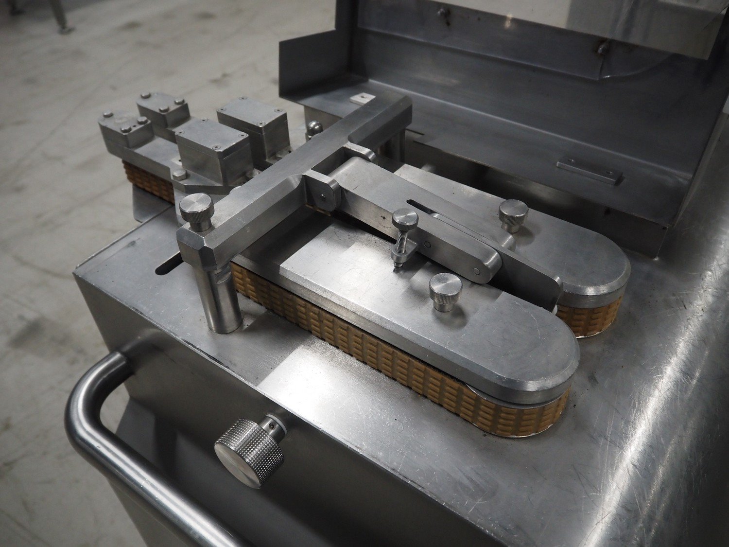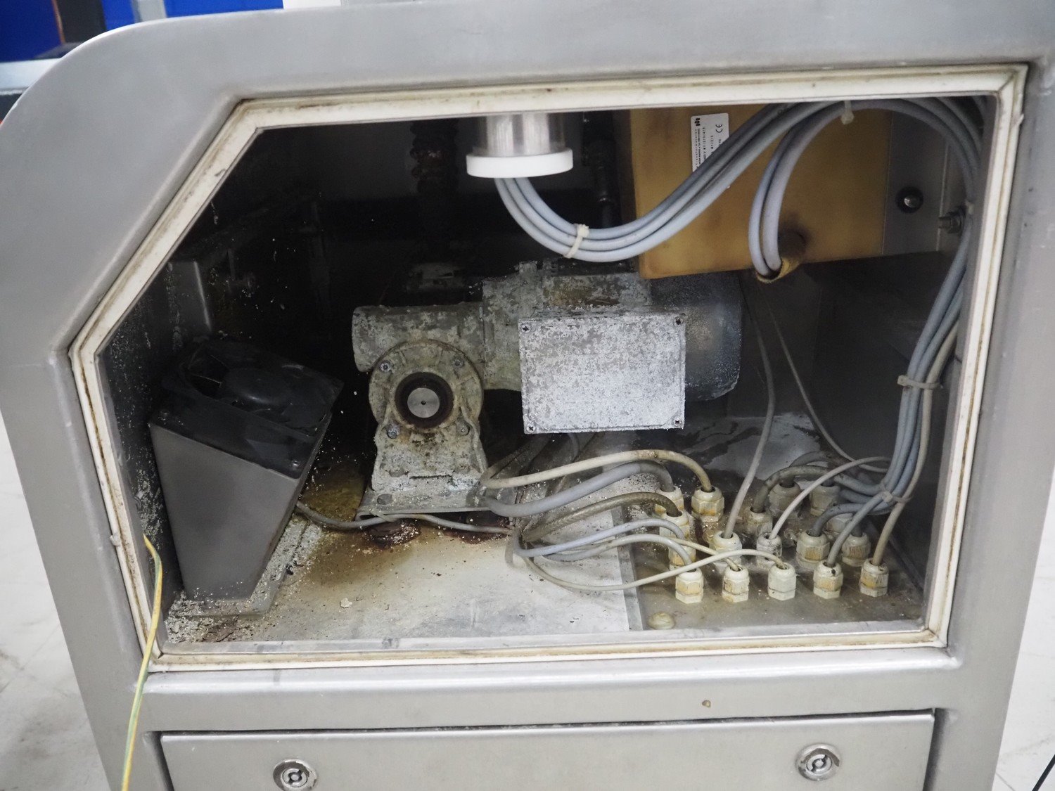 Inotec mobile sausage cutter, type: WT 99, machine number: 9110, year of construction: 2002, 200/240/400/460 V, 50/60 Hz, 12/10/6/5 A, 2 kW, plastic belts, belt width: 30 mm, total dimensions: 900 mm x 750 mm x 1500 mm.