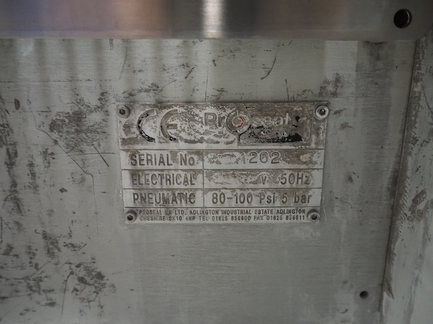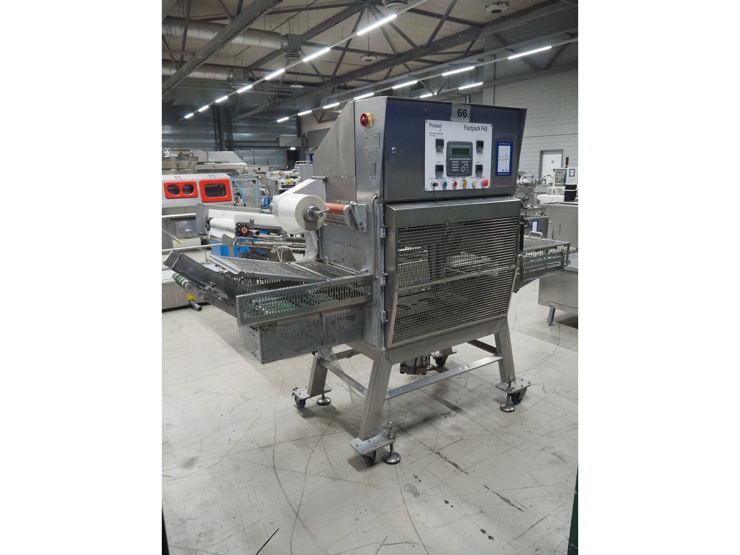 Proseal traysealer, type: Fastpack F45, serial number: 1202, 50 Hz, wire belt, belt width: 175 mm, film width: 215 mm, total dimensions: 2980 mm x 850 mm x 1950 mm. Incomplete, missing dye.
