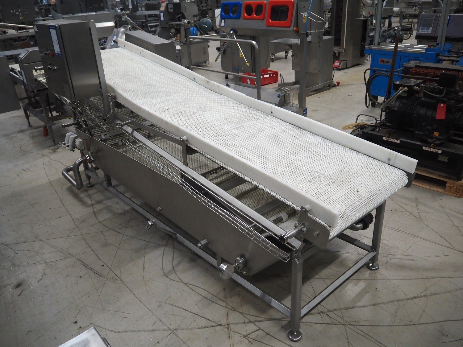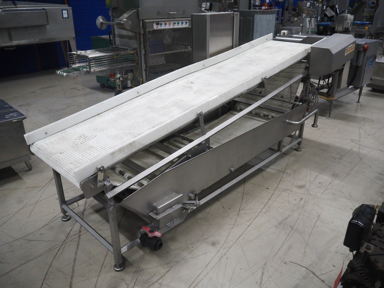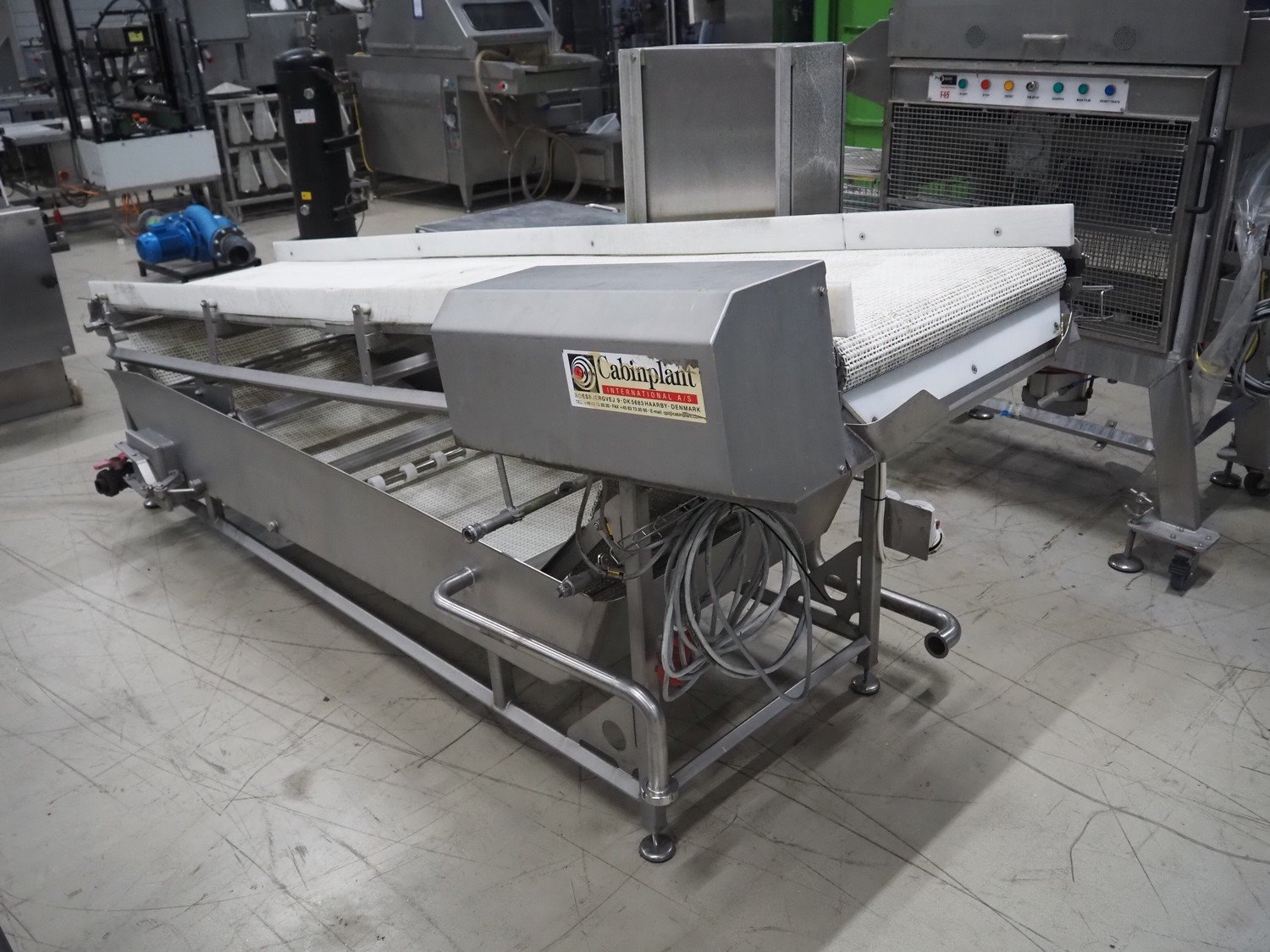 Cabinplant elevating belt, type: DRAINSYSTEM, number: 8252-04, year of construction: 2002, 400 V, 3 Ph, plastic mesh belt, belt width: 710 mm, elevating height: 1200 mm, total dimensions: 3200 mm x 1350 mm x 1530 mm.
