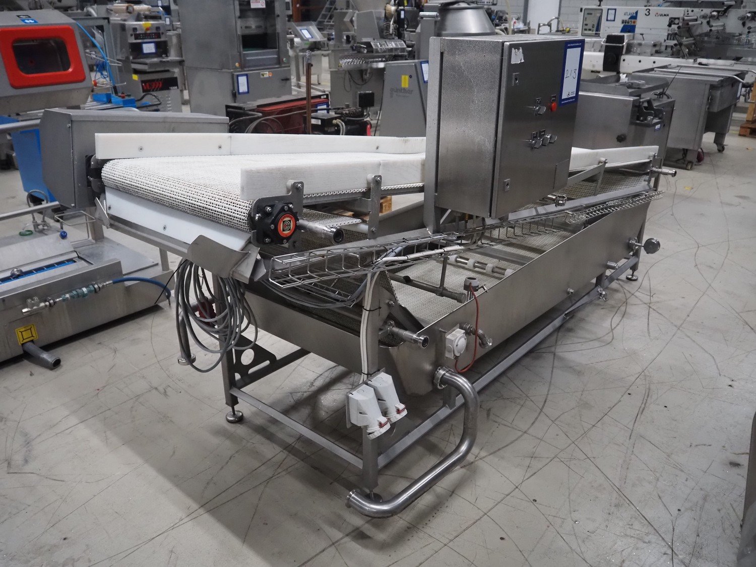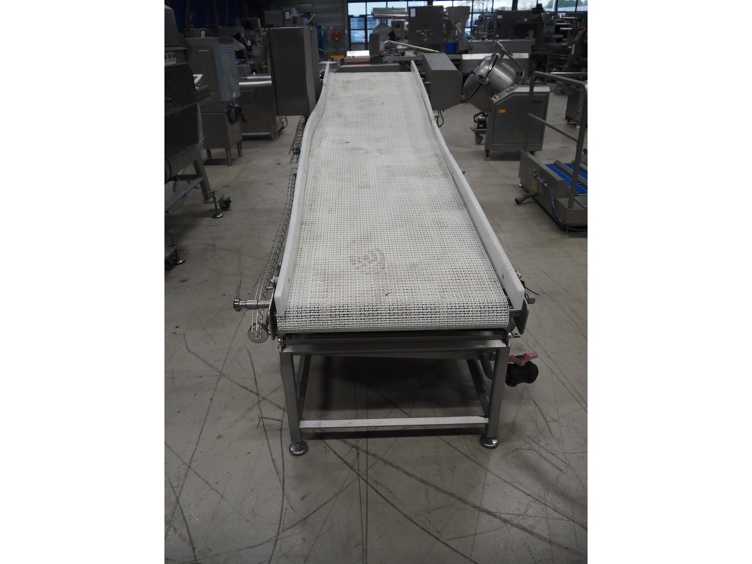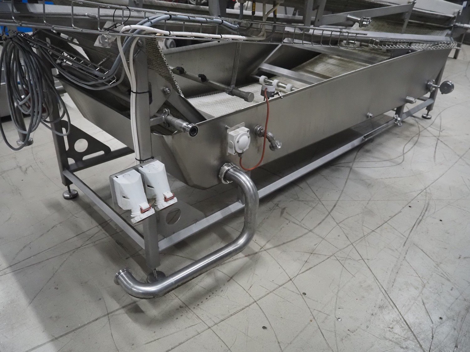 Cabinplant elevating belt, type: DRAINSYSTEM, number: 8252-04, year of construction: 2002, 400 V, 3 Ph, plastic mesh belt, belt width: 710 mm, elevating height: 1200 mm, total dimensions: 3200 mm x 1350 mm x 1530 mm.