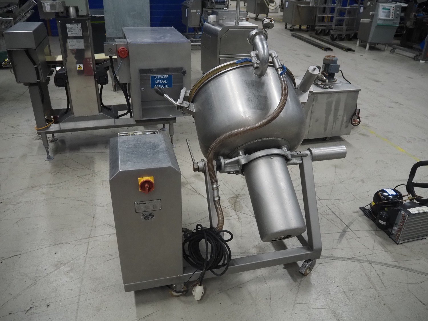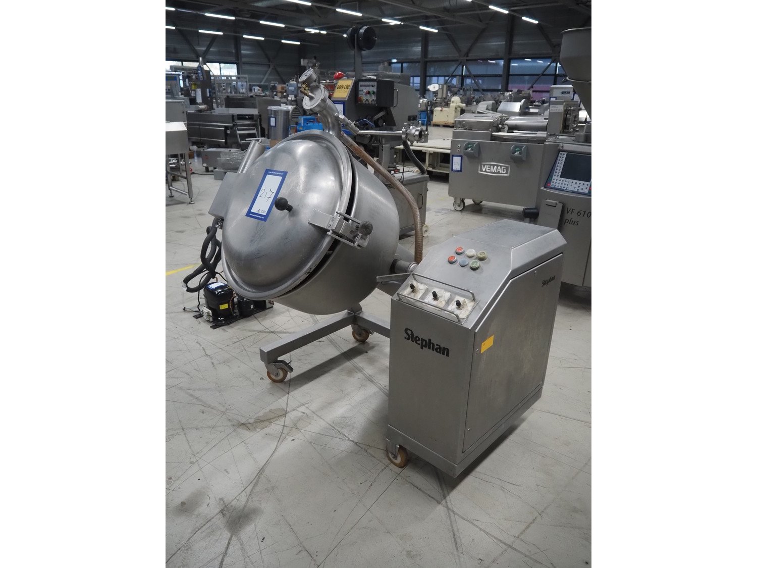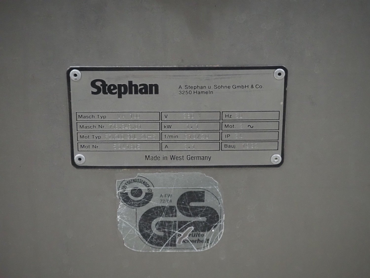 Stephan mobile vacuum mixer, type: VM 100, machine number: 718.949.01, year of construction: 1992, 380 V, 3 Ph, 50 Hz, 3.1 A, 1.1 kW, volume: 100 liter, dimensions: 1100 mm x 1400 mm x 1400 mm. Missing vacuum pump.