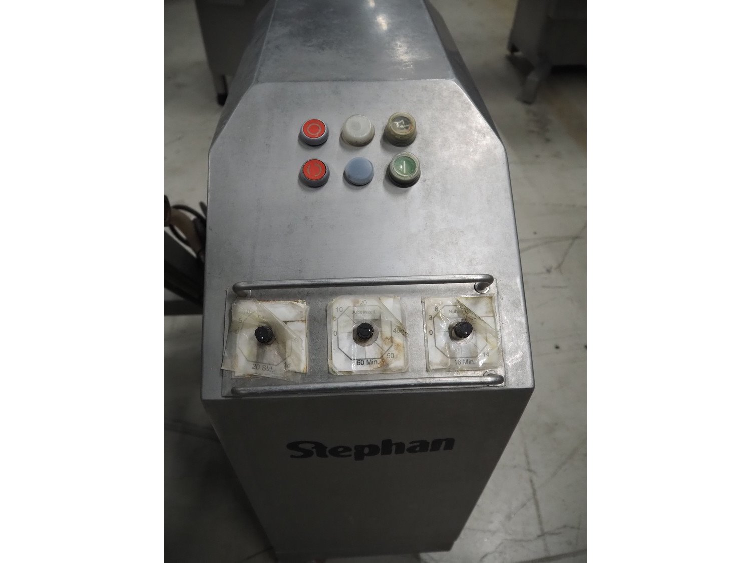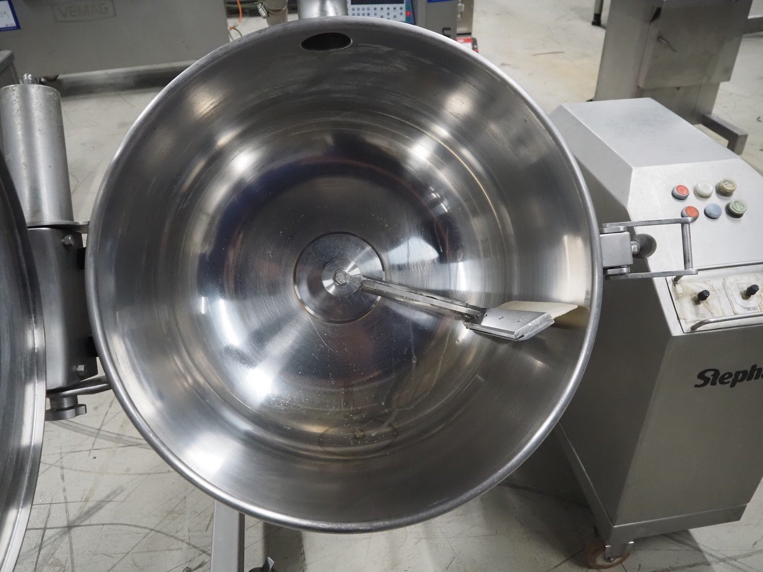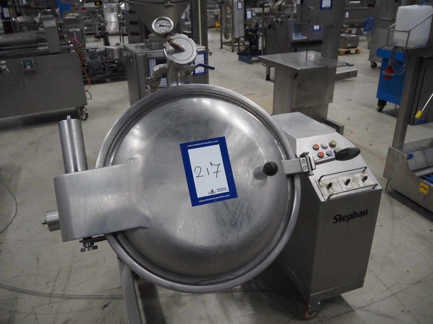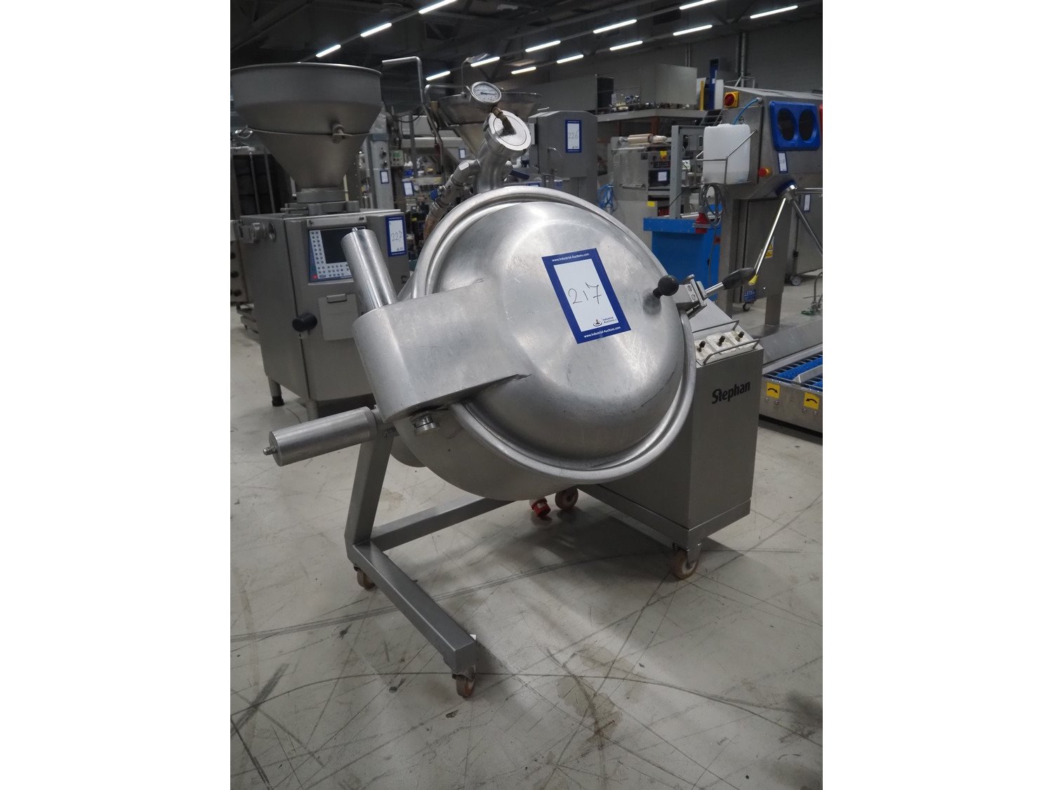 Stephan mobile vacuum mixer, type: VM 100, machine number: 718.949.01, year of construction: 1992, 380 V, 3 Ph, 50 Hz, 3.1 A, 1.1 kW, volume: 100 liter, dimensions: 1100 mm x 1400 mm x 1400 mm. Missing vacuum pump.