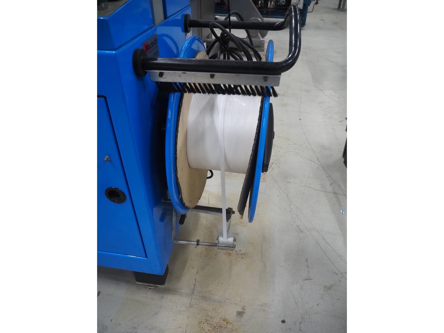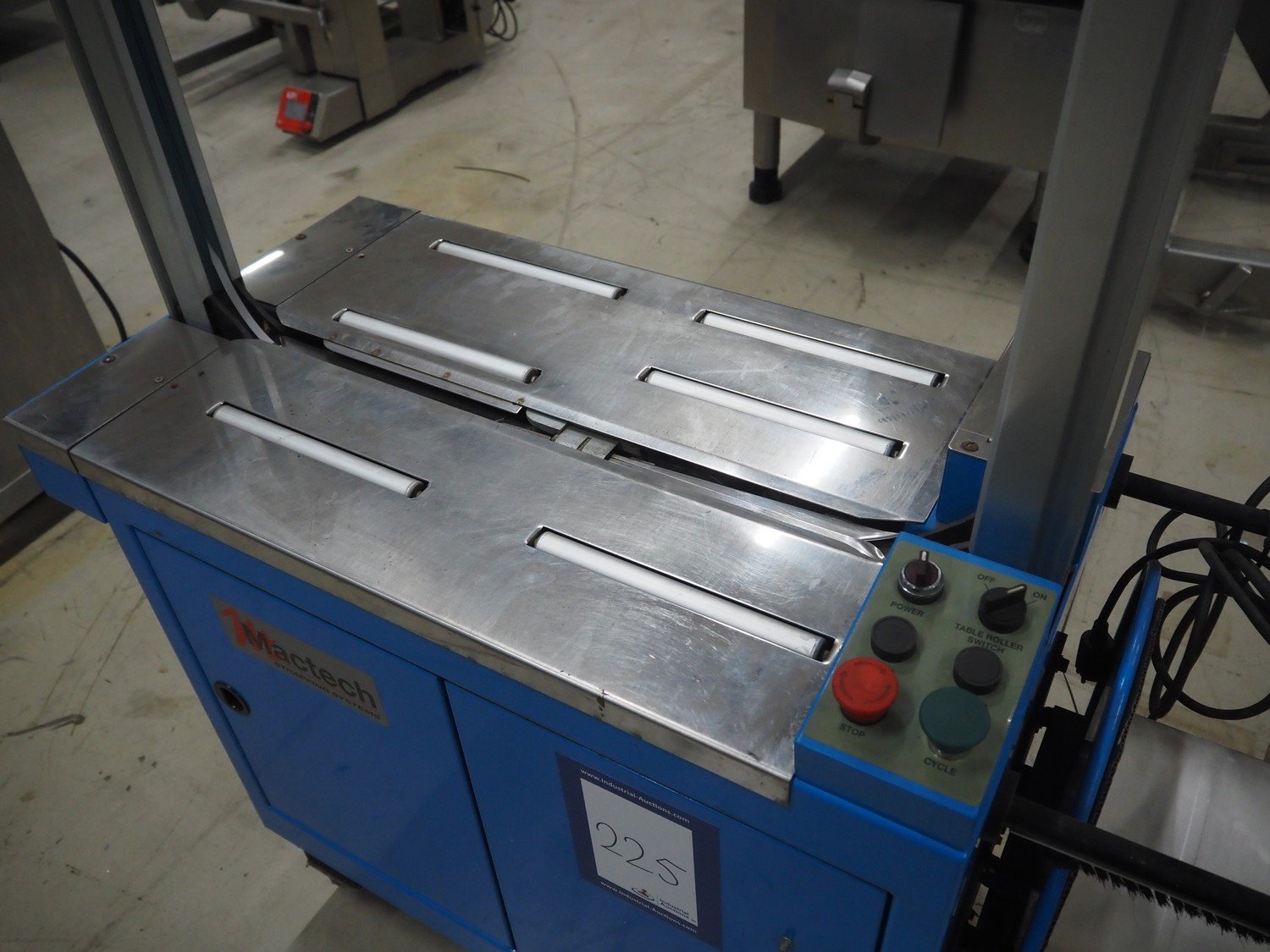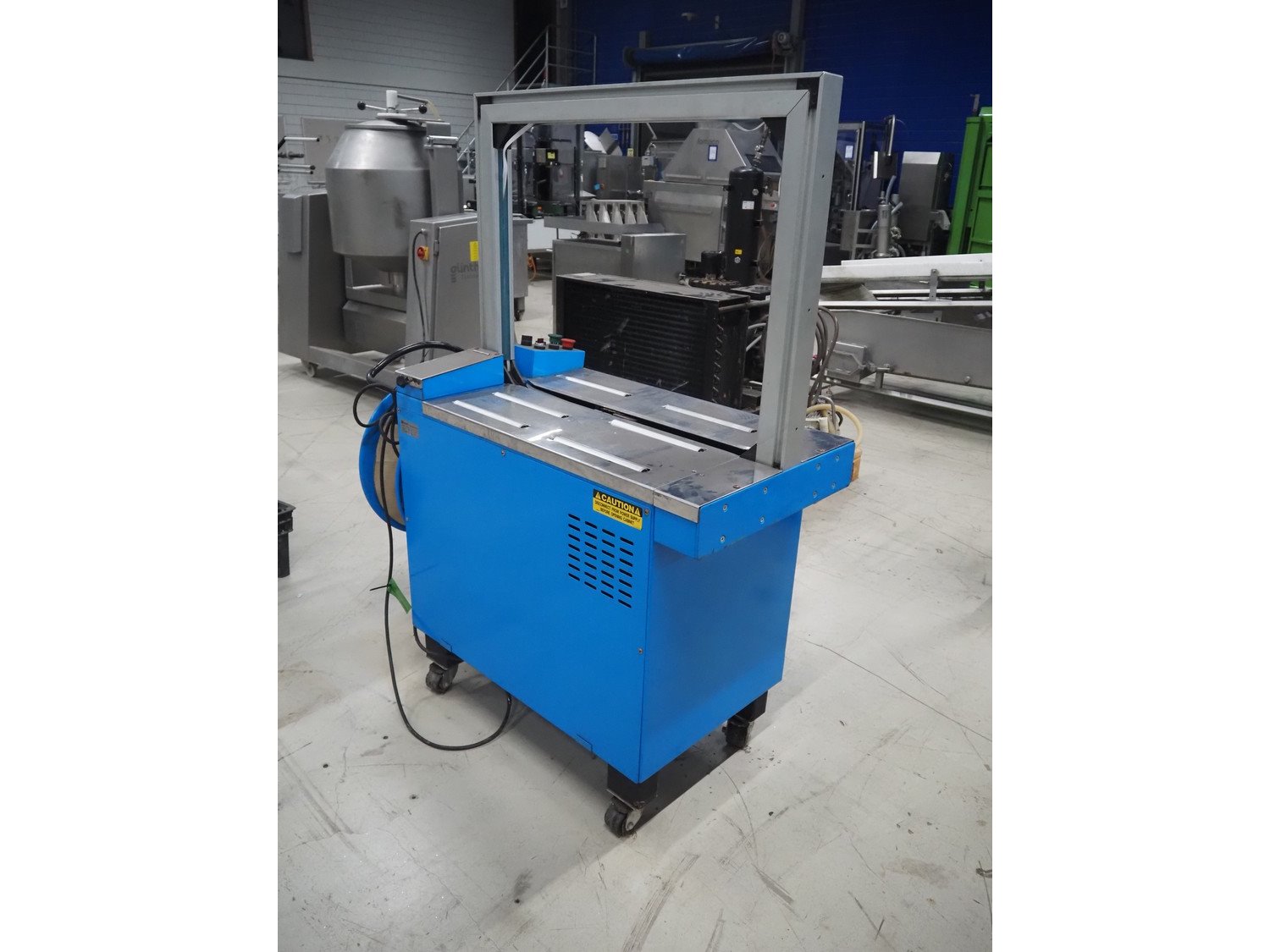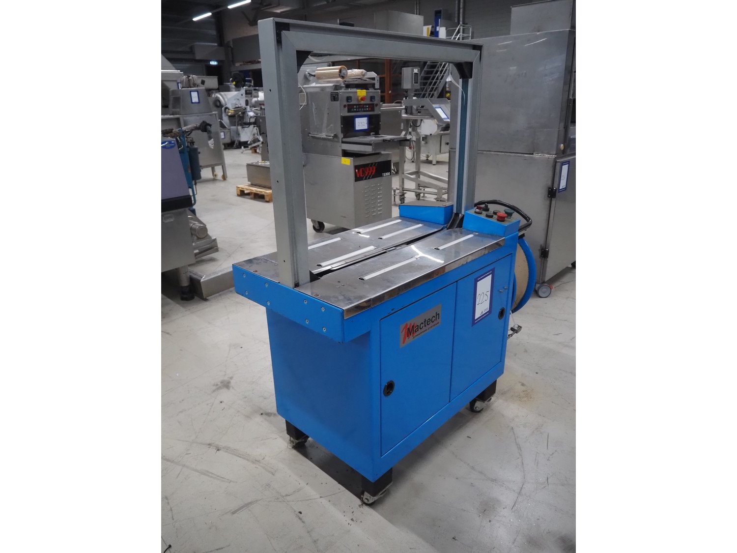 Mactech mobile strapping machine, type: MTZ600, number: 071950, year of construction: 1999, 230 V, 1 Ph, 50 Hz, clearance: 700 mm x 610 mm, total dimensions: 1260 mm x 520 mm x 1530 mm.