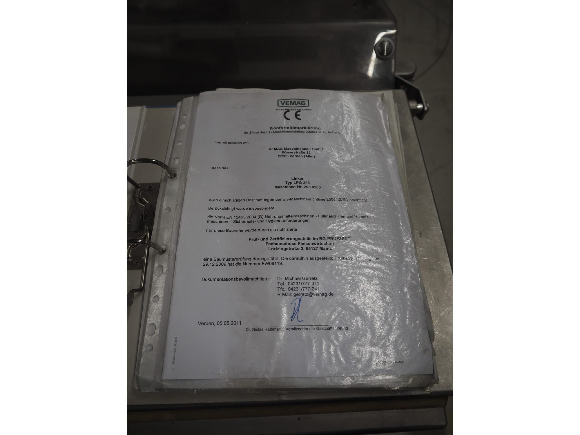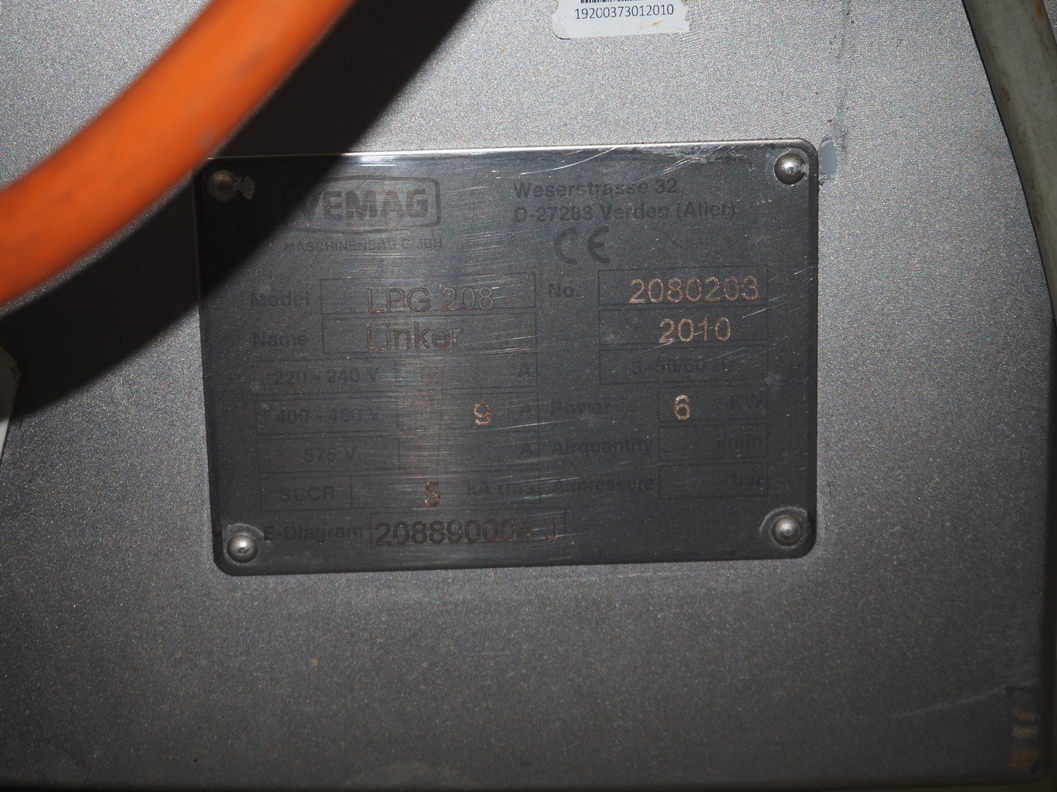 Vemag mobile linking machine, model: LPG208, number: 2080203, year of construction: 2010, 400-460 V, 3 Ph, 50-60 Hz, 9 A, 6 kW, dimensions: 1550 mm x 800 mm x 1330 mm. Without guide belts.