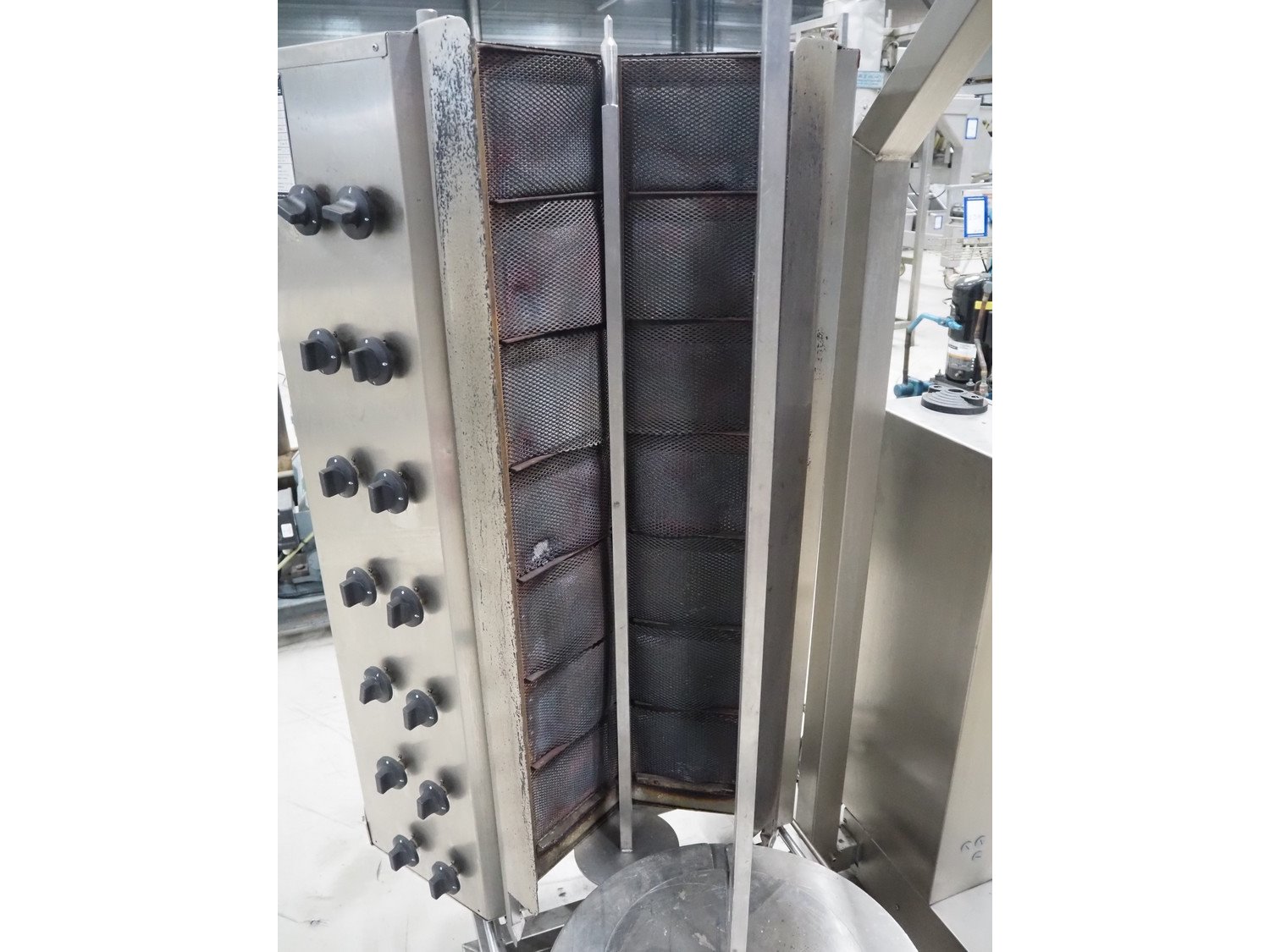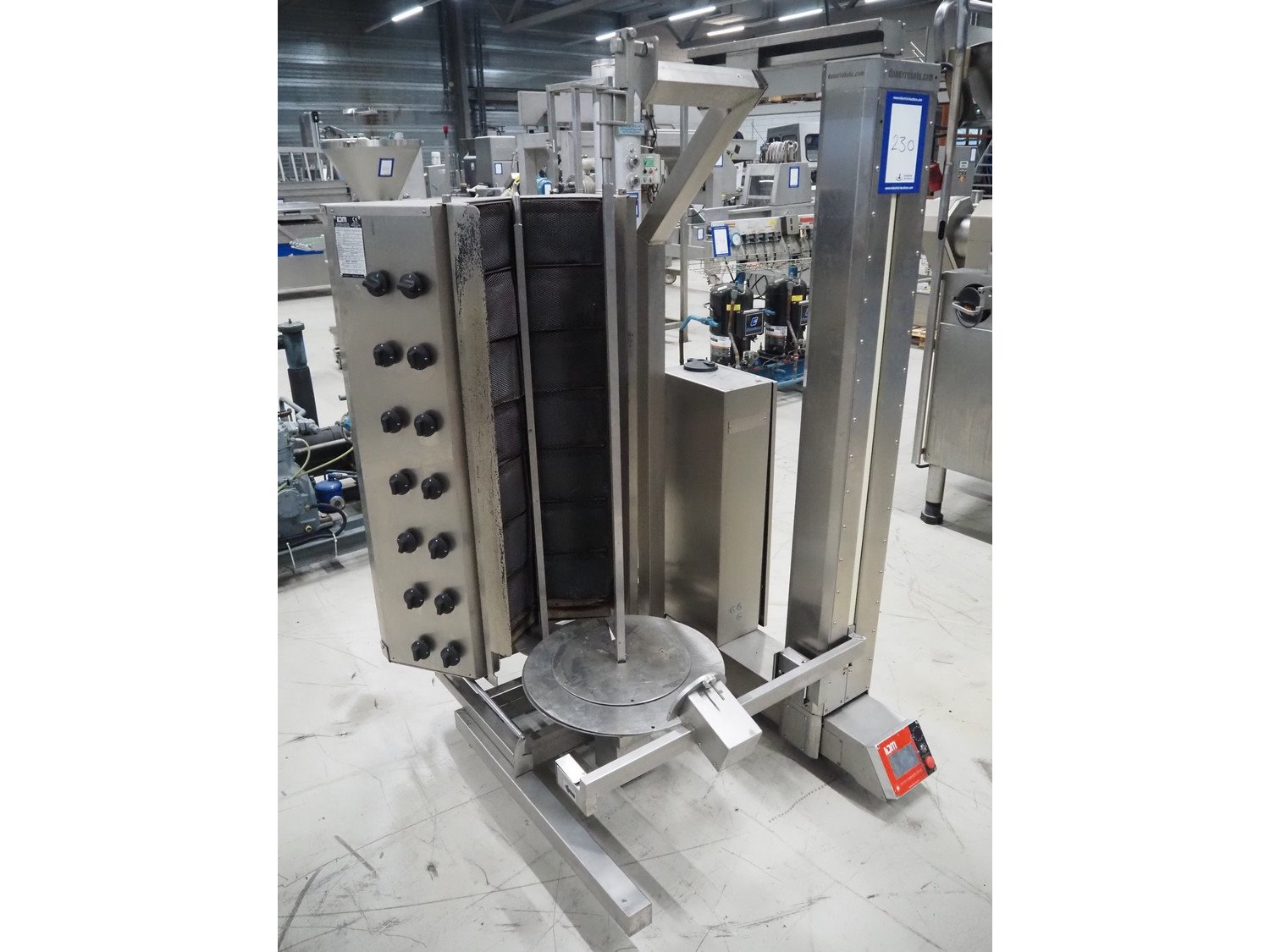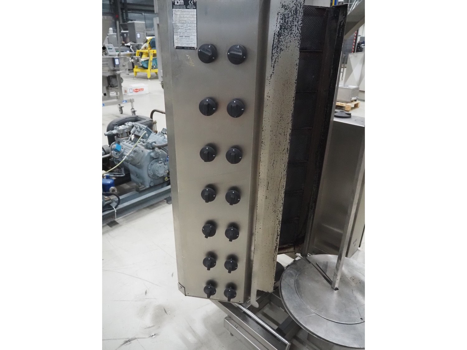 IDM kebab grill, model: IDM 2R07, serial number: 536, year of construction: 12/08/16, 220 V, 50/60 Hz, 2 A, 450 W, clearance: Ø 500 mm x 1100 mm, total dimensions: 1150 mm x 1100 mm x 1800 mm.