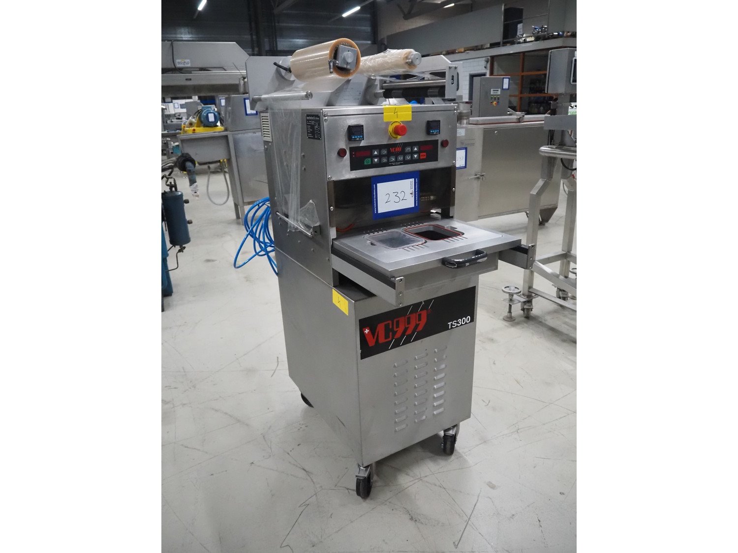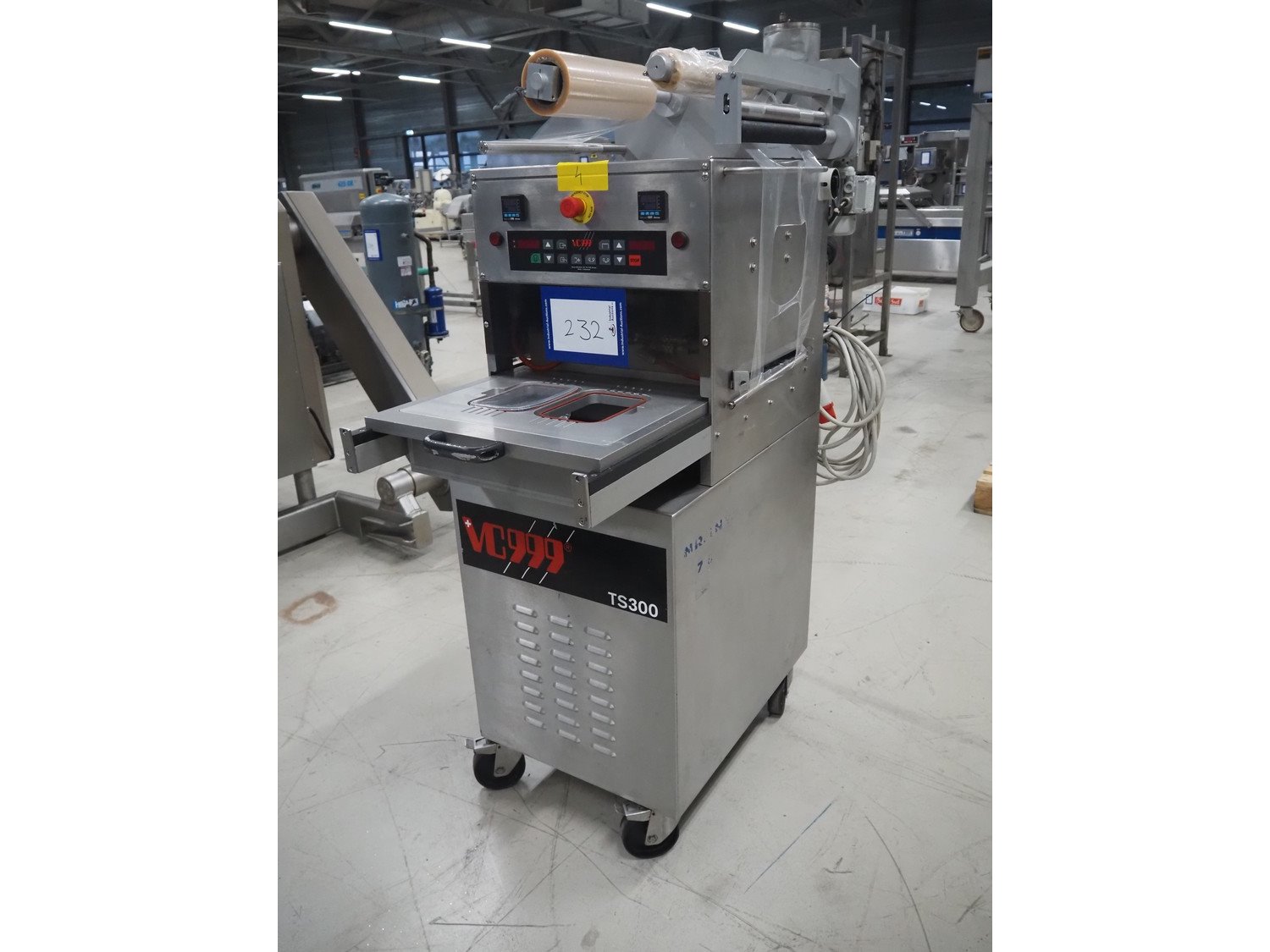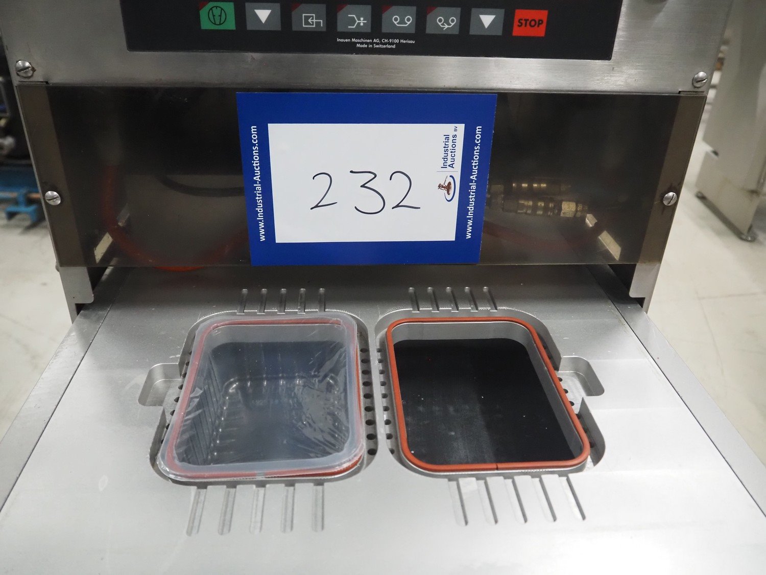 Inauen Maschinen AG mobile traysealer, model: VC999/TS 300 N, serial number: 0431133, 400 V, 3 Ph, 50 Hz, 16 A, dye: (2x) 185 mm x 135 mm, operating air pressure: 6–8 bar, Rietschle vacuum pump, type: VCA 40 (00), number: 602608440003, year of construction: 2004, capacity: 10 m³ per hour, total dimensions: 1120 mm x 600 mm x 1610 mm.