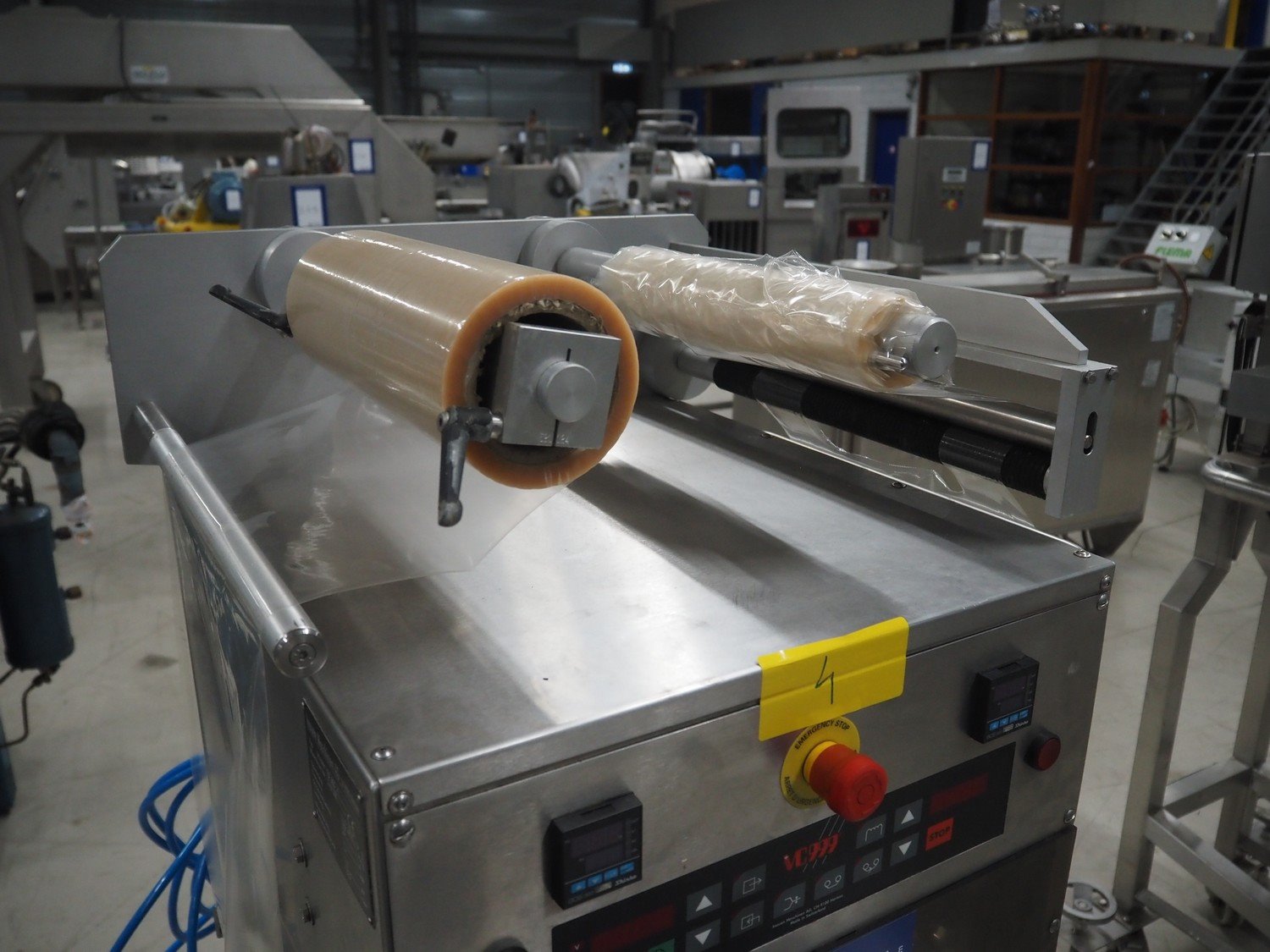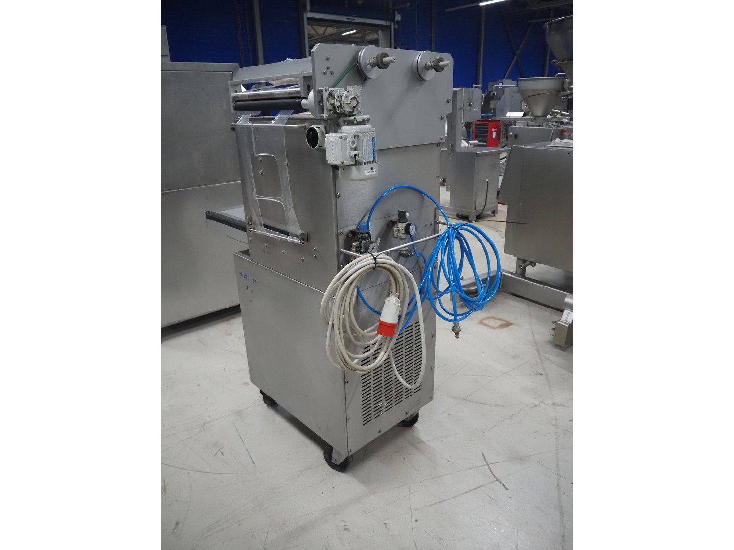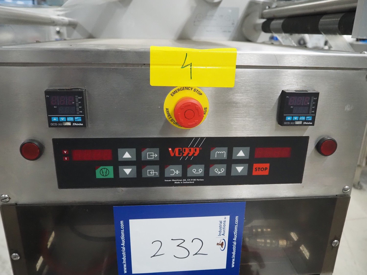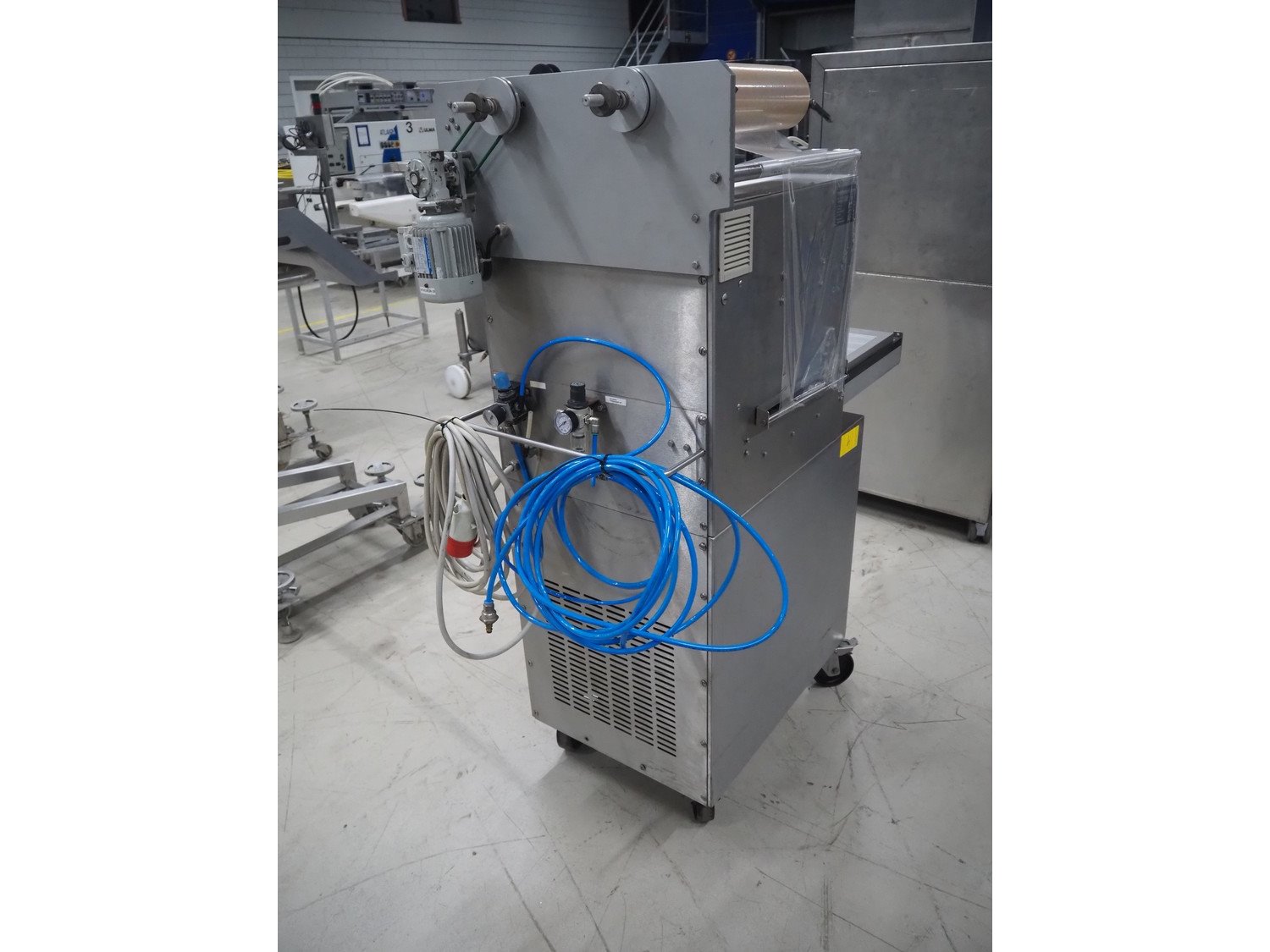 Inauen Maschinen AG mobile traysealer, model: VC999/TS 300 N, serial number: 0431133, 400 V, 3 Ph, 50 Hz, 16 A, dye: (2x) 185 mm x 135 mm, operating air pressure: 6–8 bar, Rietschle vacuum pump, type: VCA 40 (00), number: 602608440003, year of construction: 2004, capacity: 10 m³ per hour, total dimensions: 1120 mm x 600 mm x 1610 mm.