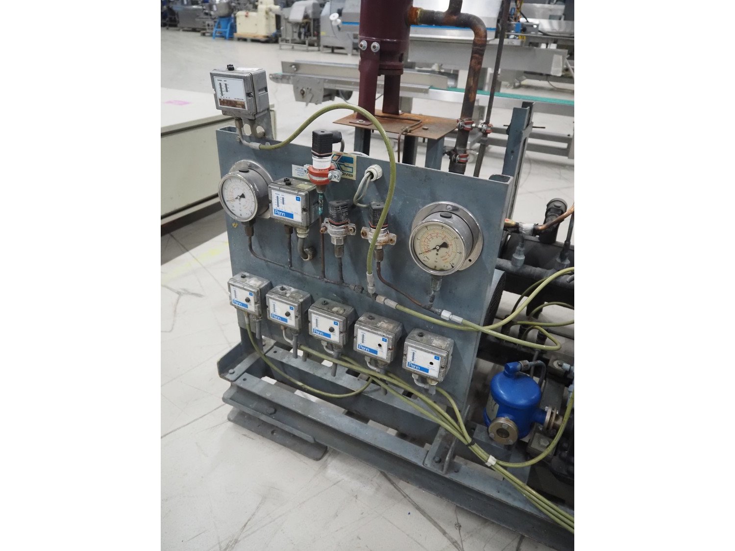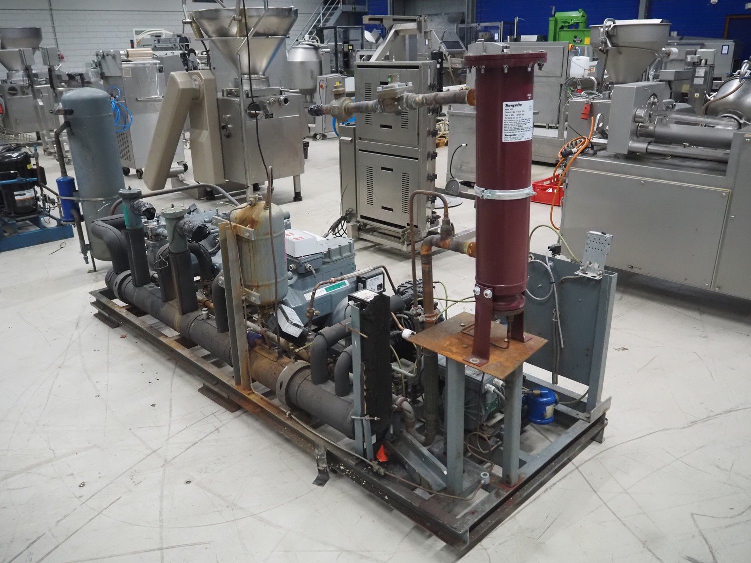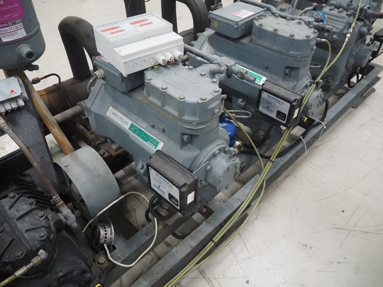 DWM Copeland compressor rack consisting of: 4 DWM Copeland cooling compressor type: (1x) D4DH3-2500-EWM, capacity: 70.9 m³ per hour, (1x) D3DC5-100X-AWM/D, capacity: 38 m³ per hour, (1x) D3DA5-75X-AWM/D, capacity: 32.2 m³ per hour, (1x) DKSJP-15X-EWL, capacity: 6.33 m³ per hour, dimensions compressor rack: 3150 mm x 1100 mm x 1400 mm, dimensions pressure vessel: 480 mm x 480 mm x 1450 mm, dimensions switch cabinet: 1680 mm x 420 mm x 2200 mm.