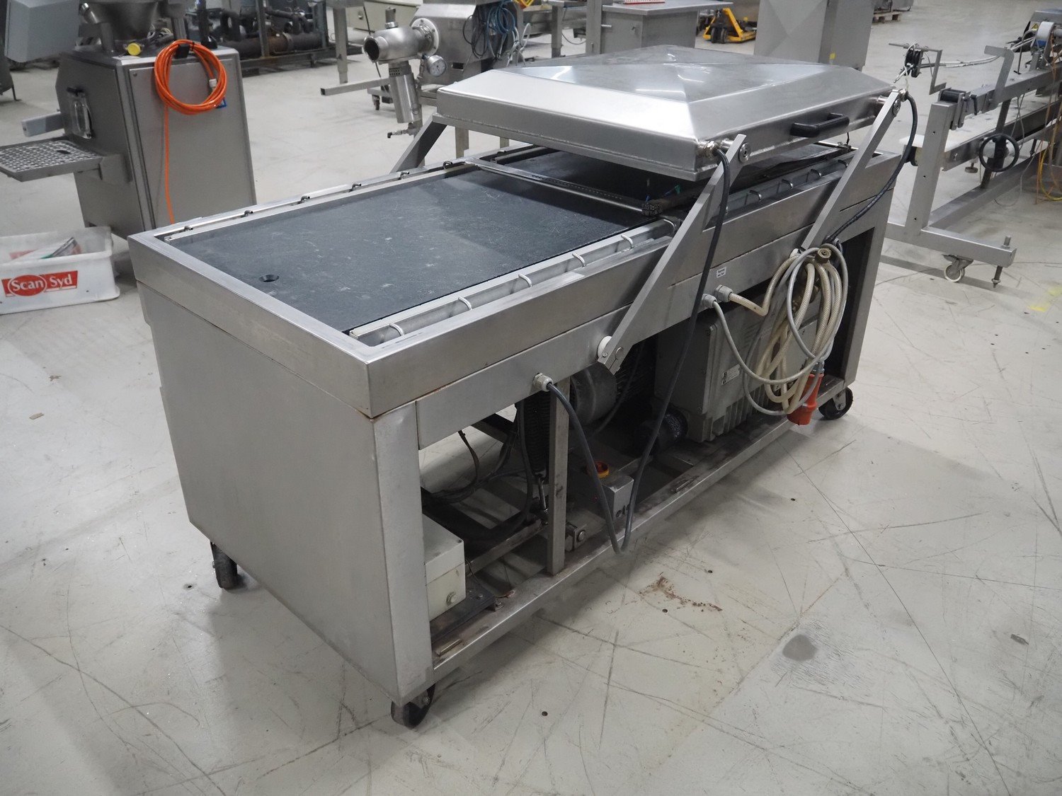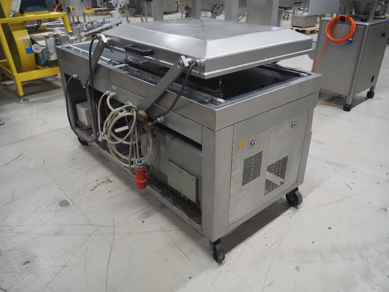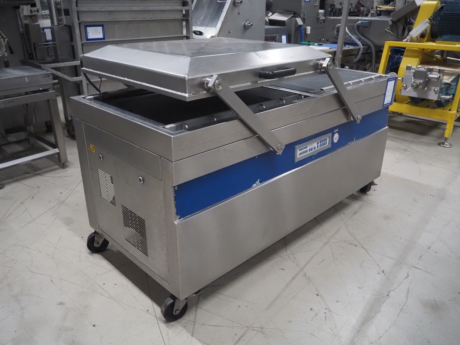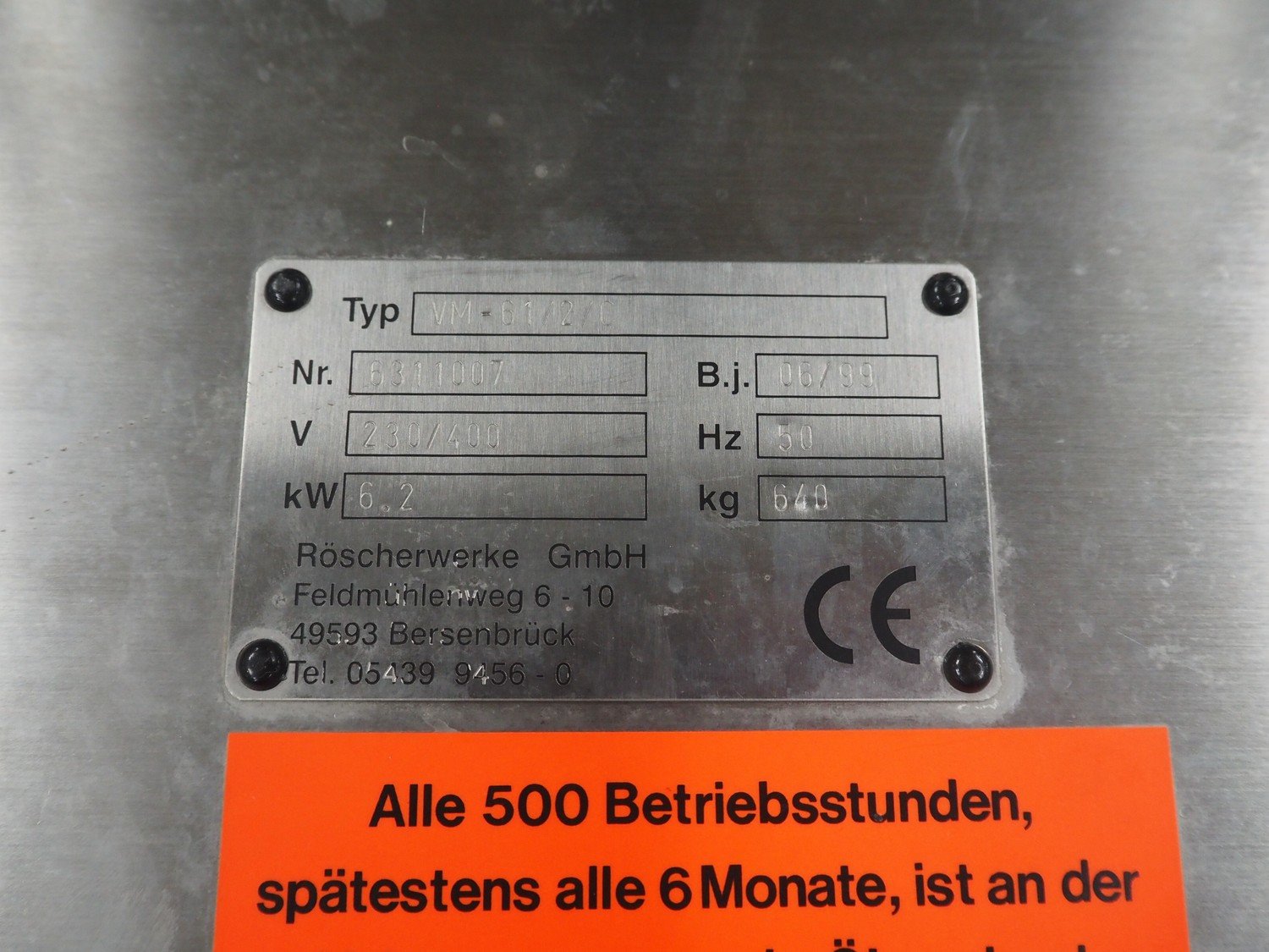 Röscherwerke GmbH mobile double chamber vacuum machine, type: VM-61/2/C, number: 6311007, year of construction: 06/99, 230/400 V, 50 Hz, 6.2 kW, weight: 640 kg, seal length: (4x) 860 mm, chamber: (2x) 880 mm x 640 mm, Busch vacuum pump, type: RA 0250 D 561 QMZZ, number: C9920000012, capacity: 250 m³ per hour, total dimensions: 1950 mm x 920 mm x 1100 mm.