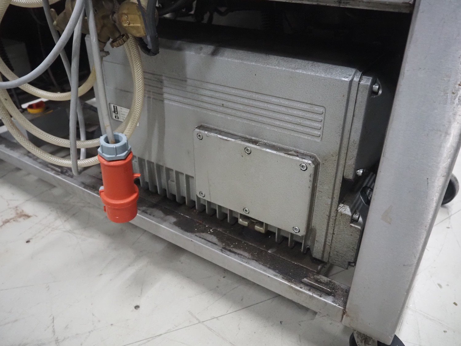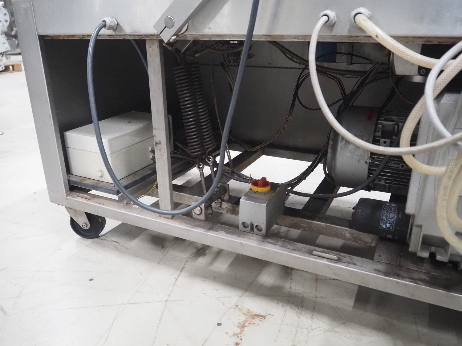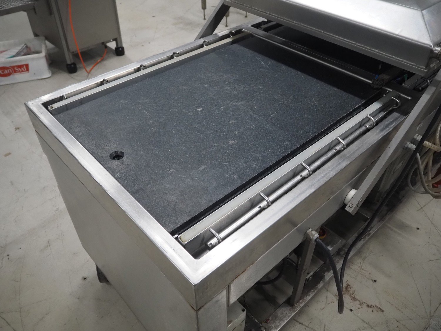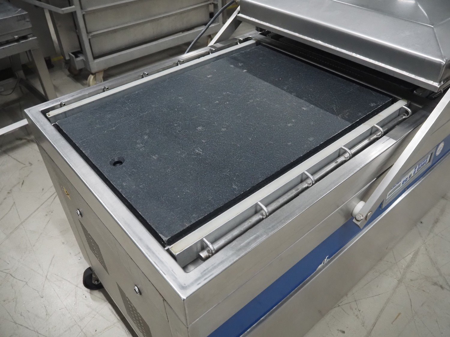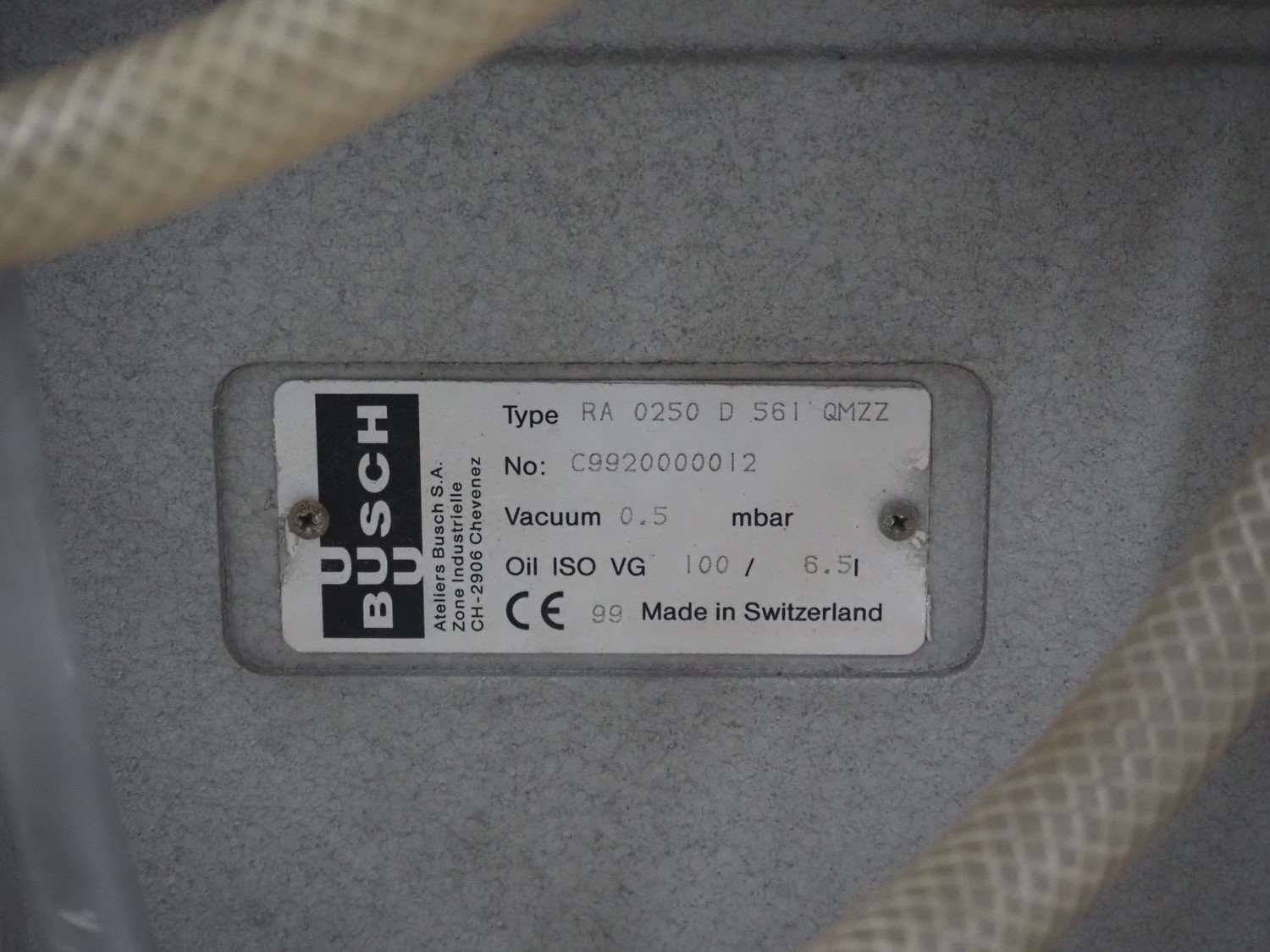 Röscherwerke GmbH mobile double chamber vacuum machine, type: VM-61/2/C, number: 6311007, year of construction: 06/99, 230/400 V, 50 Hz, 6.2 kW, weight: 640 kg, seal length: (4x) 860 mm, chamber: (2x) 880 mm x 640 mm, Busch vacuum pump, type: RA 0250 D 561 QMZZ, number: C9920000012, capacity: 250 m³ per hour, total dimensions: 1950 mm x 920 mm x 1100 mm.